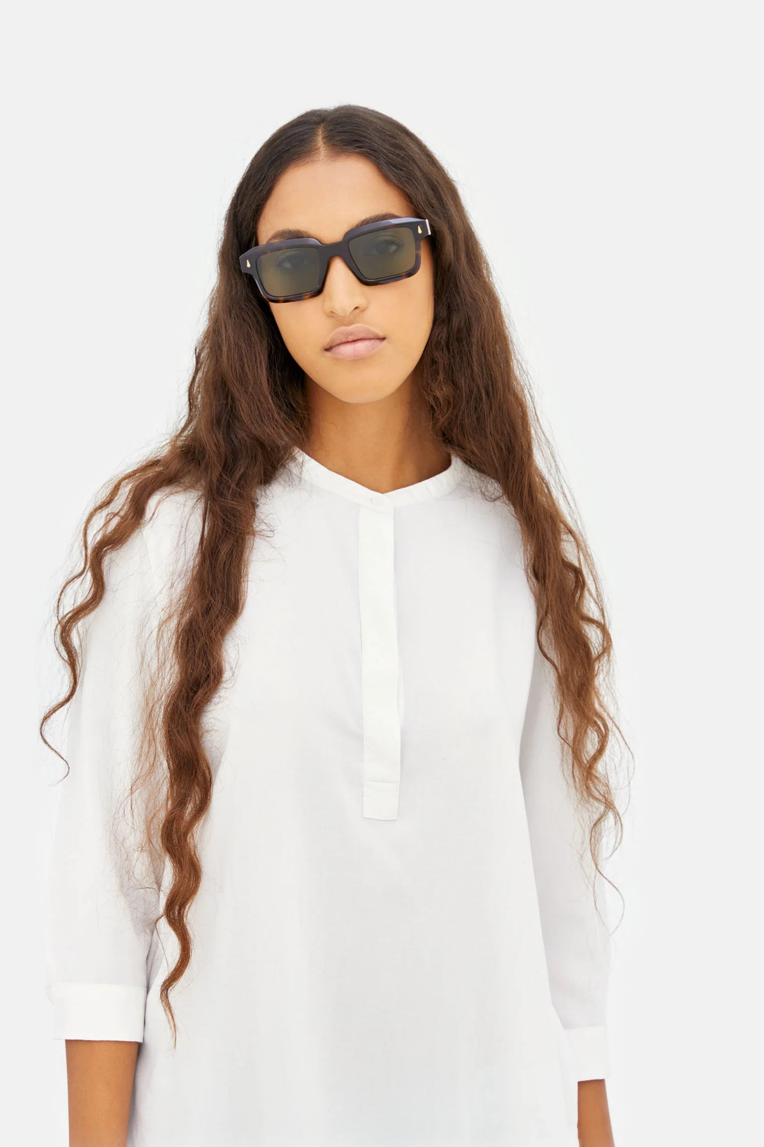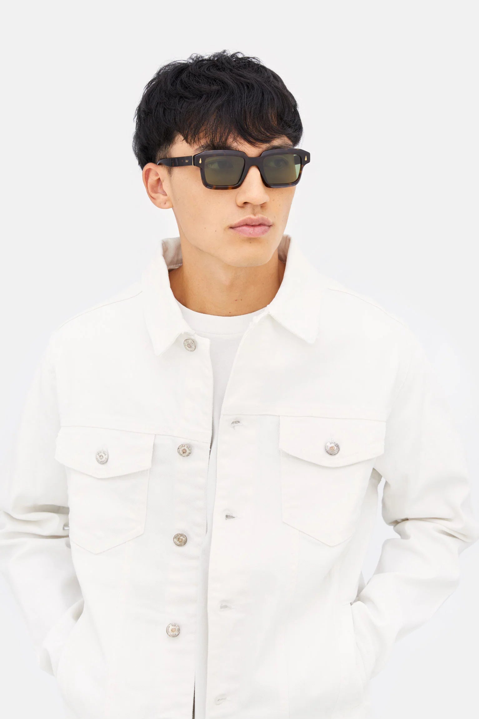 Angular, chunky and bold, Giardino is a unique frame with a determined, precise shape. Characterised by wide rectangular lenses, the model is a reinterpretation of 1950s silhouettes, updated with an emphasis on sculpted acetate rims and essential geometries. This version comes in a vibrant 3627 Havana acetate with bottle green lenses and gold decors.