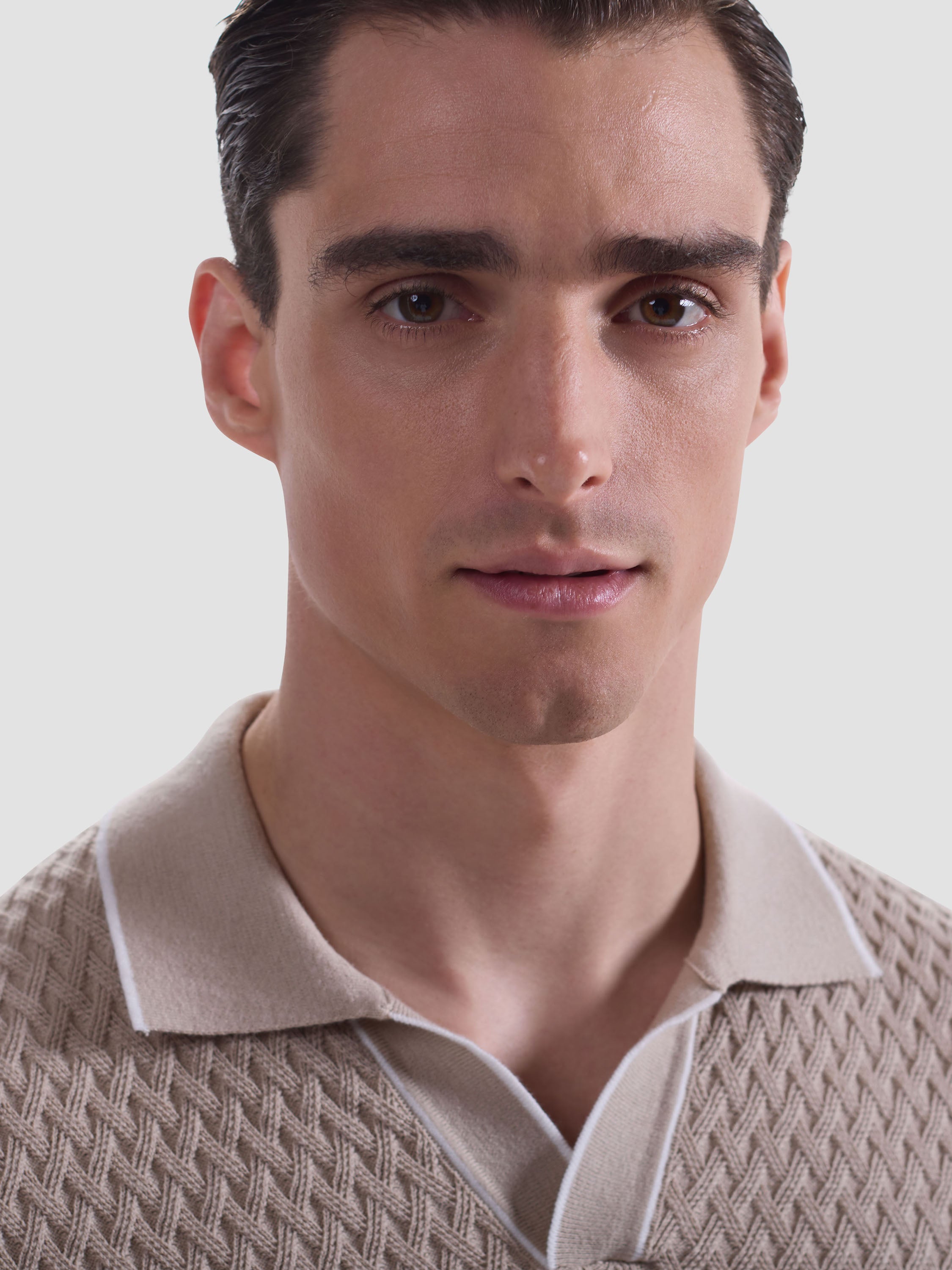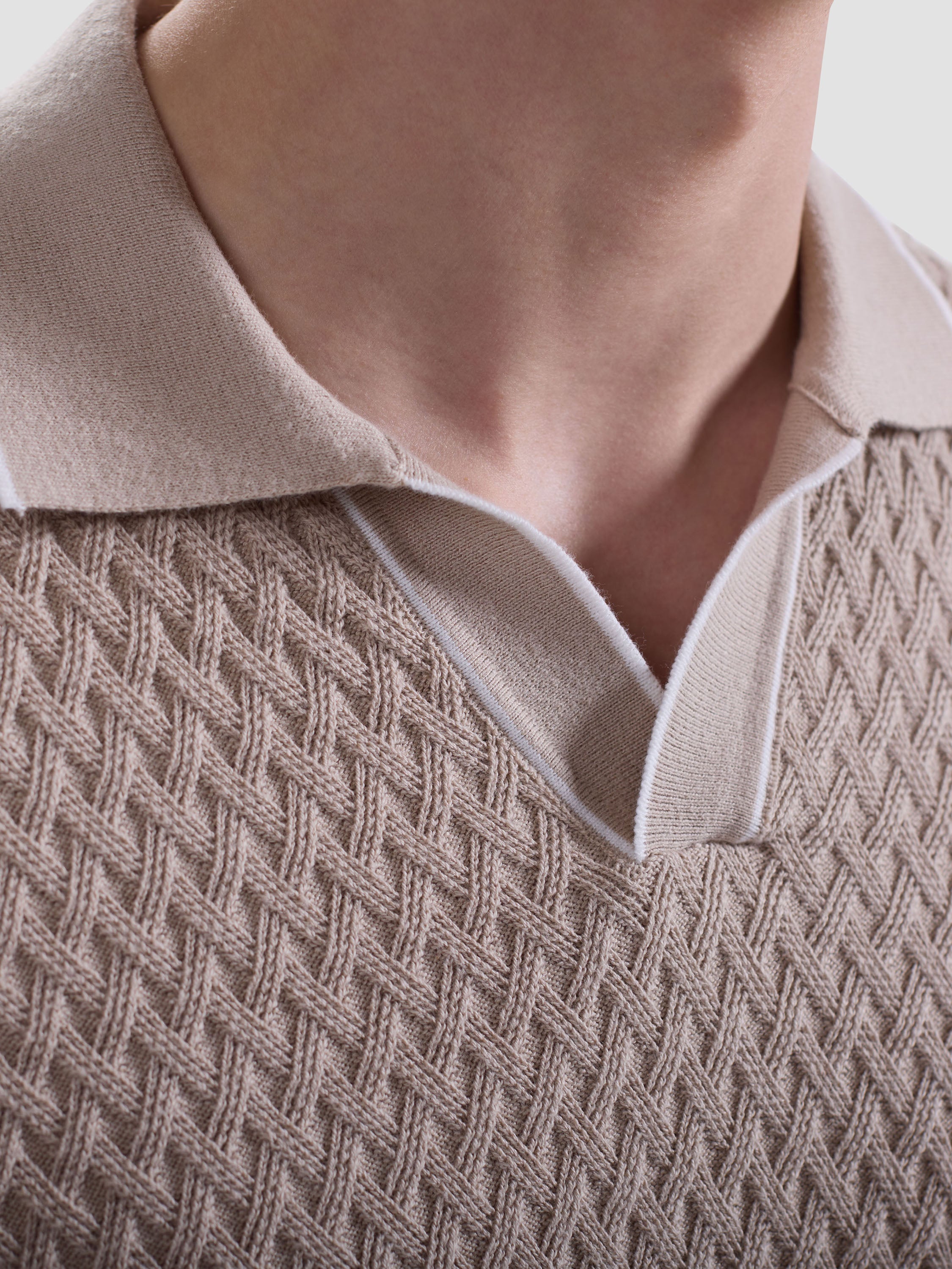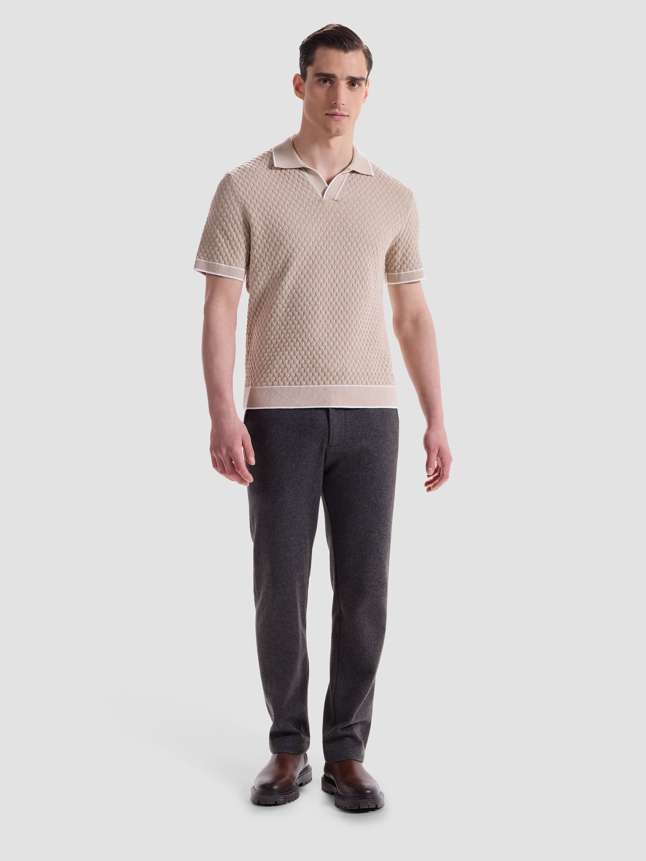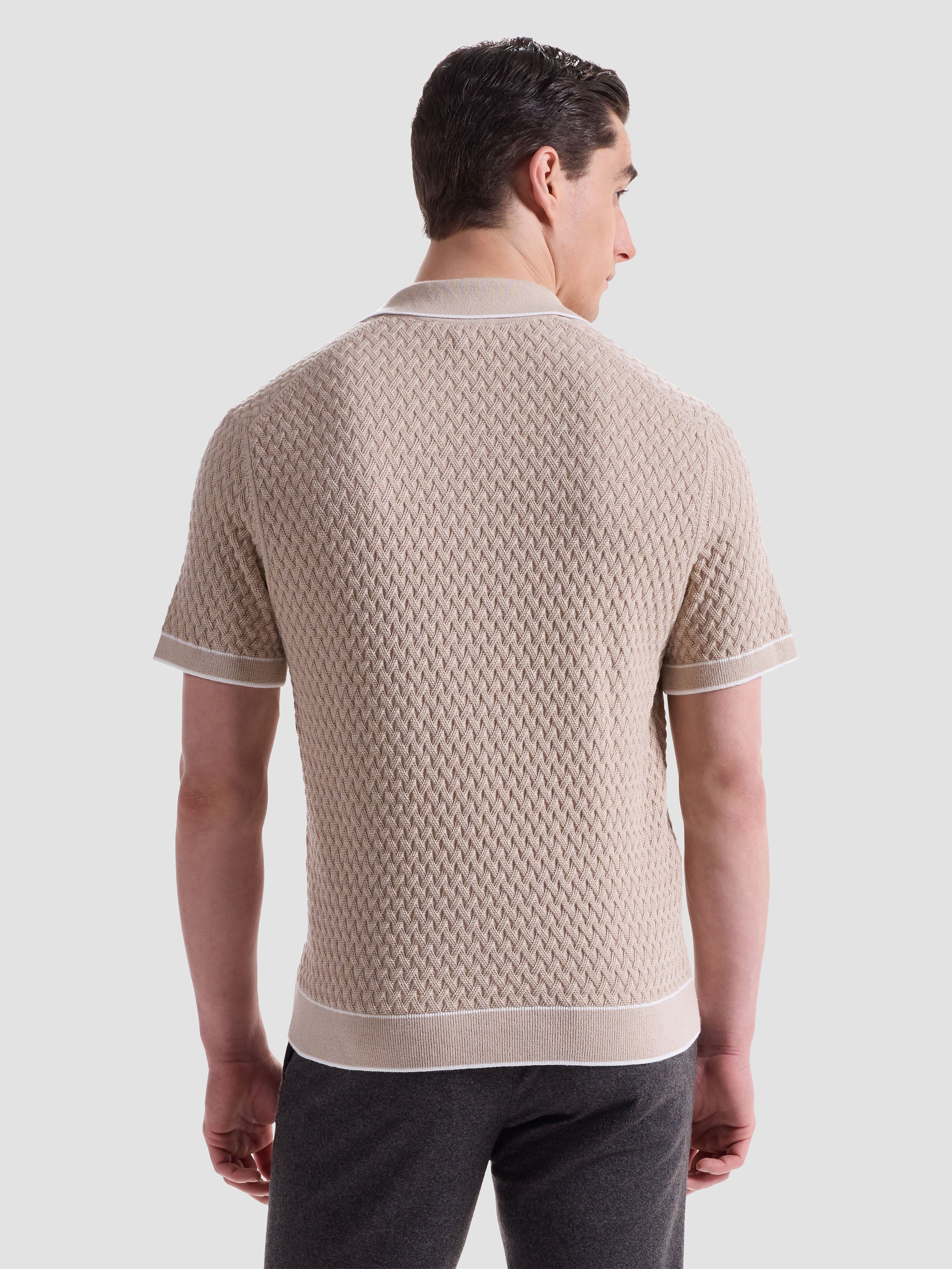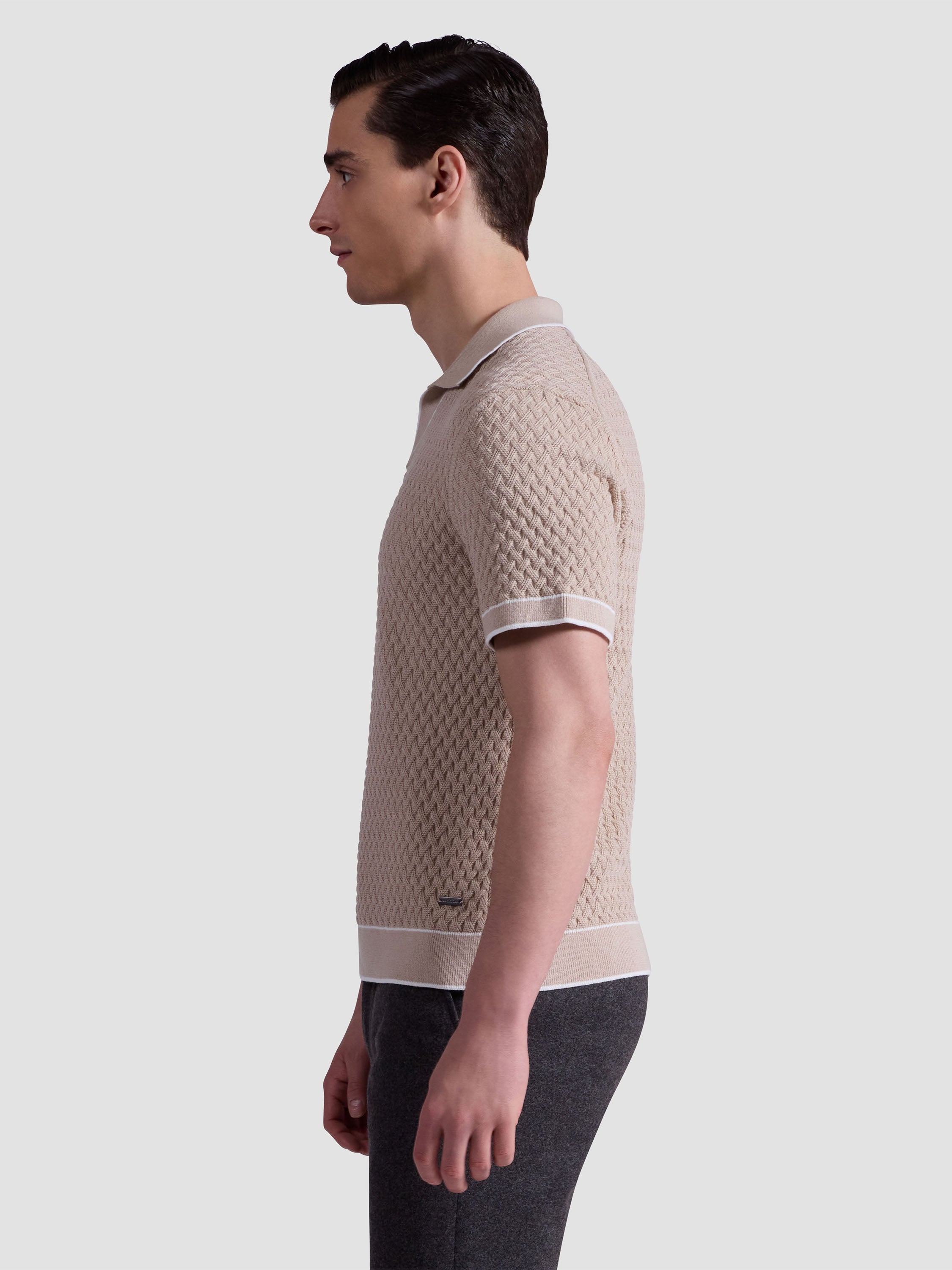 This Johnny collar short-sleeve polo is crafted from a comfortable polyester-cotton-linen blend and features a unique mixed media pattern, complemented by a solid contrast collar and cuffs with contrast tipping detail. Side vents ensure ease of movement and breathability, making it perfect for warm days. This stylish polo is an essential addition to your collection, perfect for both relaxed weekends and casual outings.