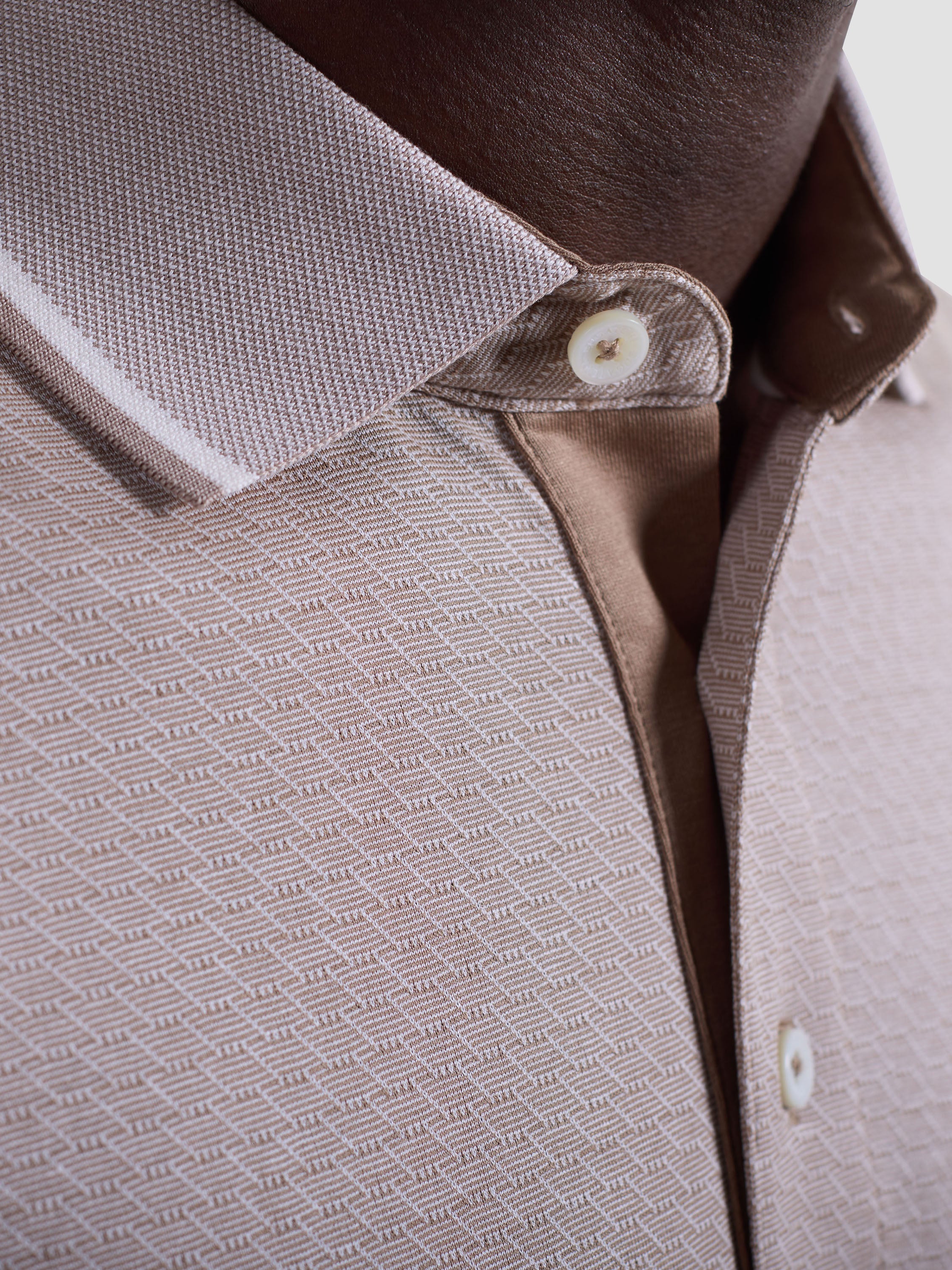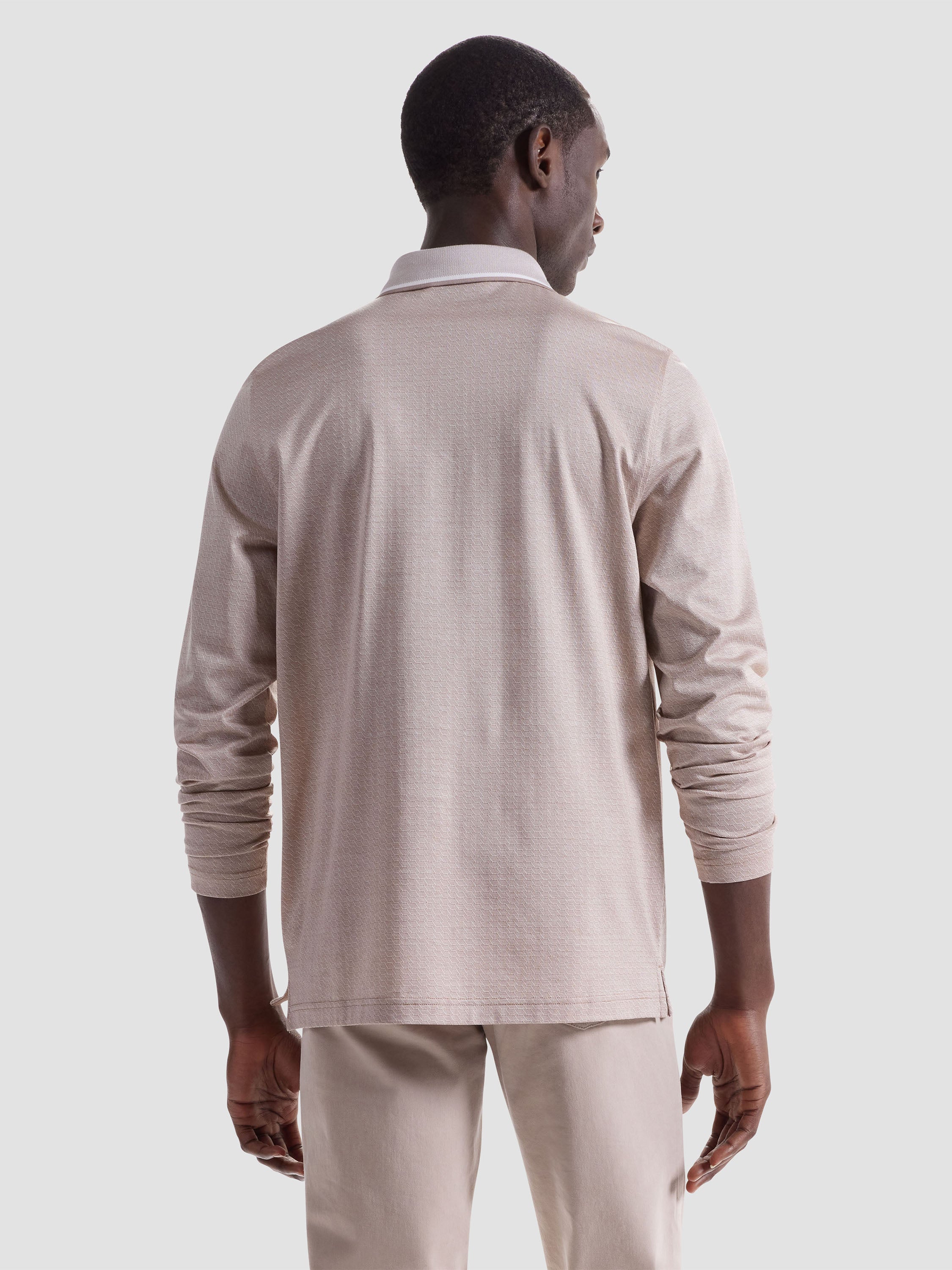 Crafted from 100% mercerized cotton, this long sleeve polo showcases a sophisticated geometric jacquard pattern and a bird's eye rib collar with double stripe contrast detail. Finished with a straight hem, straight cuffs, a three-button placket and mother-of-pearl buttons, for a clean, modern look.
