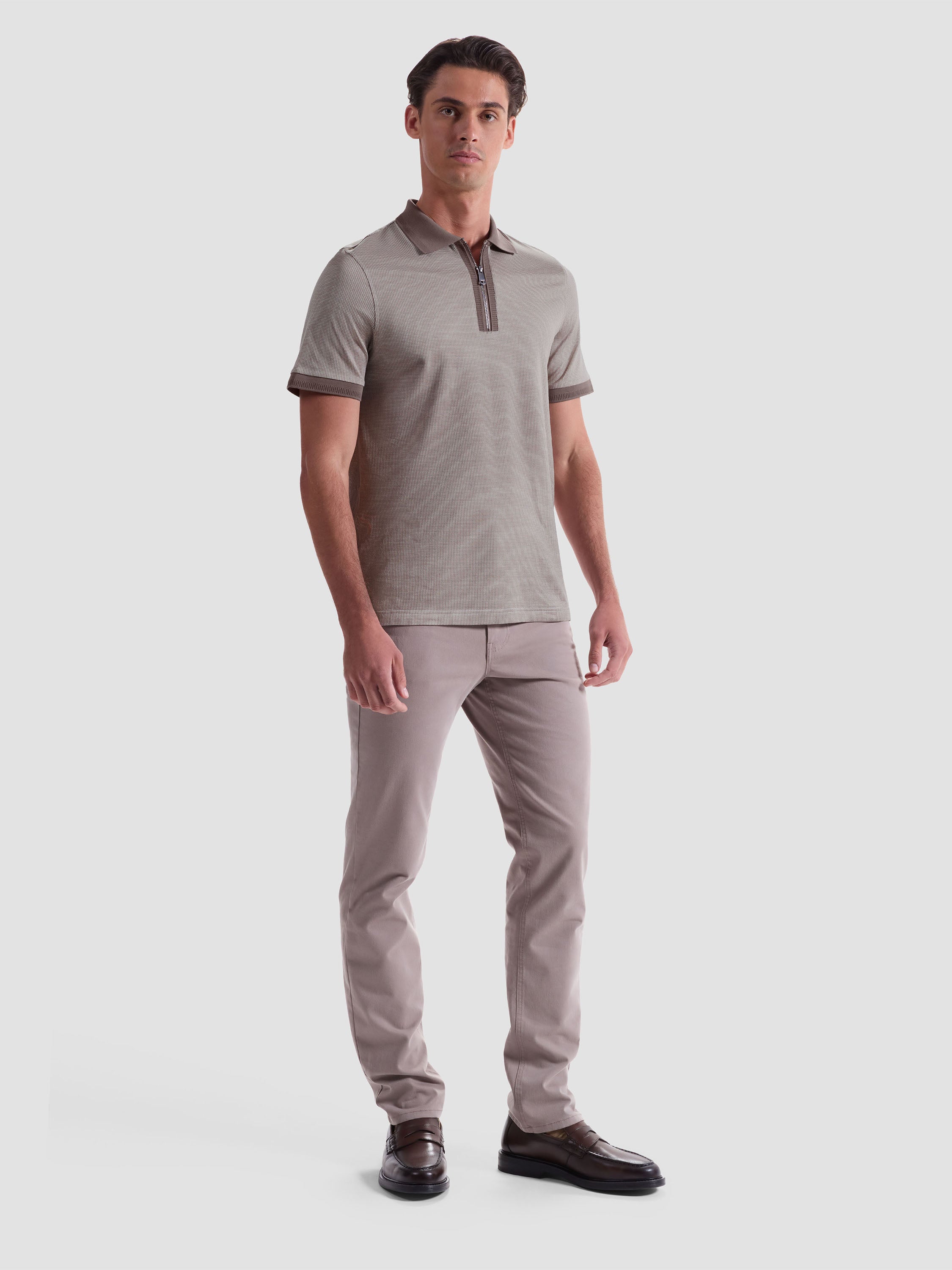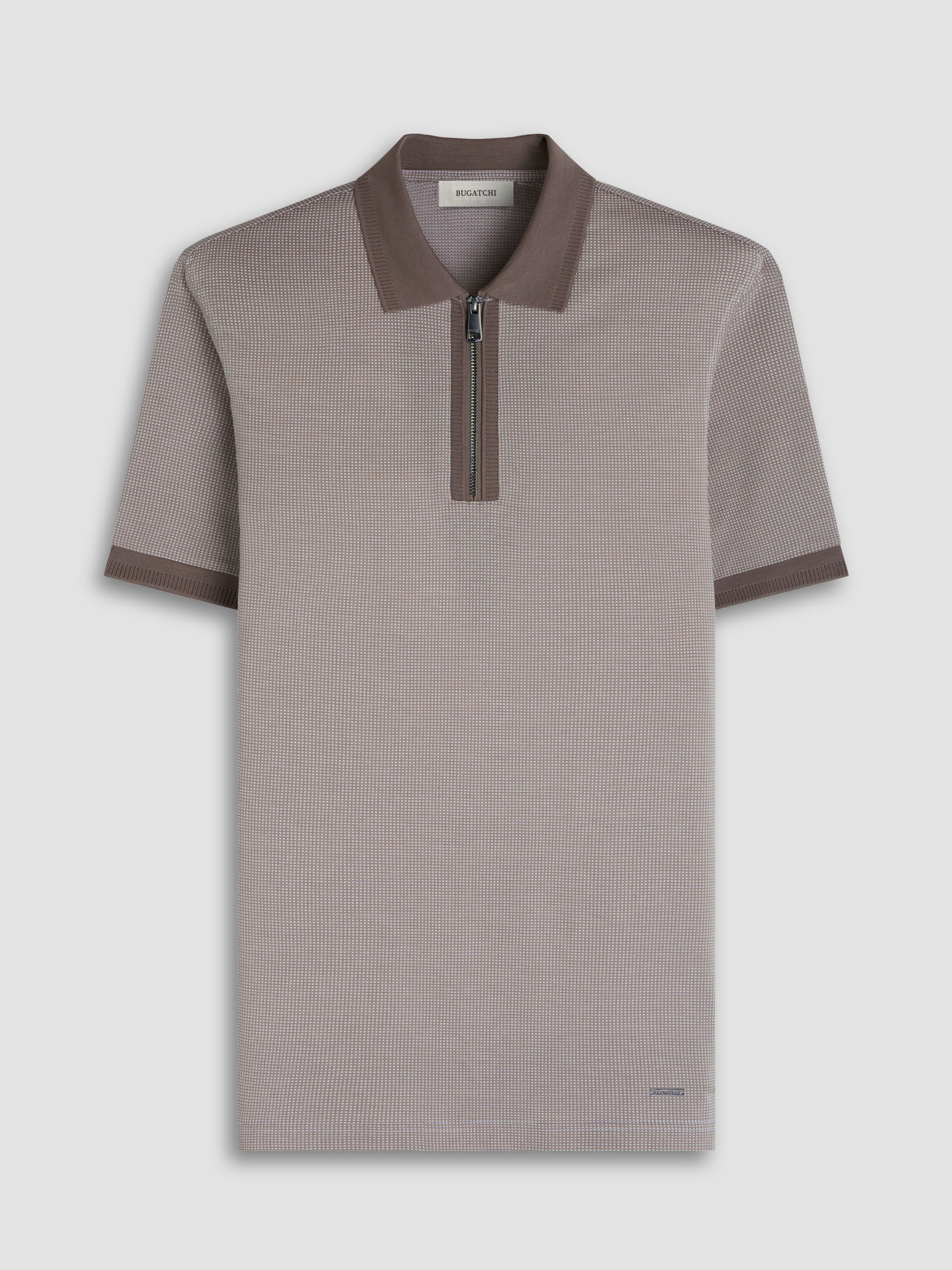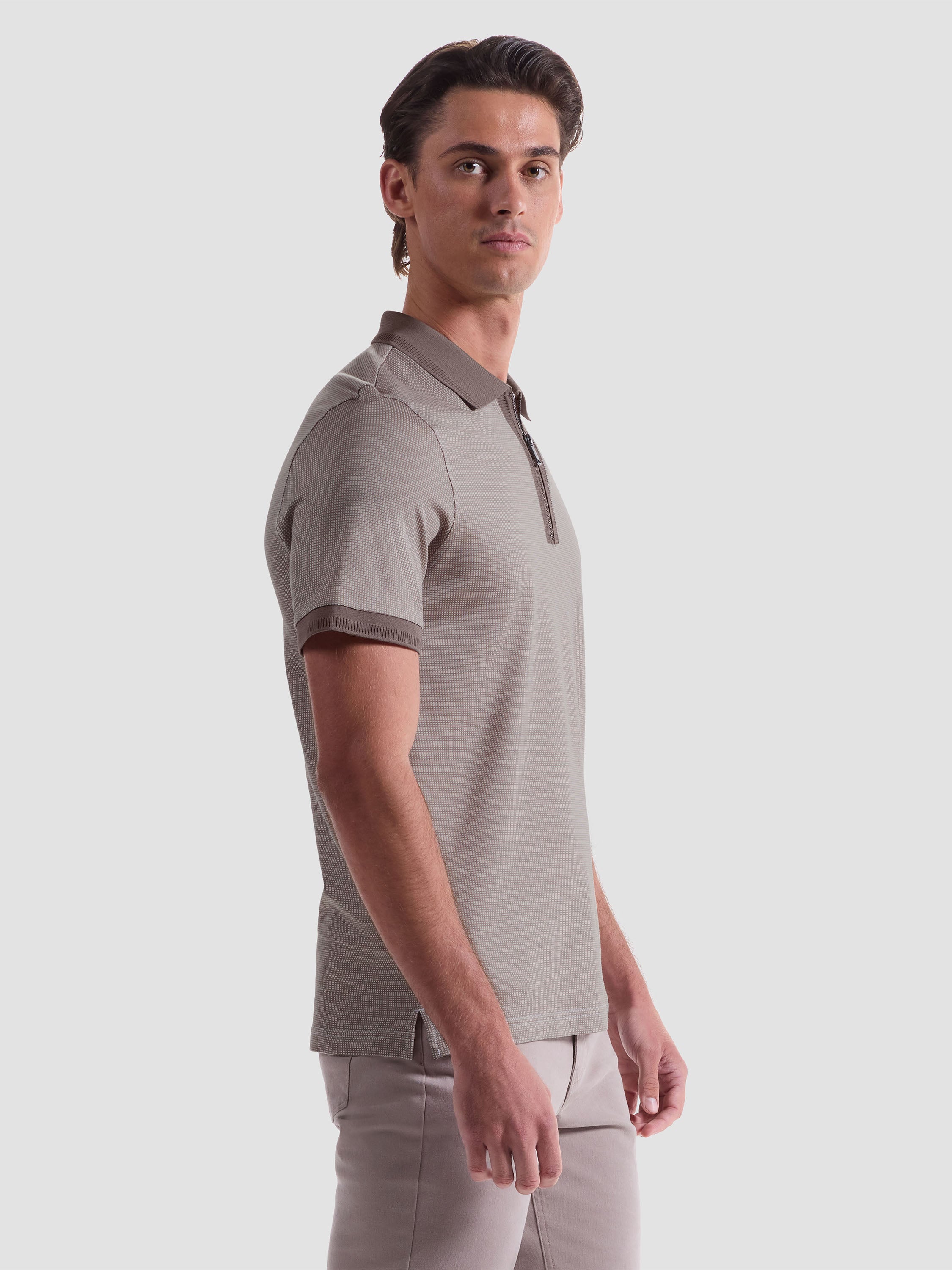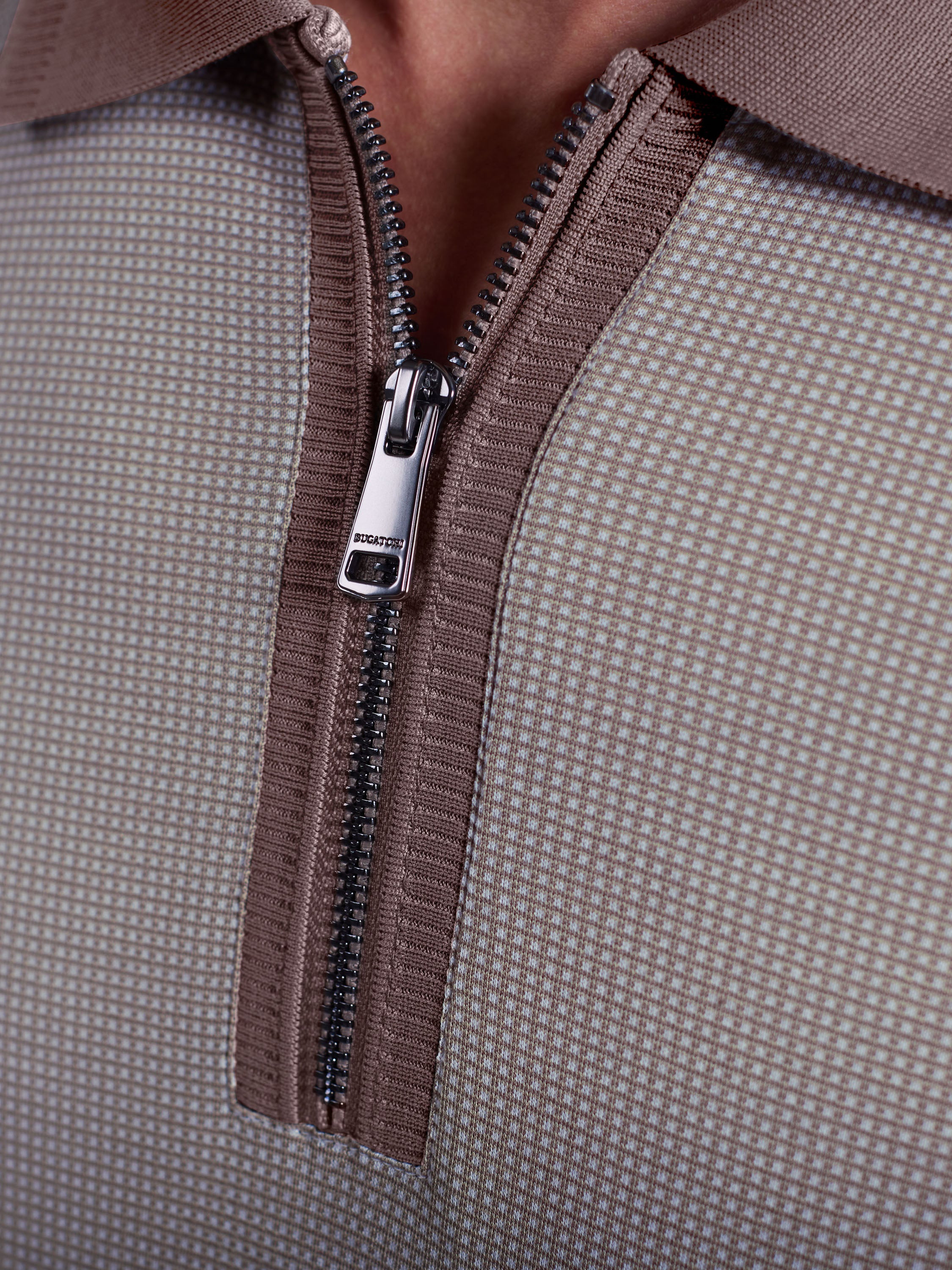 Crafted from 100% mercerized cotton, this short sleeve quarter zip polo features a refined pin check pattern with a solid ribbed collar, cuffs, and zipper placket enhanced by tuck stitch detailing. Designed for a polished yet casual look, it is a versatile piece that moves effortlessly from the golf course to casual occasions.