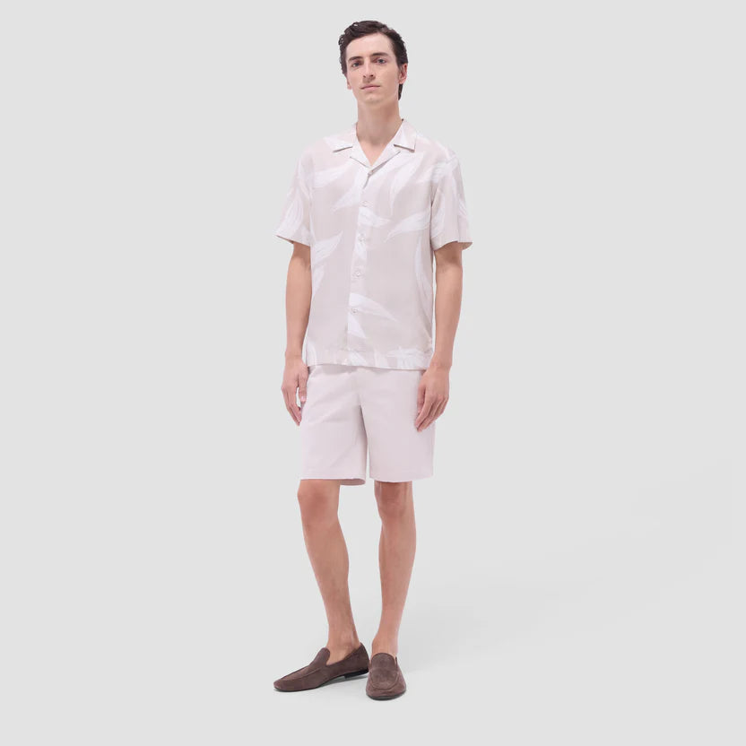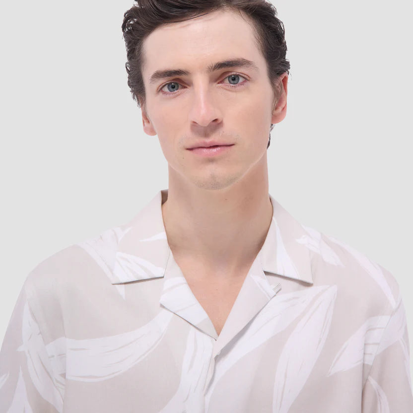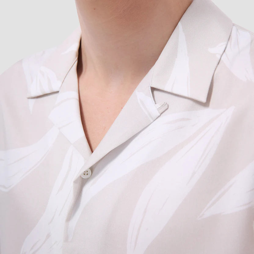 The Jackson short-sleeve camp collar shirt in leaf print is crafted from 100% Tencel, a premium eco-friendly lyocell fabric known for its soft drape and natural breathability. It features mother-of-pearl buttons and a straight hem that adds a clean finish, making it perfect for both laid-back and more polished looks. A versatile addition to any wardrobe for warm-weather days and beyond, and exceptional comfort without compromise.