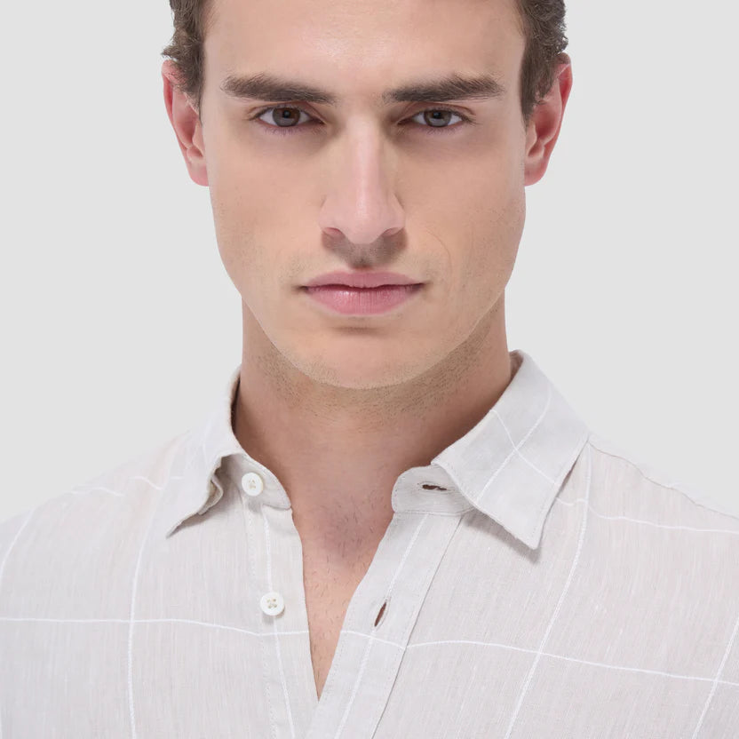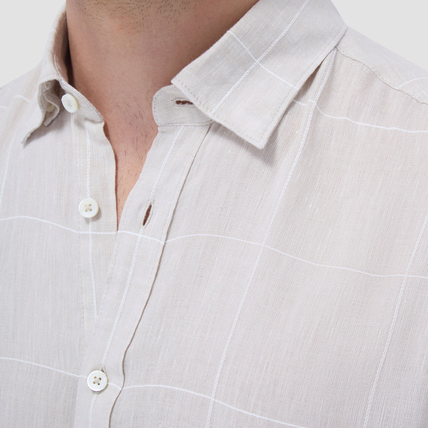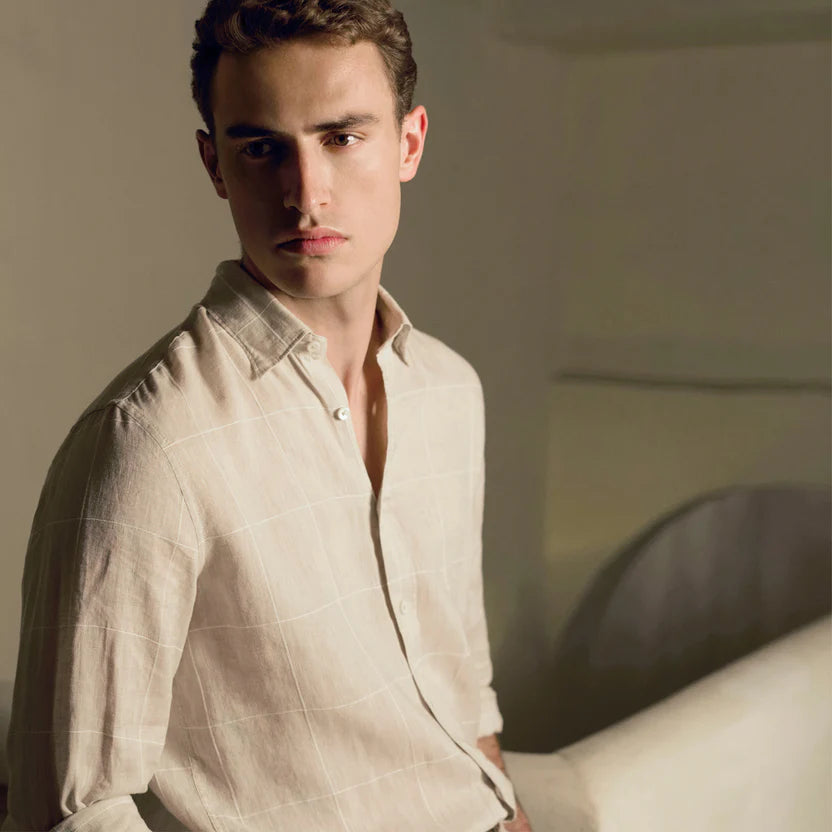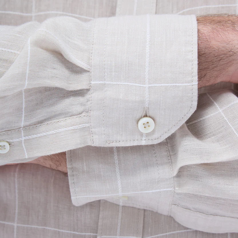 The Karl long-sleeve shirt in windowpane check is crafted from linen with a hint of cotton for softness. It features hidden button-down collar, a curved hem that can be worn tucked or untucked, and notched cuffs adjustable for a custom fit-wear them snug or loose. The combination of both fibers balances the crispness of linen with the softness and resilience of cotton to create a comfortable shirt perfect for any occasion.