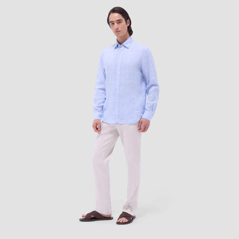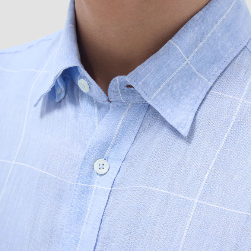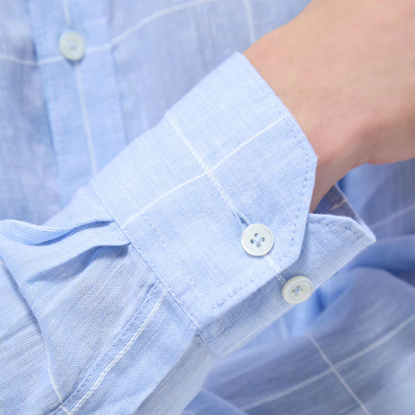The Karl long-sleeve shirt in windowpane check is crafted from linen with a hint of cotton for softness. It features hidden button-down collar, a curved hem that can be worn tucked or untucked, and notched cuffs adjustable for a custom fit-wear them snug or loose. The combination of both fibers balances the crispness of linen with the softness and resilience of cotton to create a comfortable shirt perfect for any occasion.