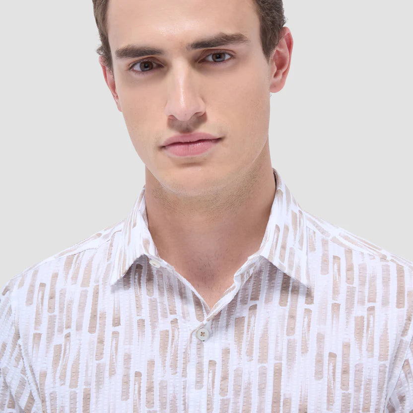 The Orson short-sleeve shirt in abstract paint stroke print is crafted from 100% cotton seersucker fabric. Designed for versatility, it features a point collar, mother-of-pearl buttons, and a curved hem that can be worn tucked or untucked, making it the perfect choice for both casual and semi-formal occasions.