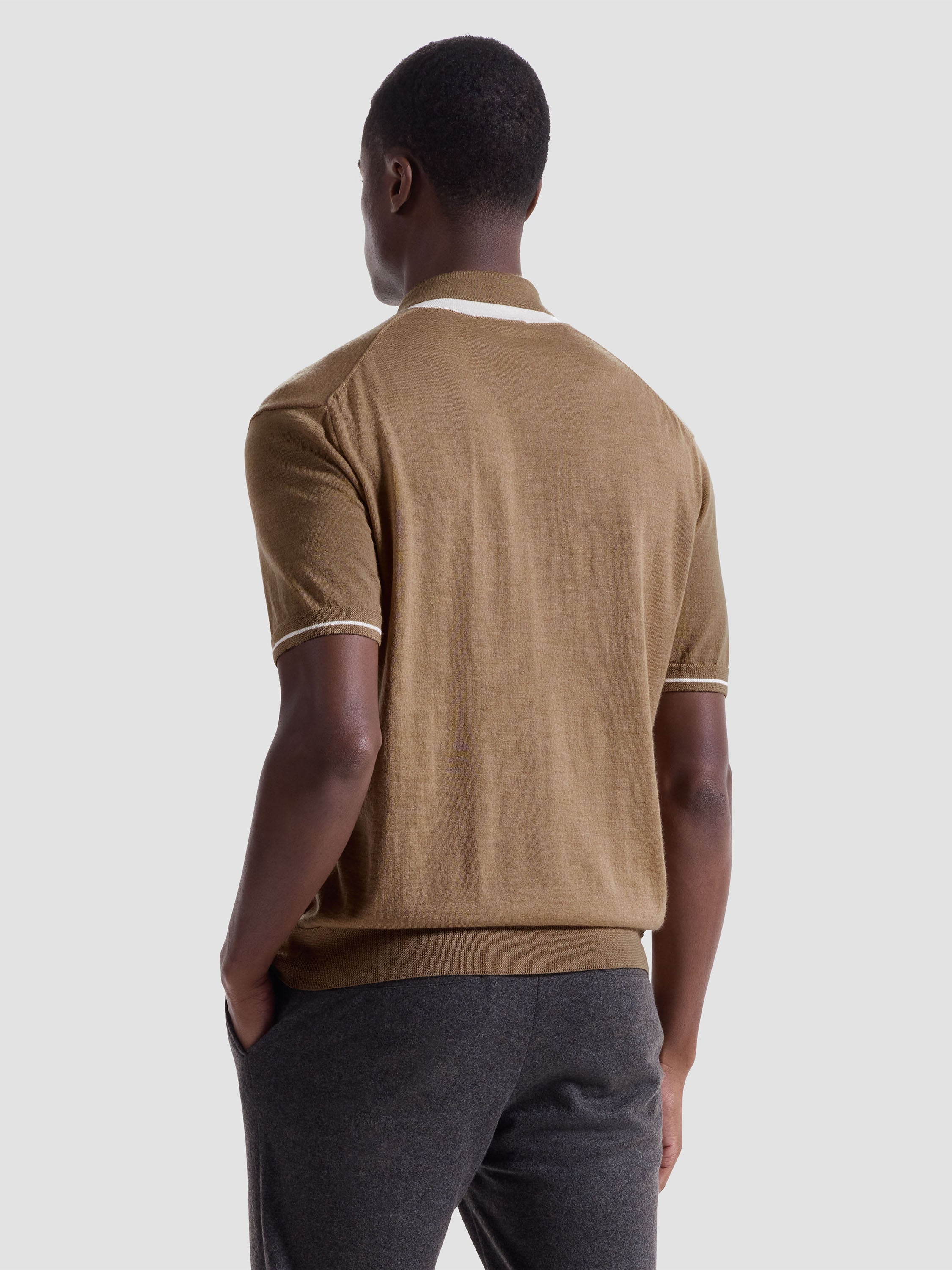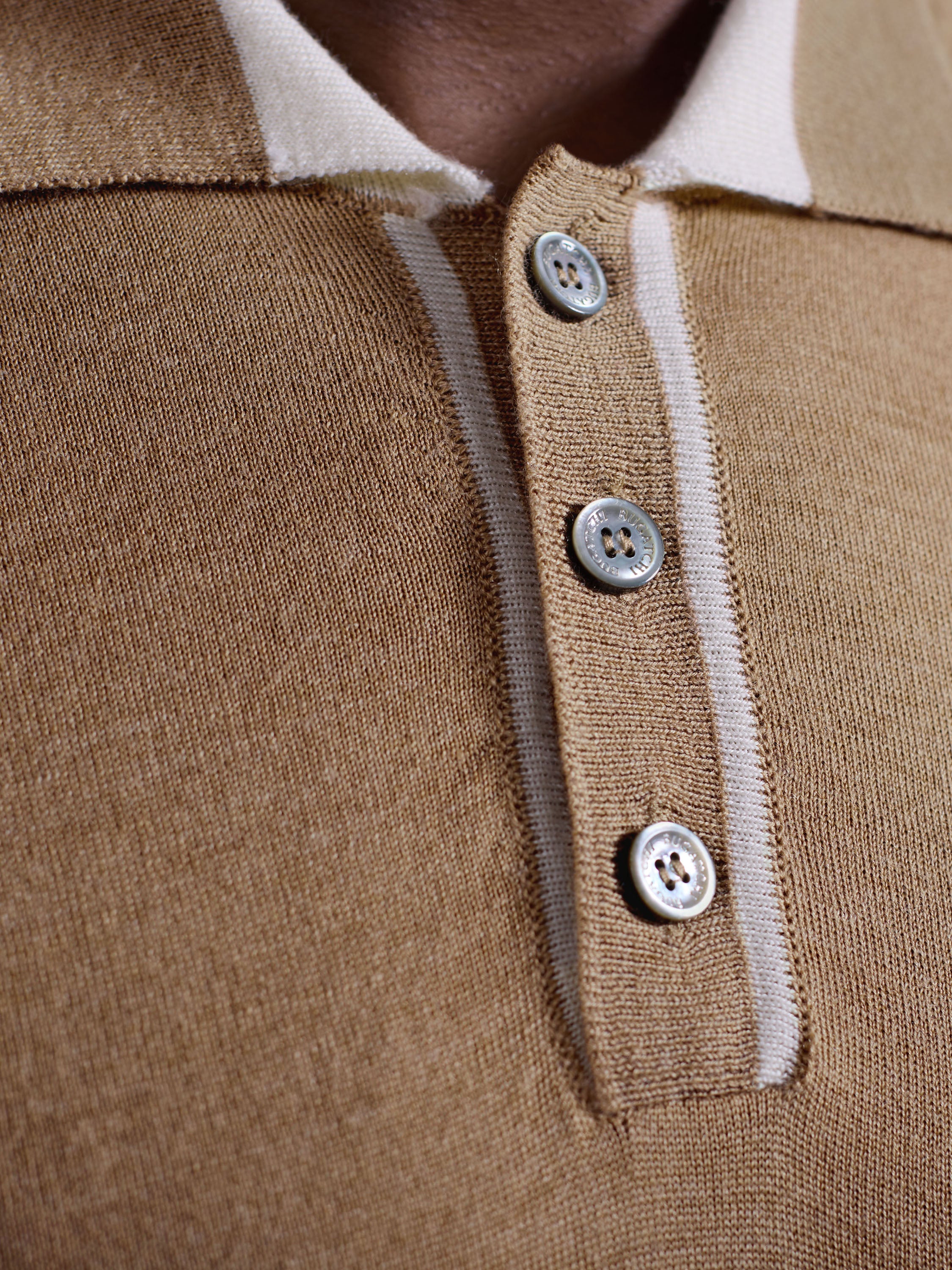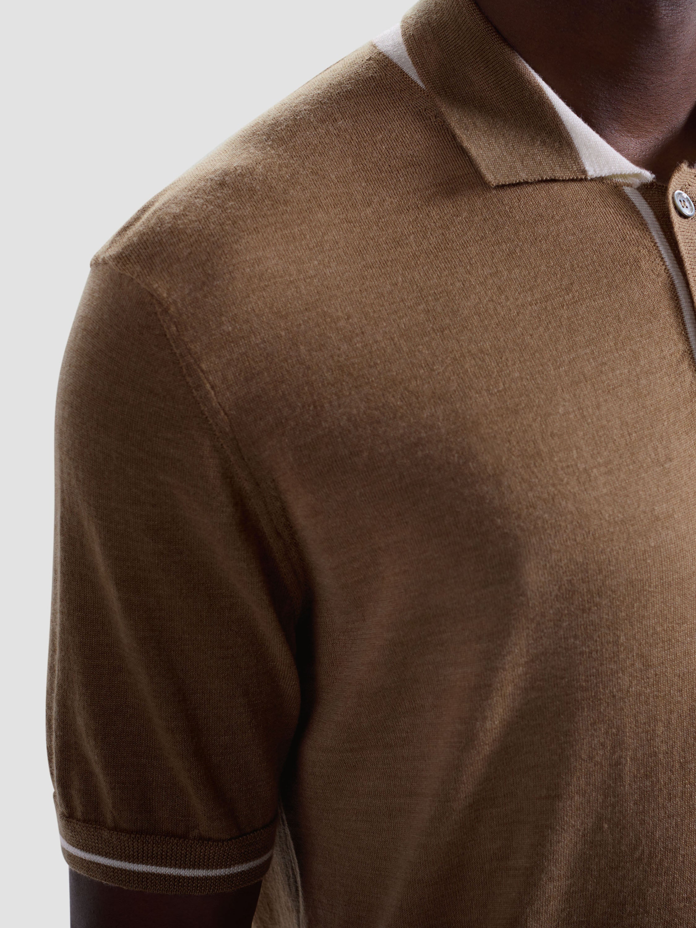 Crafted in Italy from a luxurious blend of extrafine merino wool and silk, this short-sleeve polo features contrast tipping on the placket and cuffs, a contrast interior collar band, and a ribbed hem. Finished with a refined three-button closure and mother-of-pearl buttons, it blends effortless elegance with thoughtful detail.