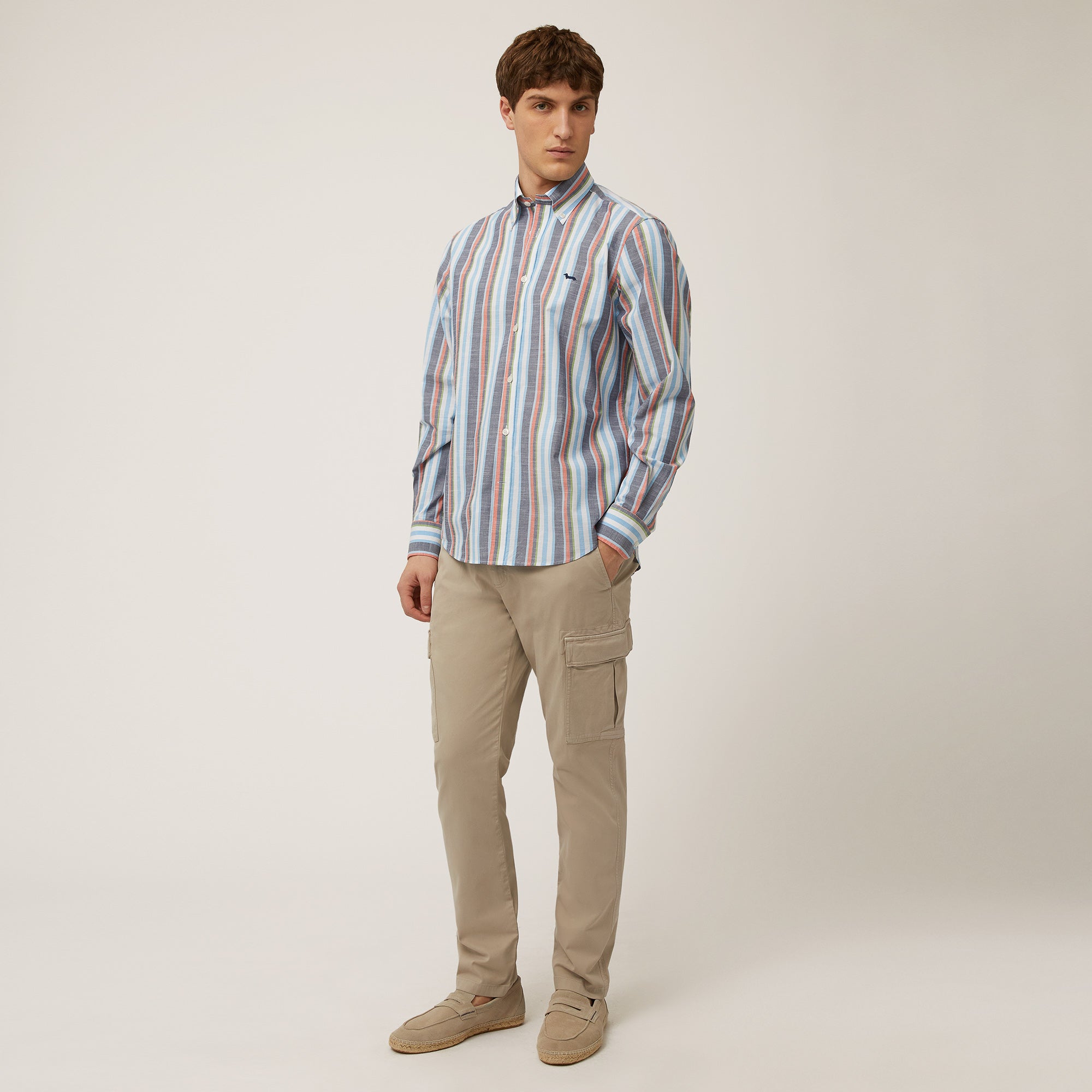 This men's pure linen shirt by Harmont & Blaine has a minimalist design, where the touch of panache is provided by a cheerful multicolor all-over vertical striped pattern and the iconic dachshund embroidered in contrasting thread on the chest. The garment, which comes in a comfortable regular fit, is finished with a practical button-down collar and a refined yoke with a pleat on the back, while the contrasting fabric on the underside of the collar and inside of the cuffs is a further tribute to the creative flair that has always set the brand apart.