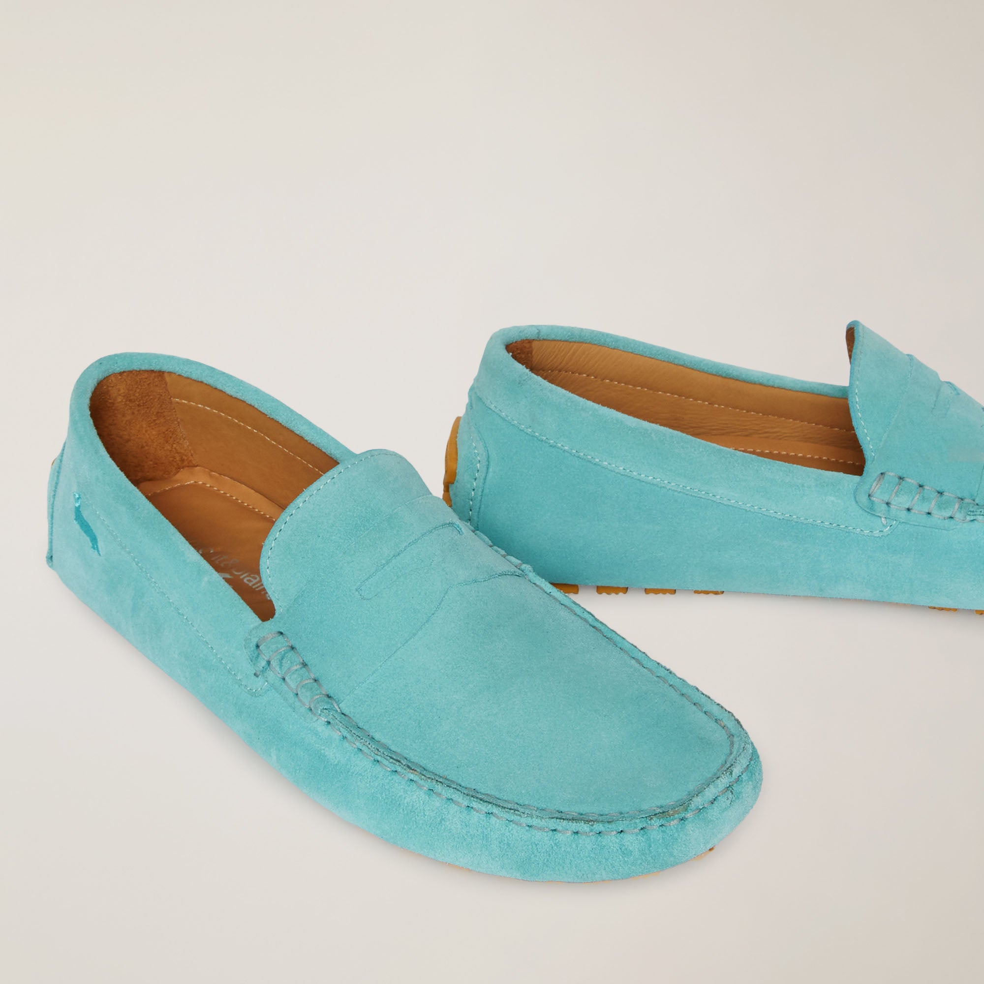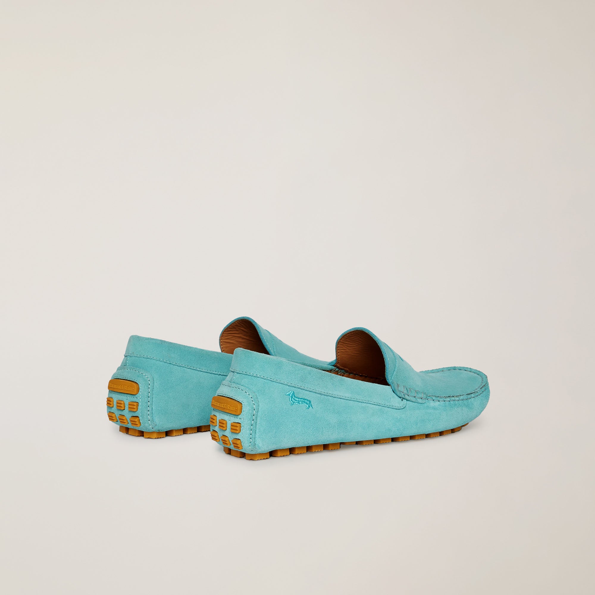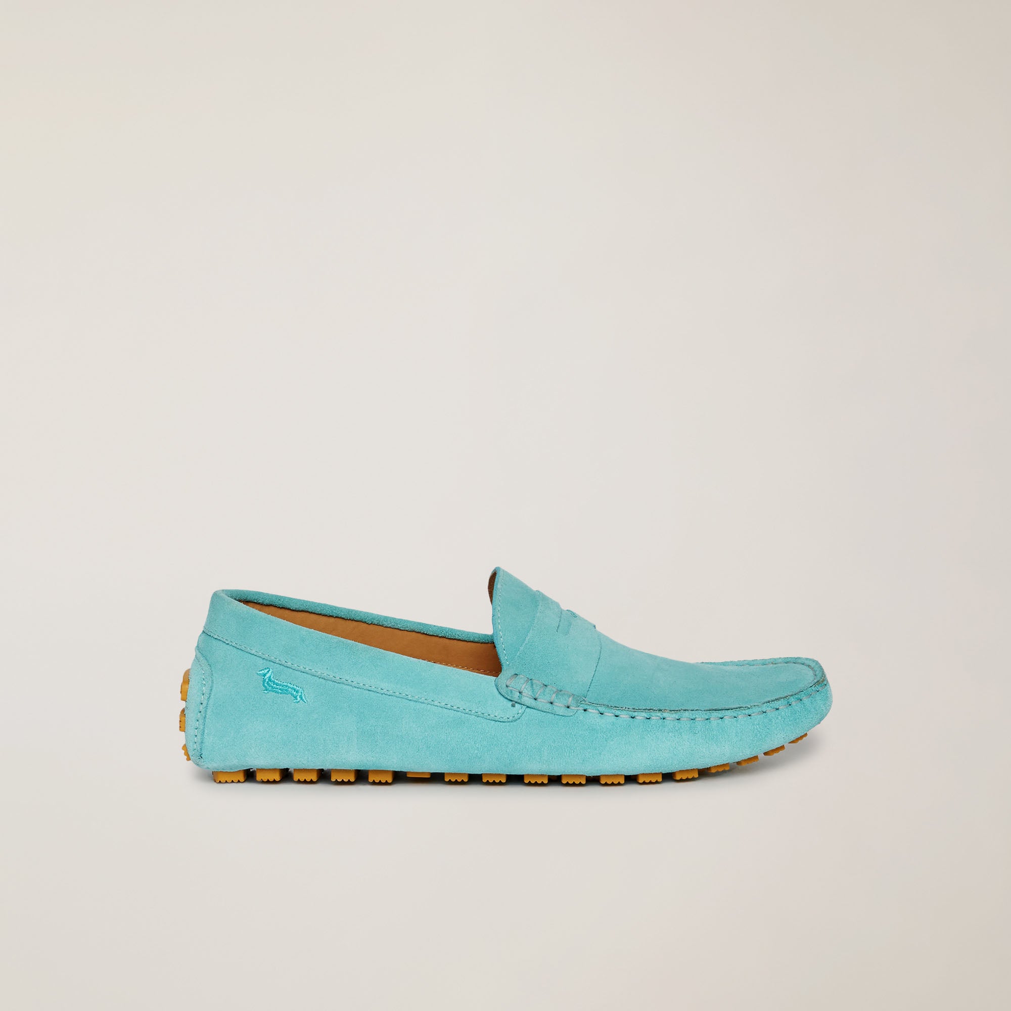 Classically styled loafer with refined lines, made entirely of soft suede. It is embellished with a detail in the same texture on the vamp that gives balance to the upper and a flexible sole with rubber cleats for an intriguing design. The iconic dachshund is embroidered on the side of the heel.