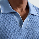Crafted from a refined cotton blend, this short sleeve polo features a diamond cable stitch pattern that adds sophisticated texture and an open Johnny collar. The collar, cuffs, and hem are accented with contrast tipping for a polished finish. A versatile style for elevated weekend wear or casual outings.