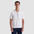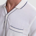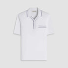 Crafted from a soft cotton-silk blend, this short sleeve polo sweater features a Johnny collar with a two-button closure accented by mother-of-pearl buttons. Refined contrast piping along the collar, placket, and chest pocket adds a touch of sophistication, while the lightweight knit ensures a smooth, breathable feel. A versatile staple for elevated casual wear.