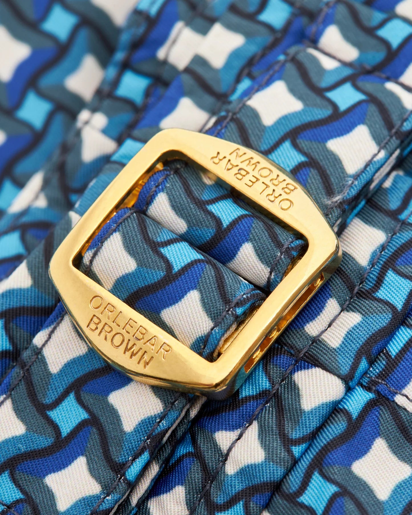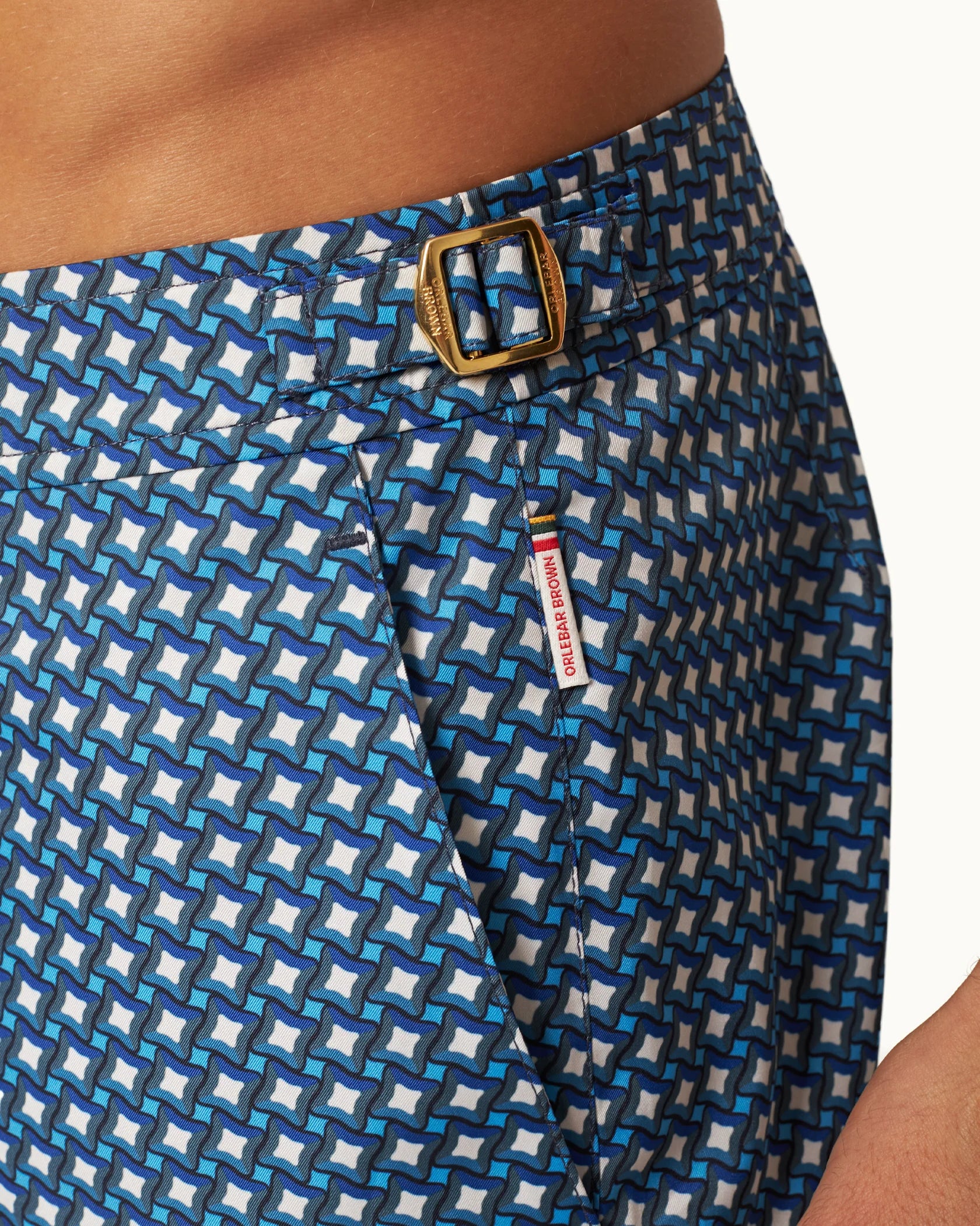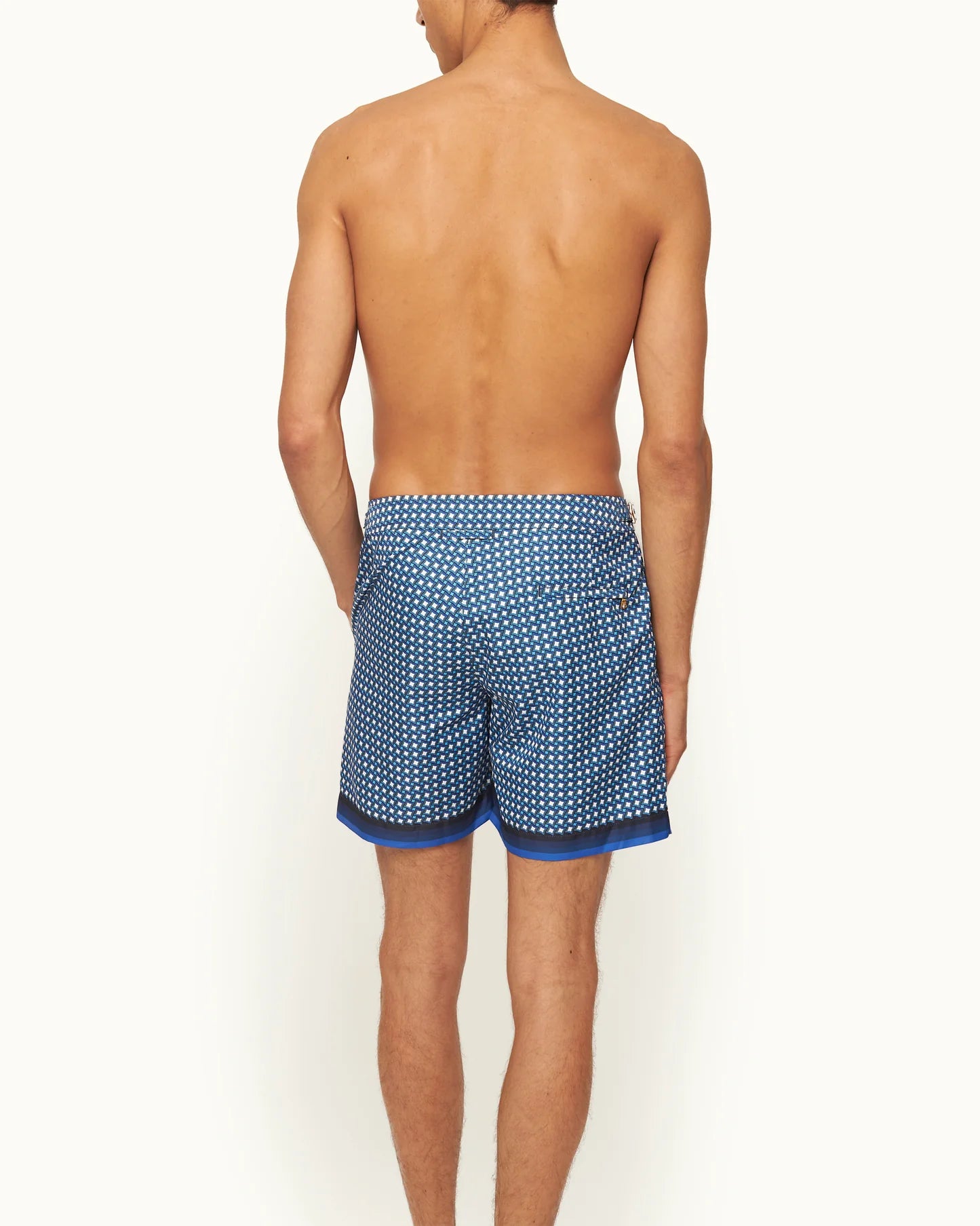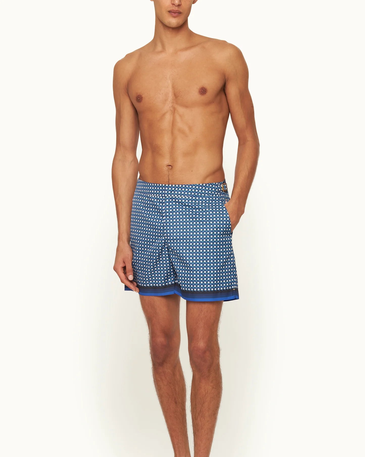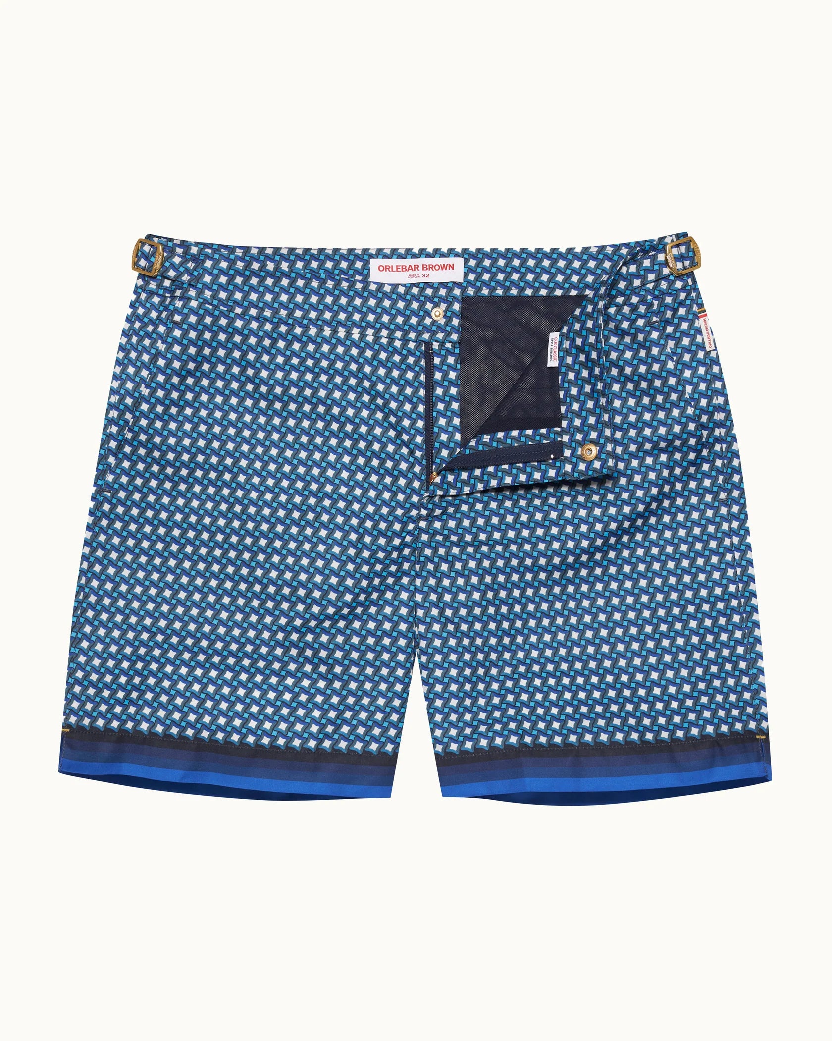 The expressive blues and geometric shapes of our Piscina print transport you to a palm-lined poolside. This exclusive print is underscored by gradient stripes at the hem and elegant gold-tone side fasteners. These statement swim shorts are just what your holiday needs in our signature Bulldog length and fit.