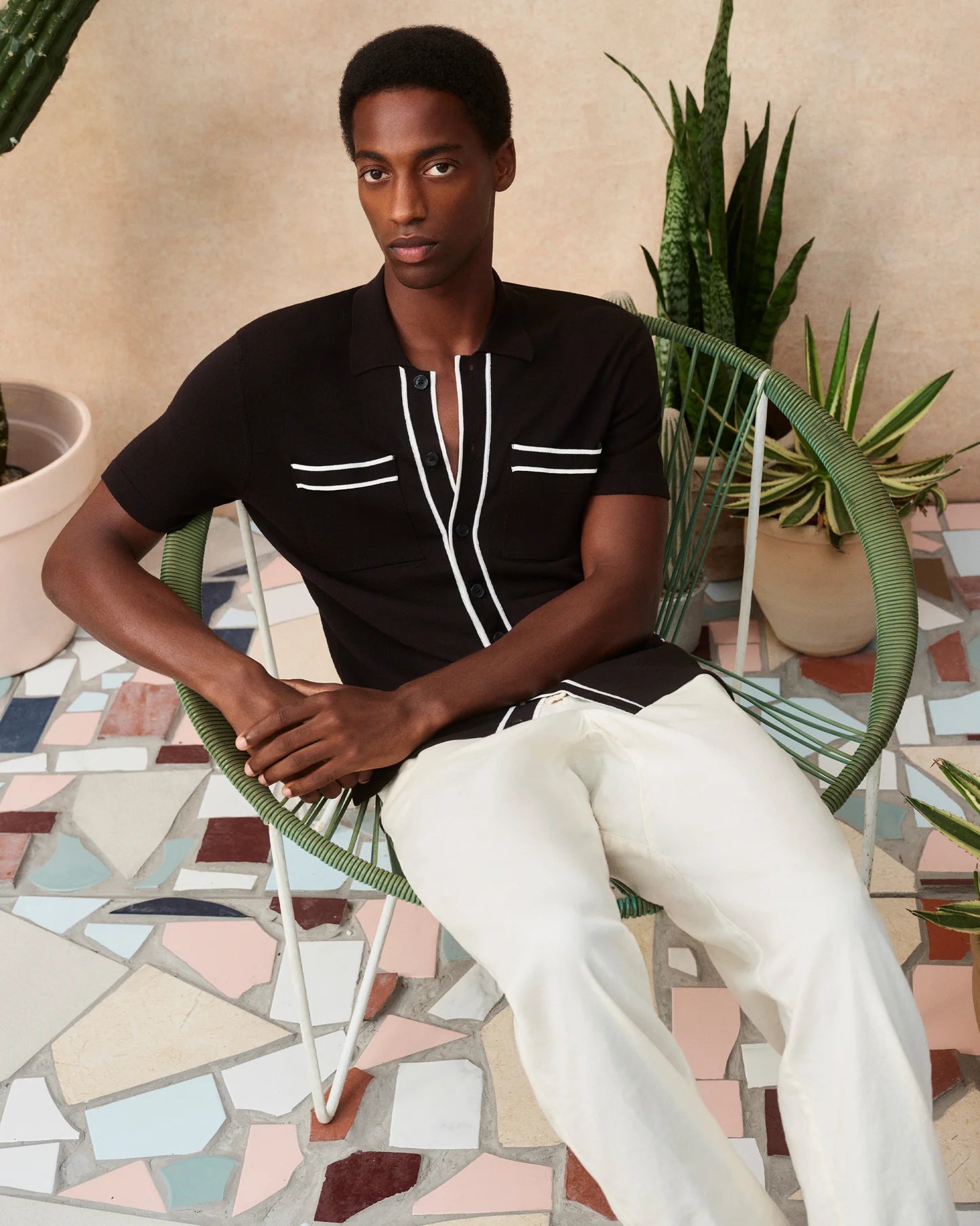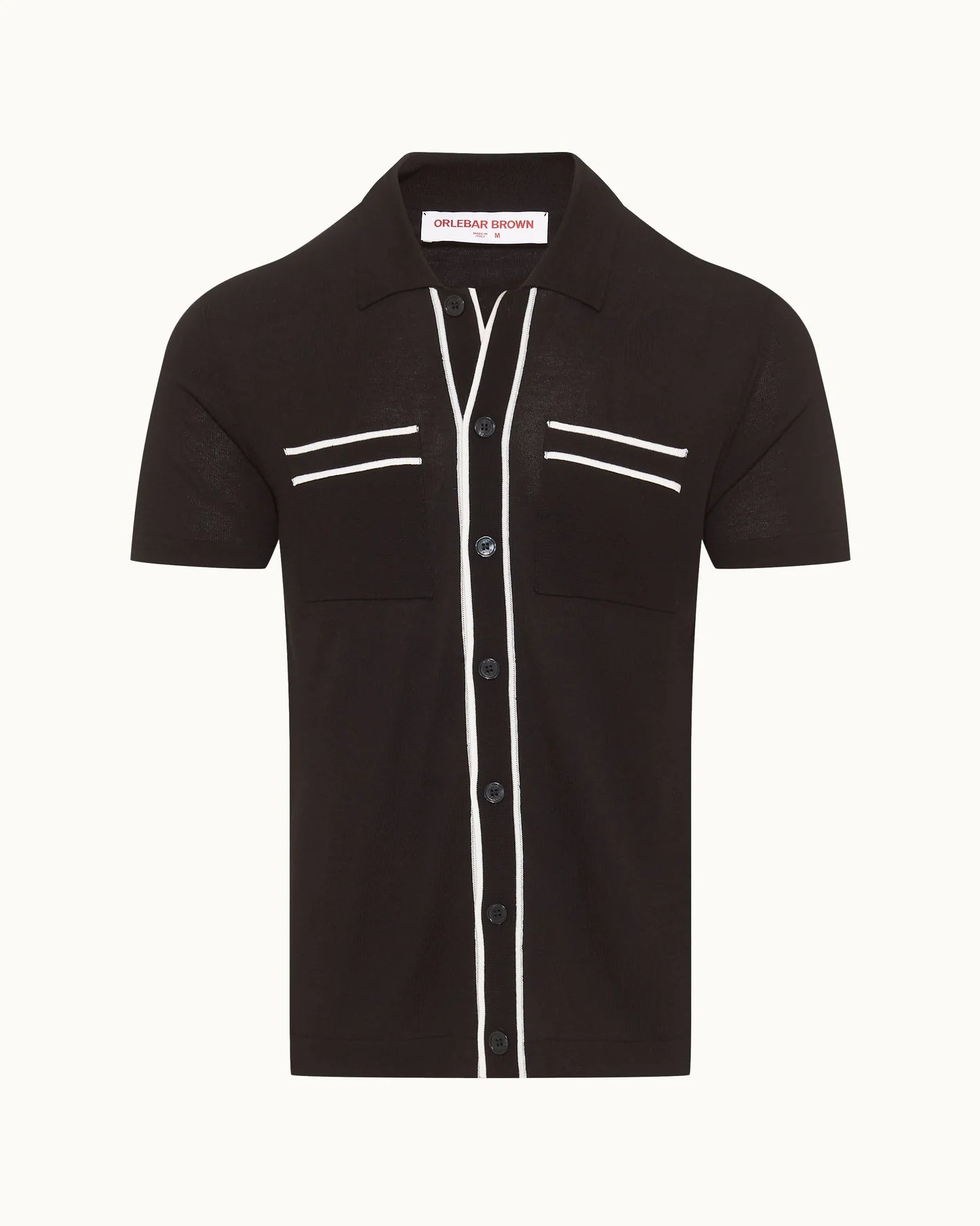 Get creative with your style with our knitted Keeling shirt. We’ve added double white tipping along the placket and chest pockets, resulting in a bold, retro look. This short-sleeved shirt is made from a cotton and silk Italian crepe fabric, forming an ultra-light, airy feel that drapes effortlessly. The fully fashioned construction is a hallmark of impeccable quality.
