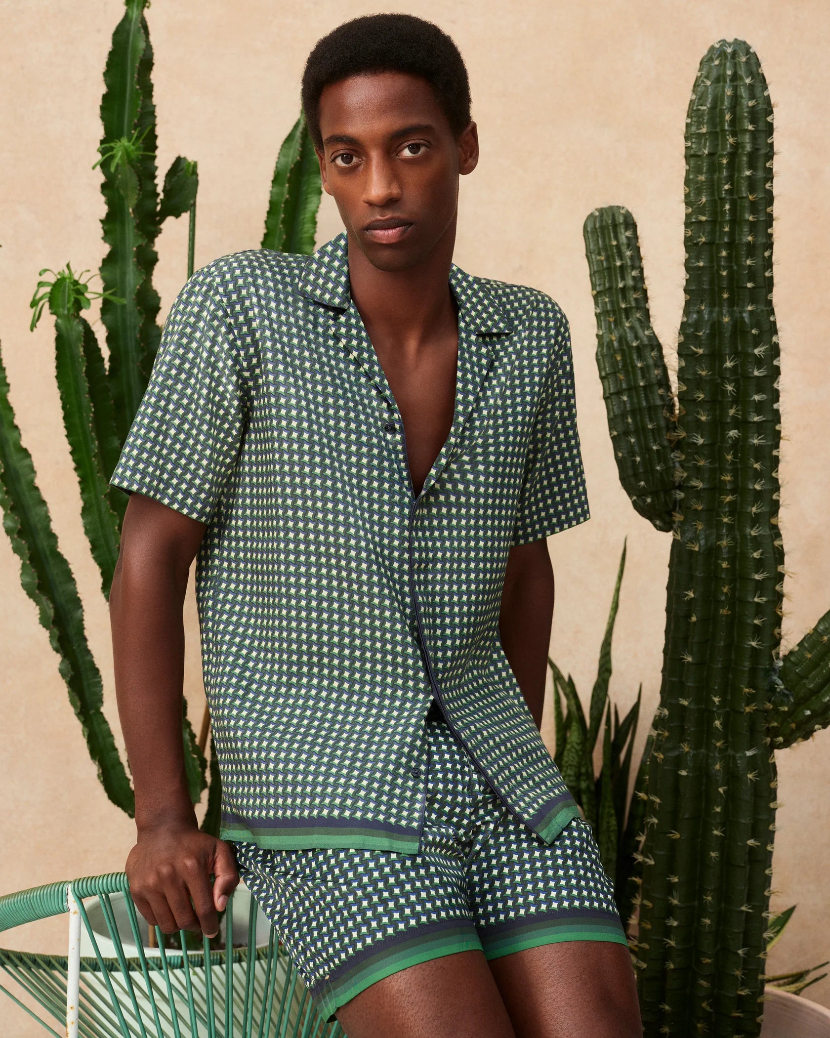 Bold, confident and artistic; that's our Maitan Piscina shirt. In flattering Agave Green, this exclusive print mixes pool-inspired geometric shapes with gradient-striped piping along the capri collar. The result is an eccentric yet tasteful clash of patterns. The relaxed fit and concealed button placket let the print take the focus. Complete the Set