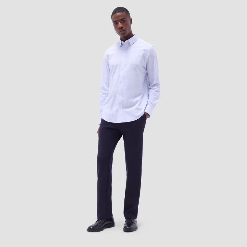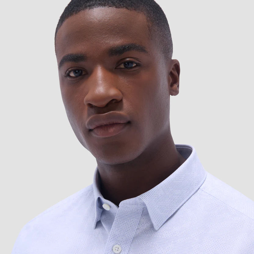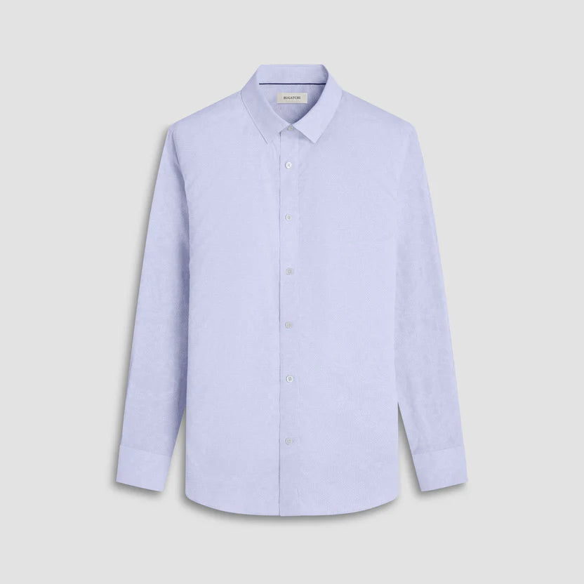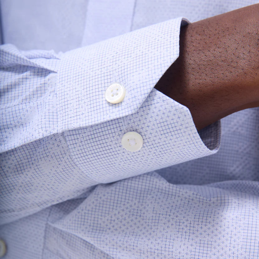 The Karl long-sleeve Comfort Stretch shirt in graph check jacquard is crafted from premium cotton with a hint of stretch. Designed for versatility, it features a hidden button-down collar, mother-of-pearl buttons, a curved hem that can be worn tucked or untucked, and notched cuffs adjustable for a custom fit-wear them snug or loose, or convert them for cufflinks. A refined choice for any occasion.