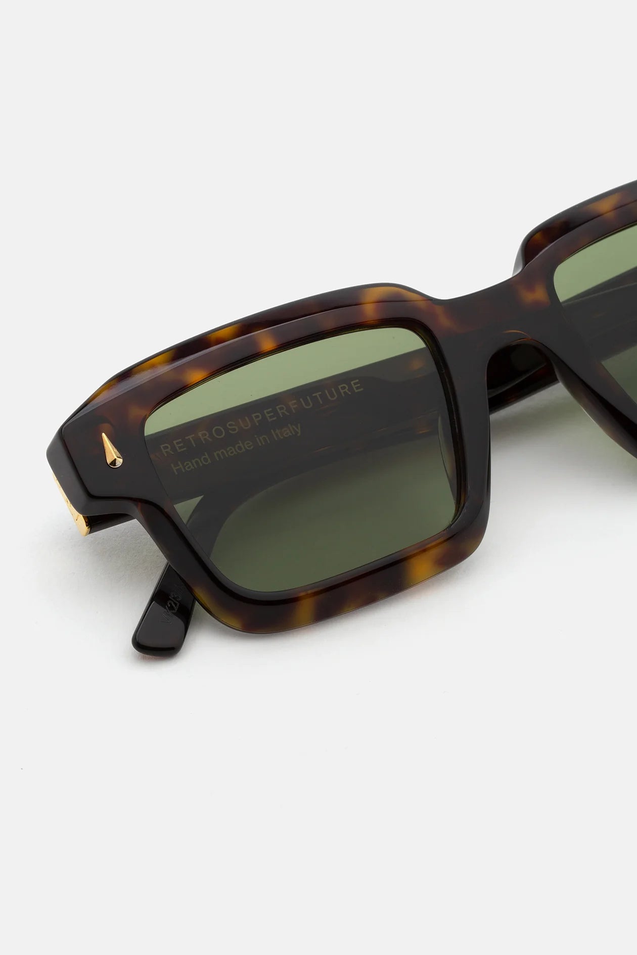 Angular, chunky and bold, Giardino is a unique frame with a determined, precise shape. Characterised by wide rectangular lenses, the model is a reinterpretation of 1950s silhouettes, updated with an emphasis on sculpted acetate rims and essential geometries. This version comes in a vibrant 3627 Havana acetate with bottle green lenses and gold decors.