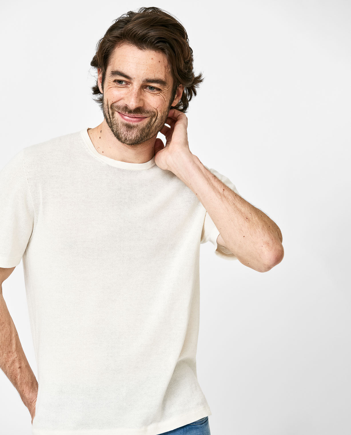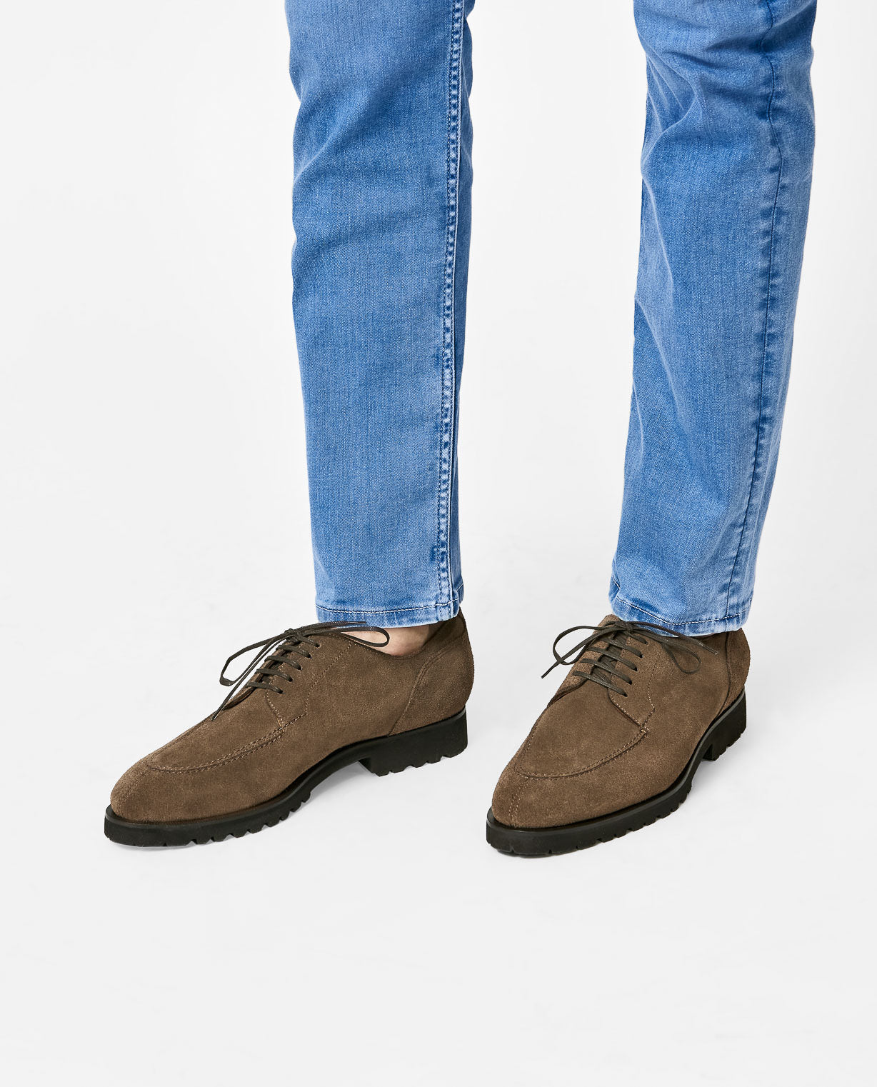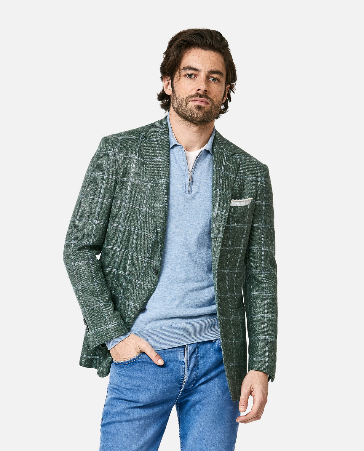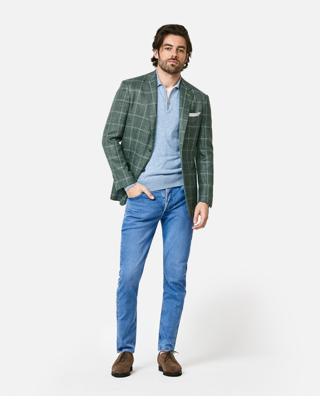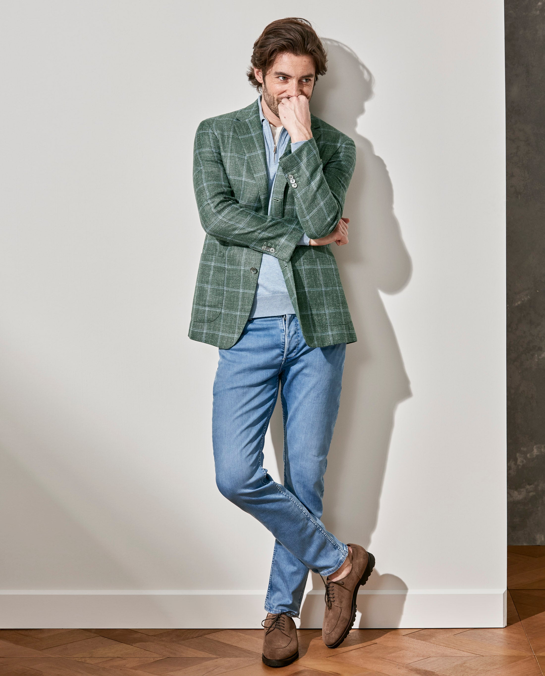 Summer smart-casual shouldn't sacrifice comfort. This look combines an airy windowpane jacket with styling that prioritises movement and breathability – an off-white cotton-silk t-shirt, light denim blue cotton-cashmere polo, light blue super stretch jeans, and taupe lightweight bluchers.
