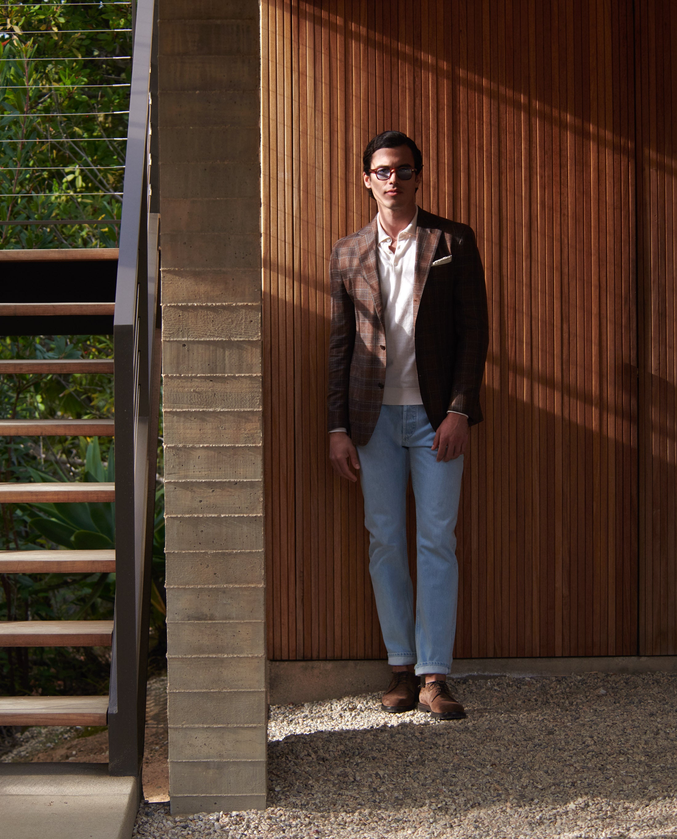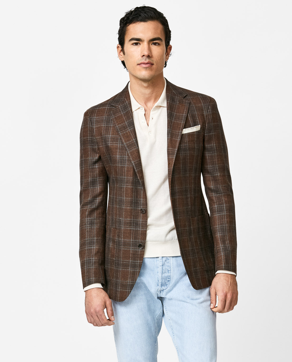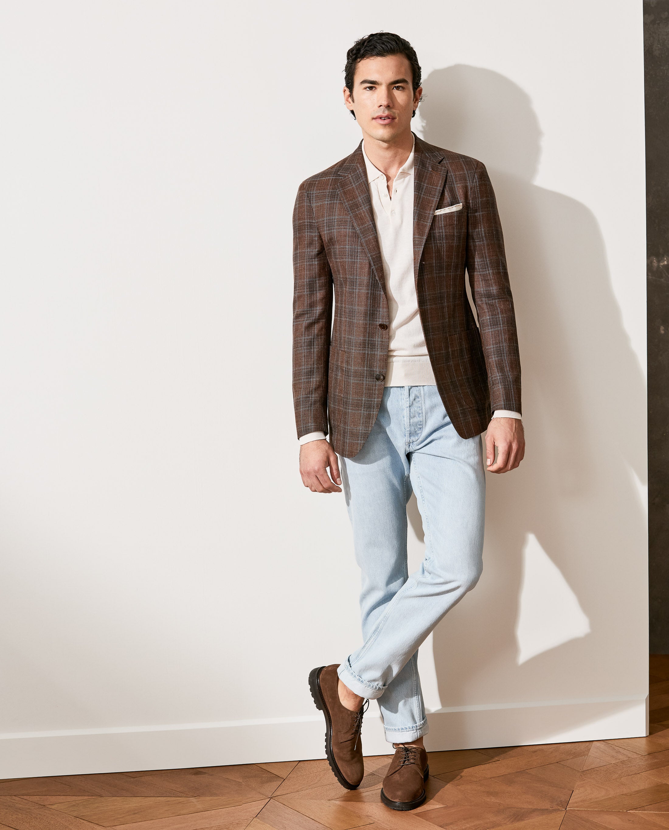 This look embraces a west coast attitude to tailoring. Featuring the kind of jacket that demands attention but can still be dressed up or down. Styled for an evening in the city with some of our most comfortable summer staples: the off-white cotton-silk polo knit, light blue selvedge jeans, and chocolate suede lightweight bluchers.