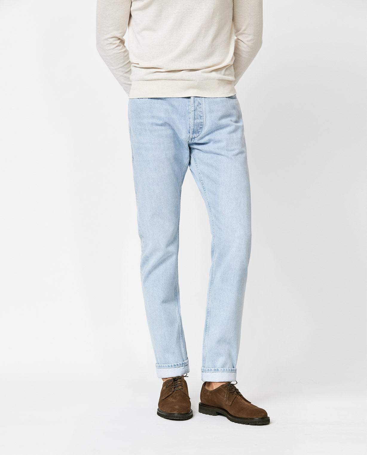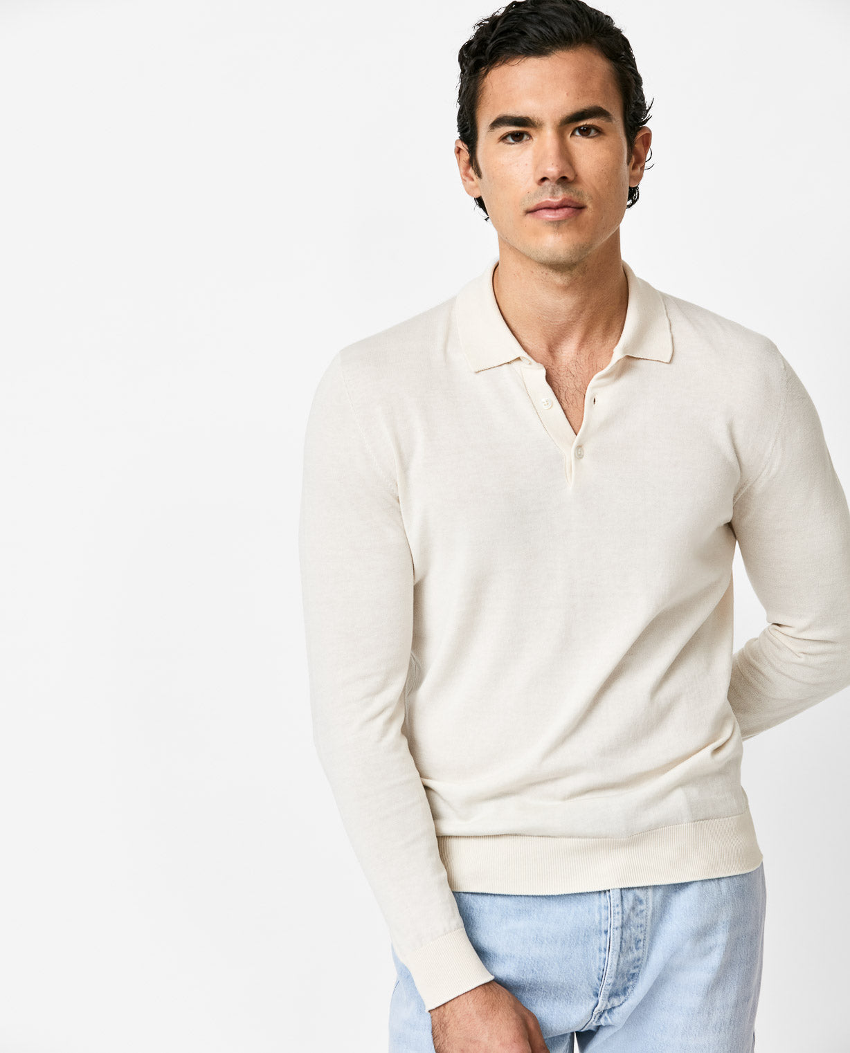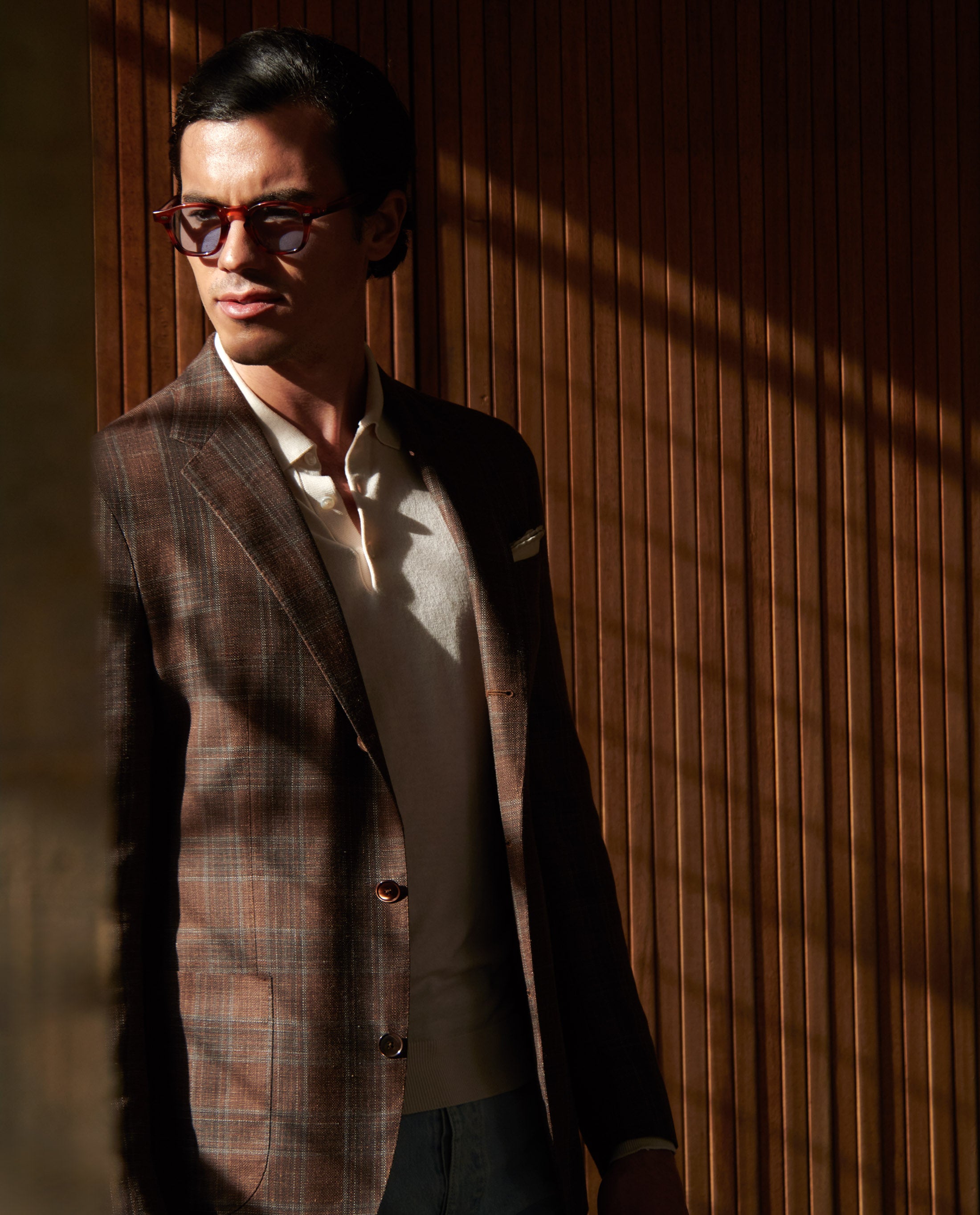 This look embraces a west coast attitude to tailoring. Featuring the kind of jacket that demands attention but can still be dressed up or down. Styled for an evening in the city with some of our most comfortable summer staples: the off-white cotton-silk polo knit, light blue selvedge jeans, and chocolate suede lightweight bluchers.