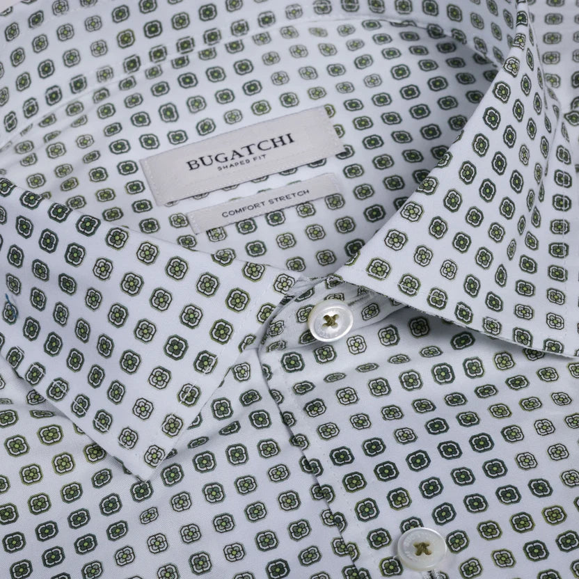 The Alvin long-sleeve Comfort Stretch shirt is crafted from premium cotton fabric with added stretch for all-day ease, in a micro geometric tile print. Designed with a one-piece spread collar, genuine mother-of-pearl buttons, and adjustable notched cuffs that also convert for cufflinks. A versatile shirt that looks polished whether tucked or untucked.
