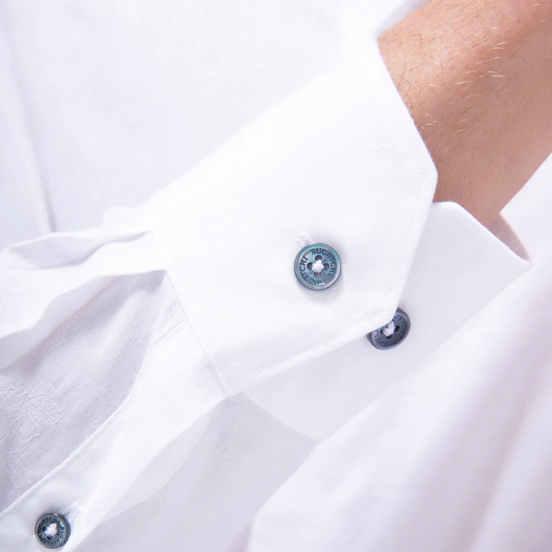 The Axel long-sleeve shirt in tonal floral jacquard is crafted from 100% cotton fabric. Designed for versatility, it features a spread collar, mother-of-pearl buttons, a curved hem that can be worn tucked or untucked, and notched cuffs adjustable for a custom fit-wear them snug or loose, or convert them for cufflinks. A refined choice for any occasion.