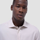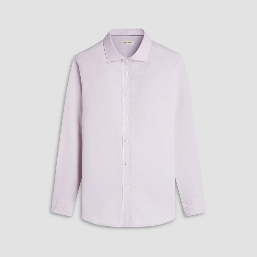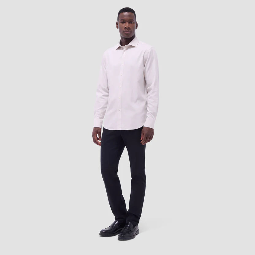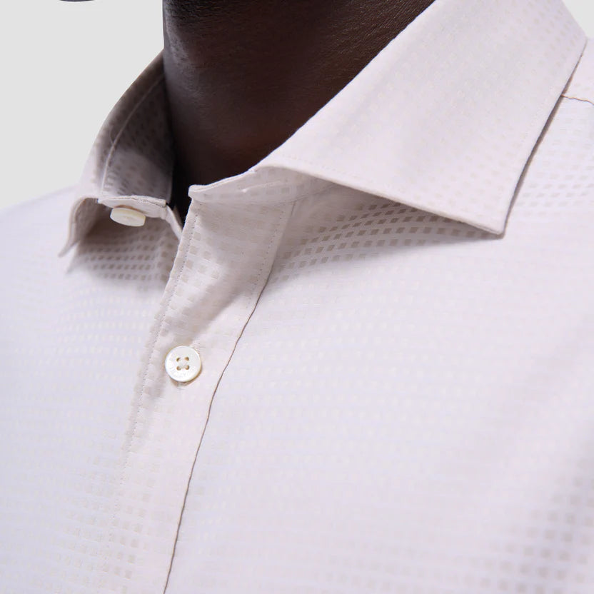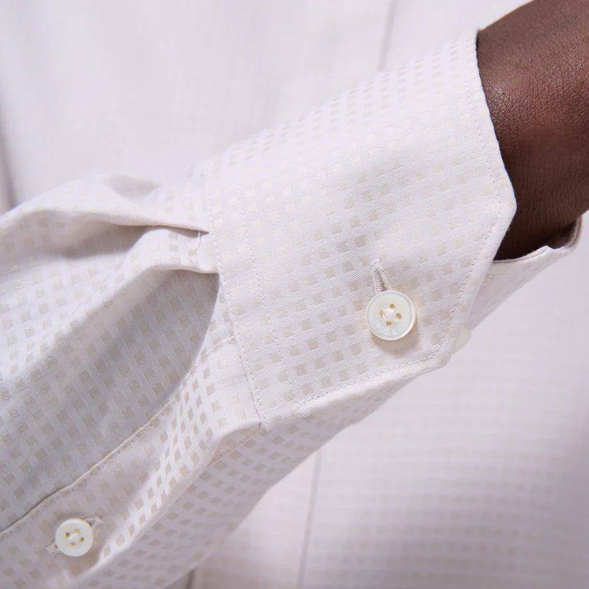 The Axel long-sleeve shirt in tonal micro check jacquard is crafted from 100% cotton fabric. Designed for versatility, it features a spread collar, mother-of-pearl buttons, a curved hem that can be worn tucked or untucked, and notched cuffs adjustable for a custom fit-wear them snug or loose, or convert them for cufflinks. A refined choice for any occasion.