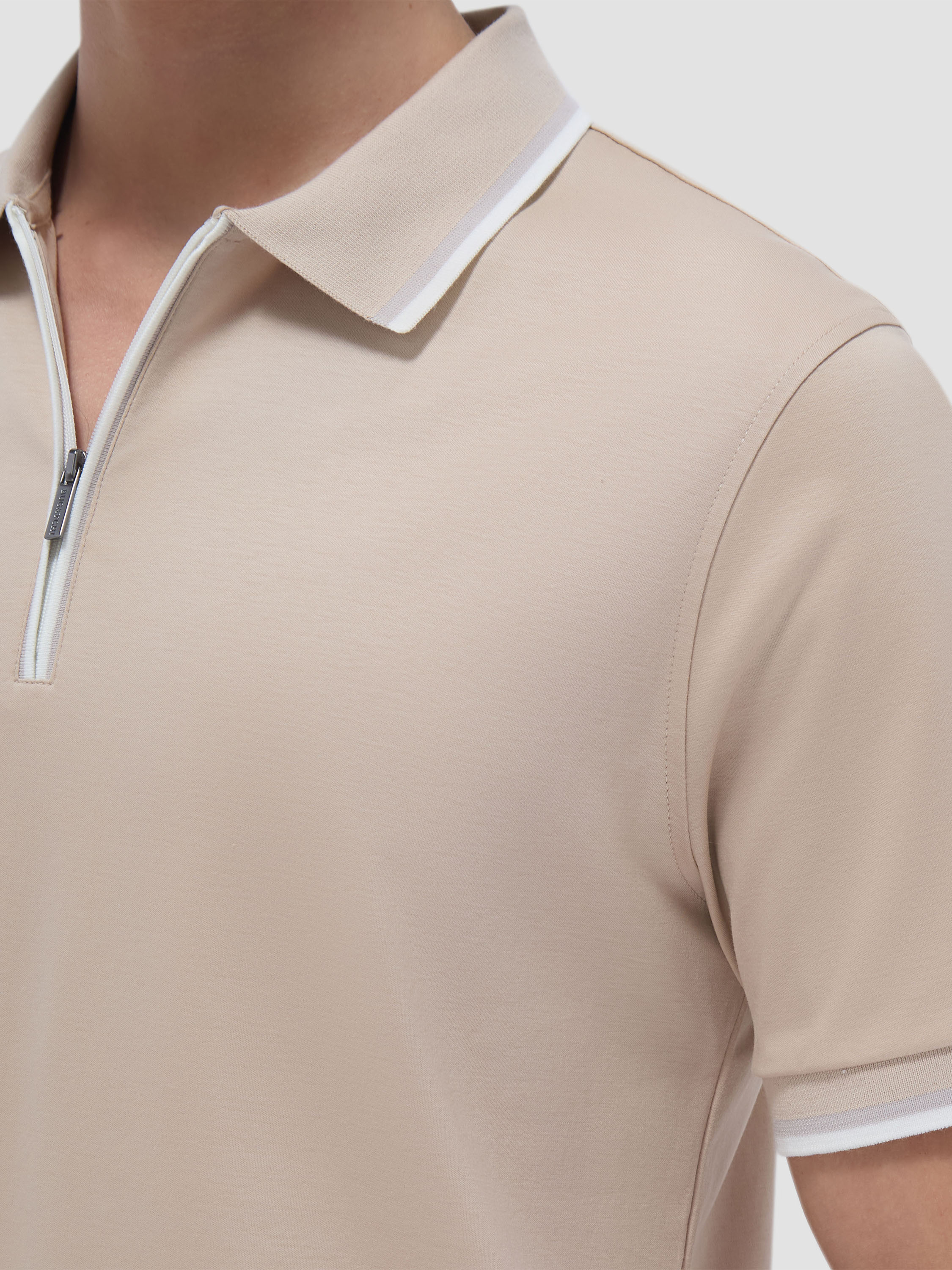 This solid short-sleeve polo shirt, made from 100% Pima cotton, offers an ultra soft, breathable feel. It features a sleek quarter-zip closure, and solid rib collar and cuffs with double stripe detail. With side vents for comfort and mobility, this polo ensures a relaxed fit whether you are at the golf club or enjoying a casual day out. Its elegant design combines style and functionality, making it a versatile addition to your wardrobe for any occasion.