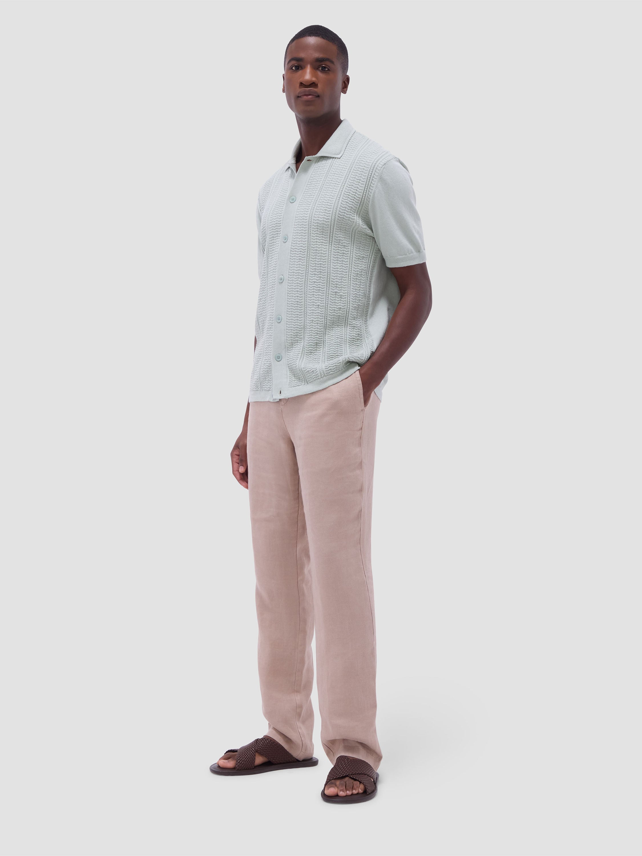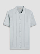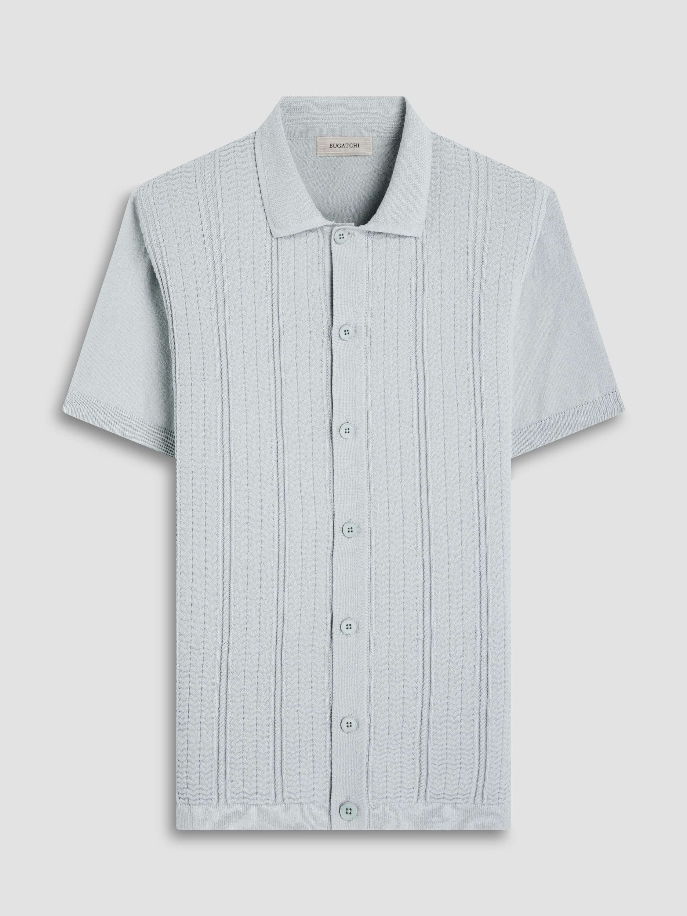 This short-sleeve textured sweater knit shirt, made from 100% cotton, features a sophisticated design with chevron bands on the front panel, adding a touch of visual interest. The shirt has a full button closure, while the back, placket, and sleeves are crafted in a smooth flat knit for contrast. The collar, cuffs, and waist are finished in tonal rib, giving the shirt a refined, cohesive look that is both comfortable and stylish.