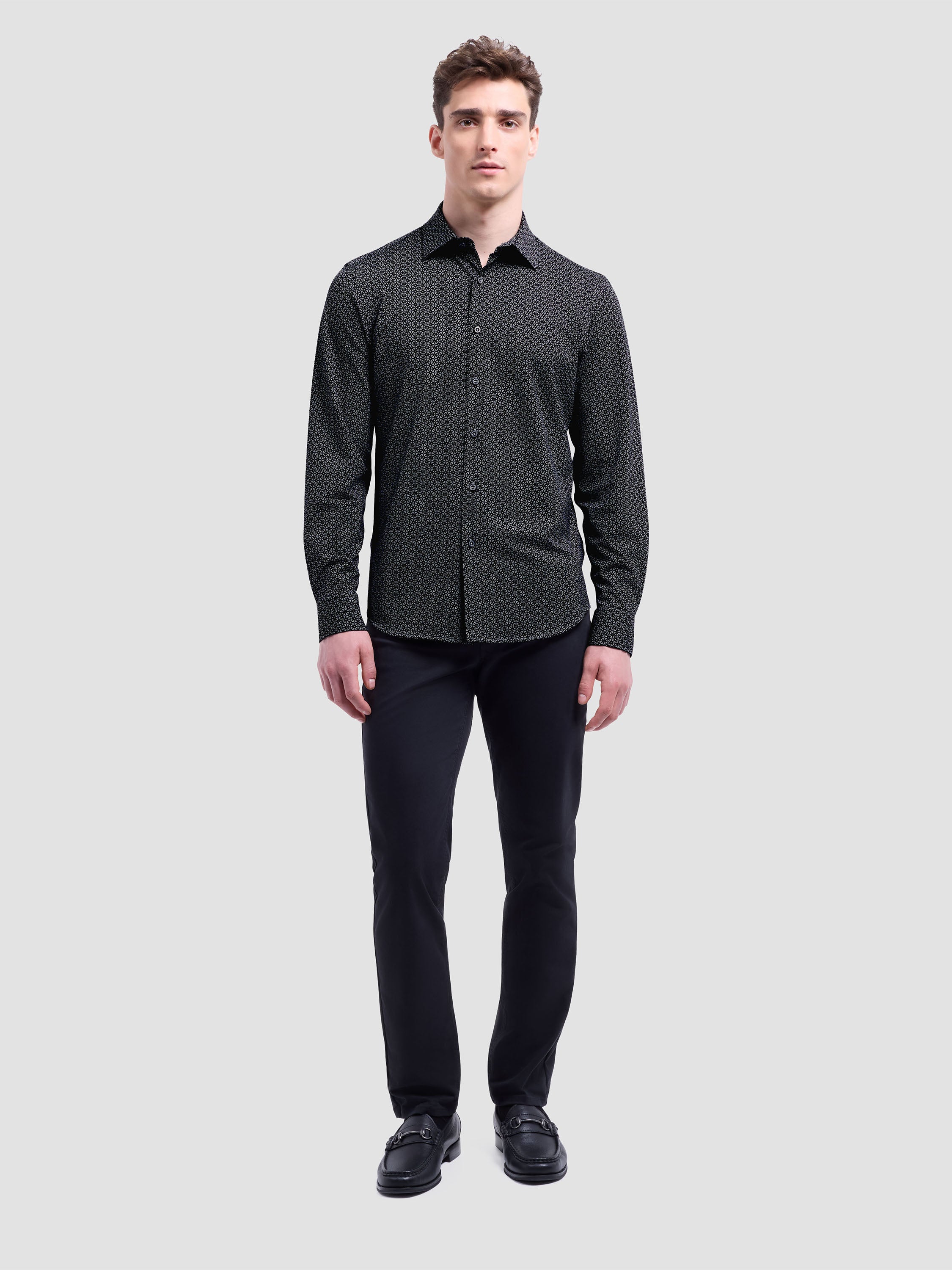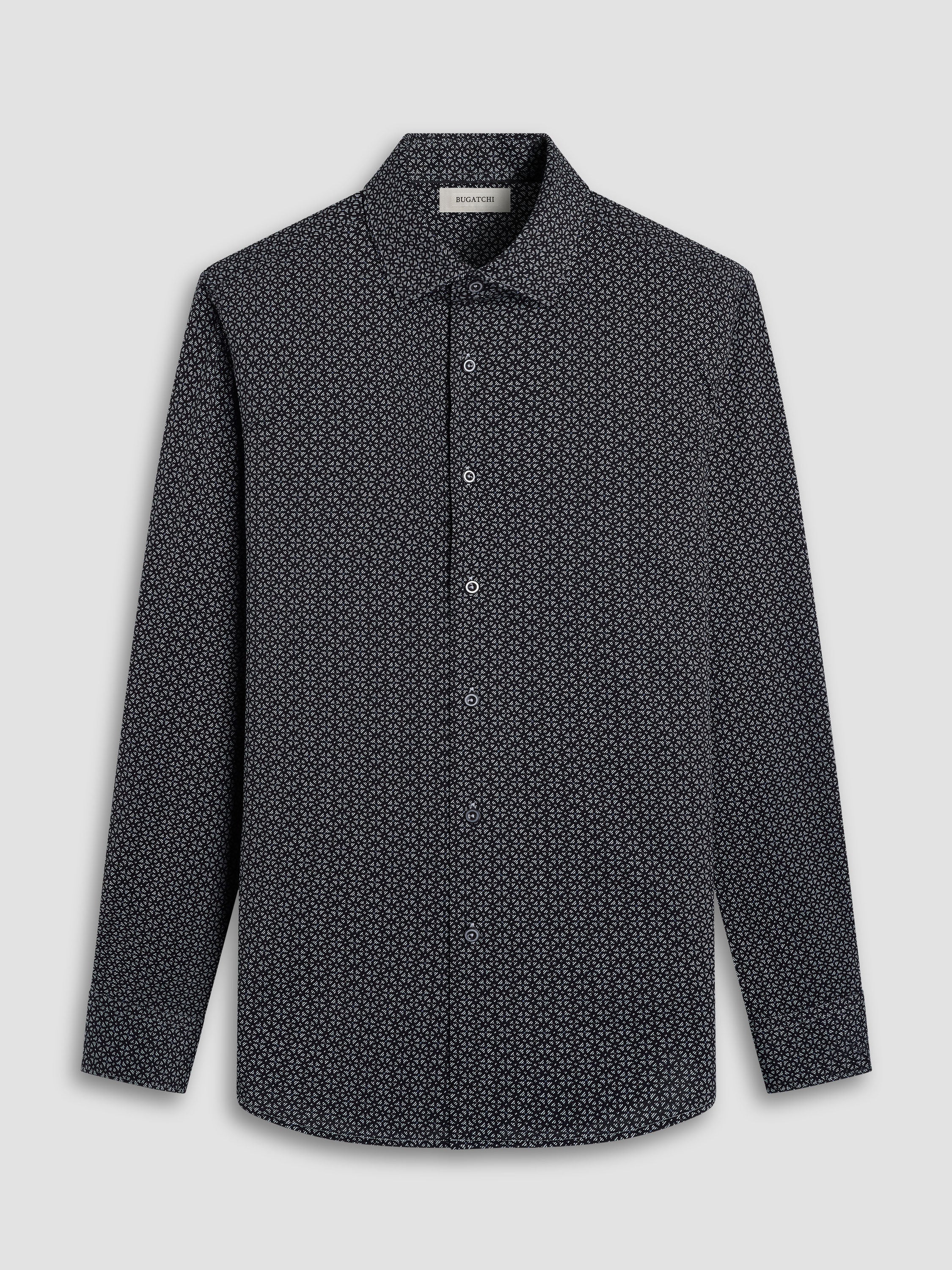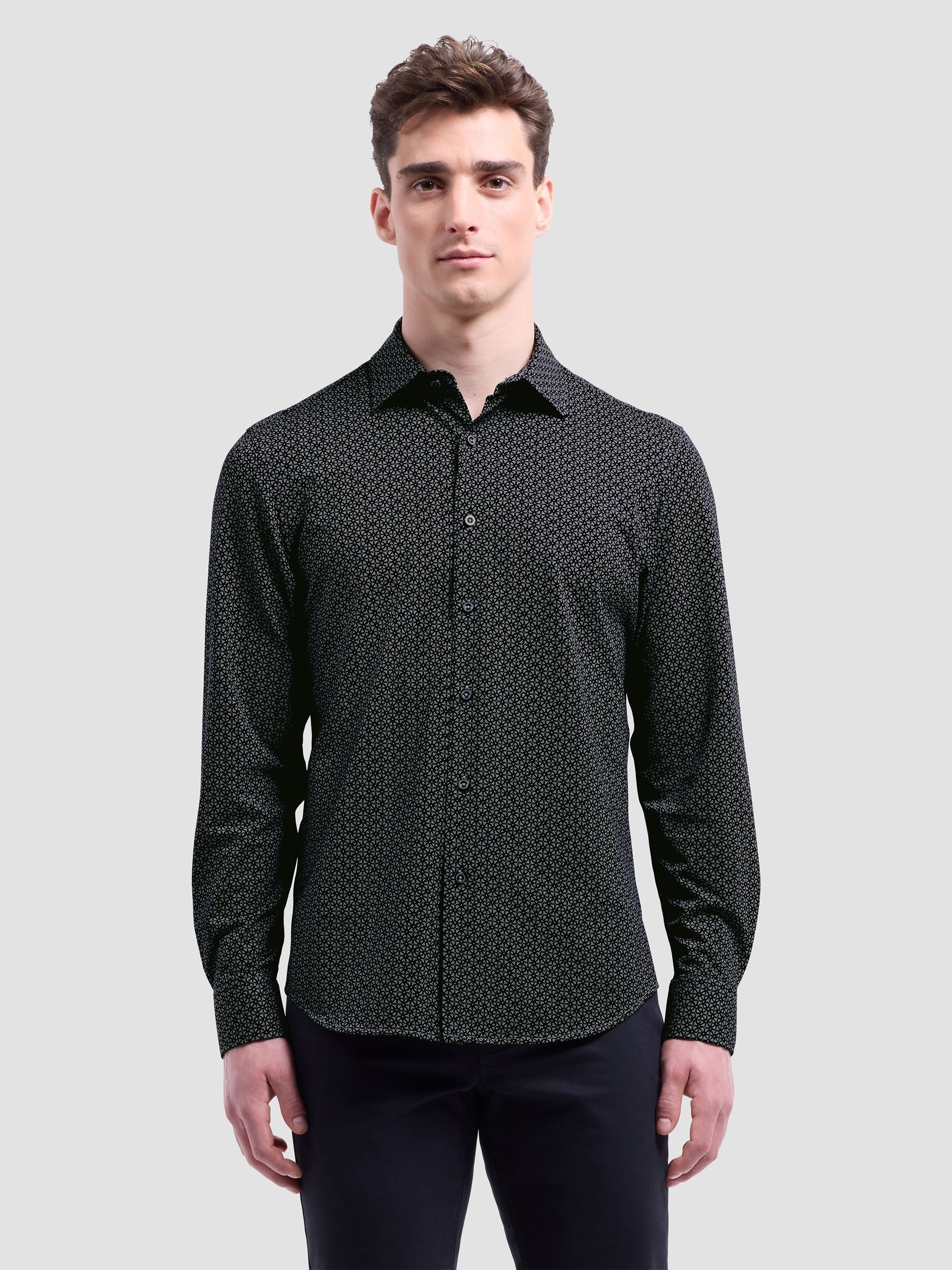 The James OoohCotton® long-sleeved shirt in paisley print features a point collar, mother-of-pearl buttons, and a curved hem for a sleek tucked or untucked look. The notched cuffs are adjustable to allow for customized fit and also convertible to accommodate cufflinks. OoohCotton® is a performance, double-mercerized, wrinkle-resistant, breathable, and easy-care cotton blend with 8-way stretch, quick-dry, and thermal comfort properties.