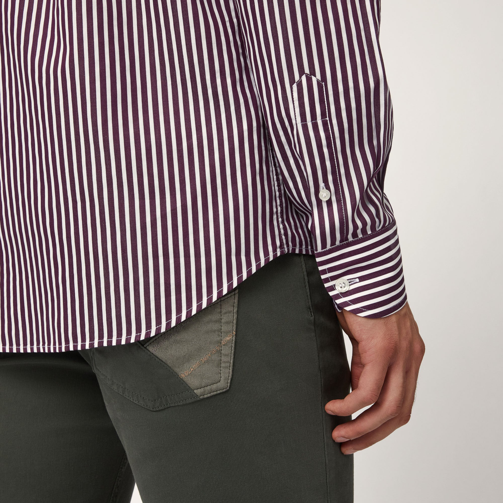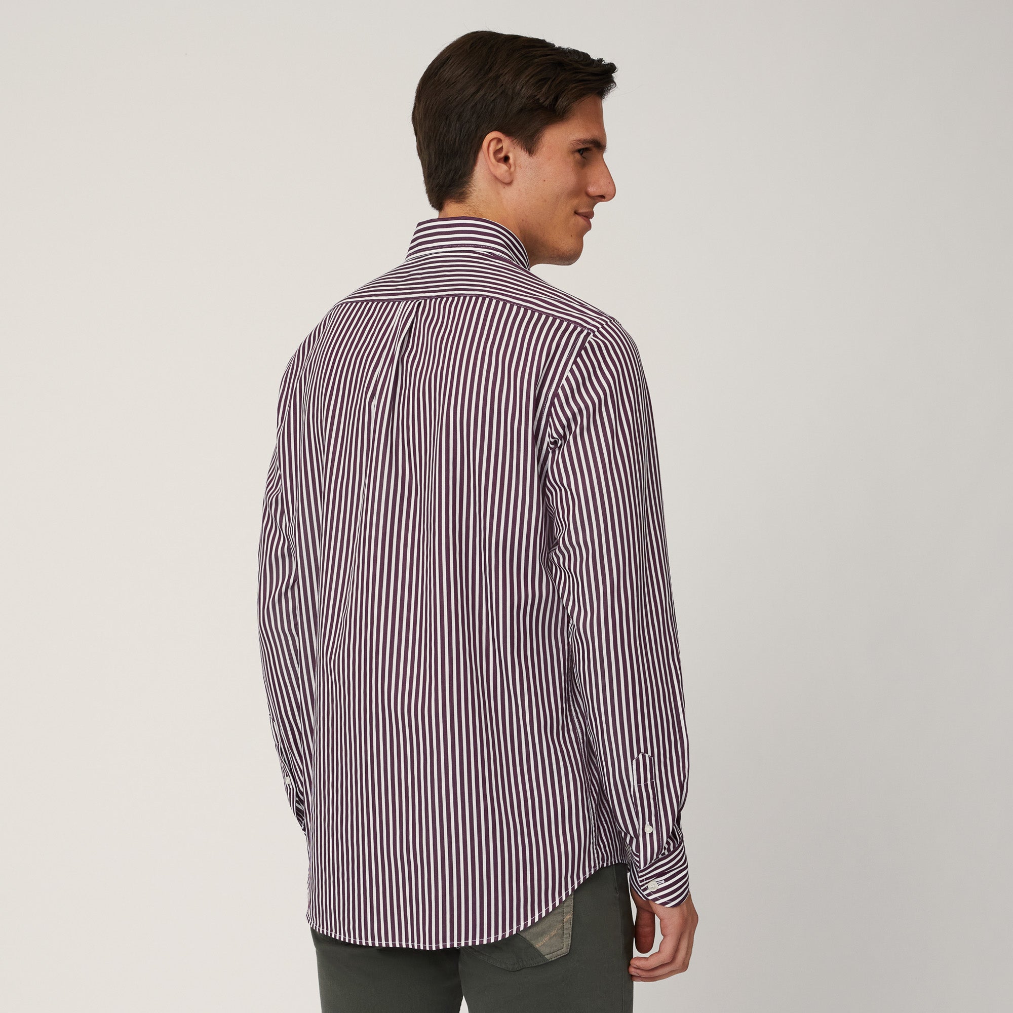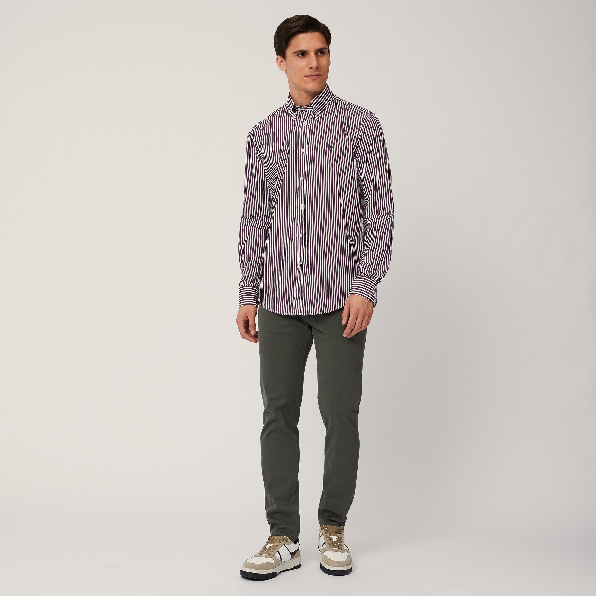 Harmont & Blaine reinterprets the men's shirt, a must-have garment par excellence, in an eclectic two-tone vertical striped version. The style comes in a versatile and comfortable regular fit and features a rounded hem, making it ideal for either wearing outside pants for a more casual look or tucking inside them for a slightly more formal look. The button-down collar is a practical feature, while the iconic embroidered dachshund on the chest provides that brand-signature finishing touch.