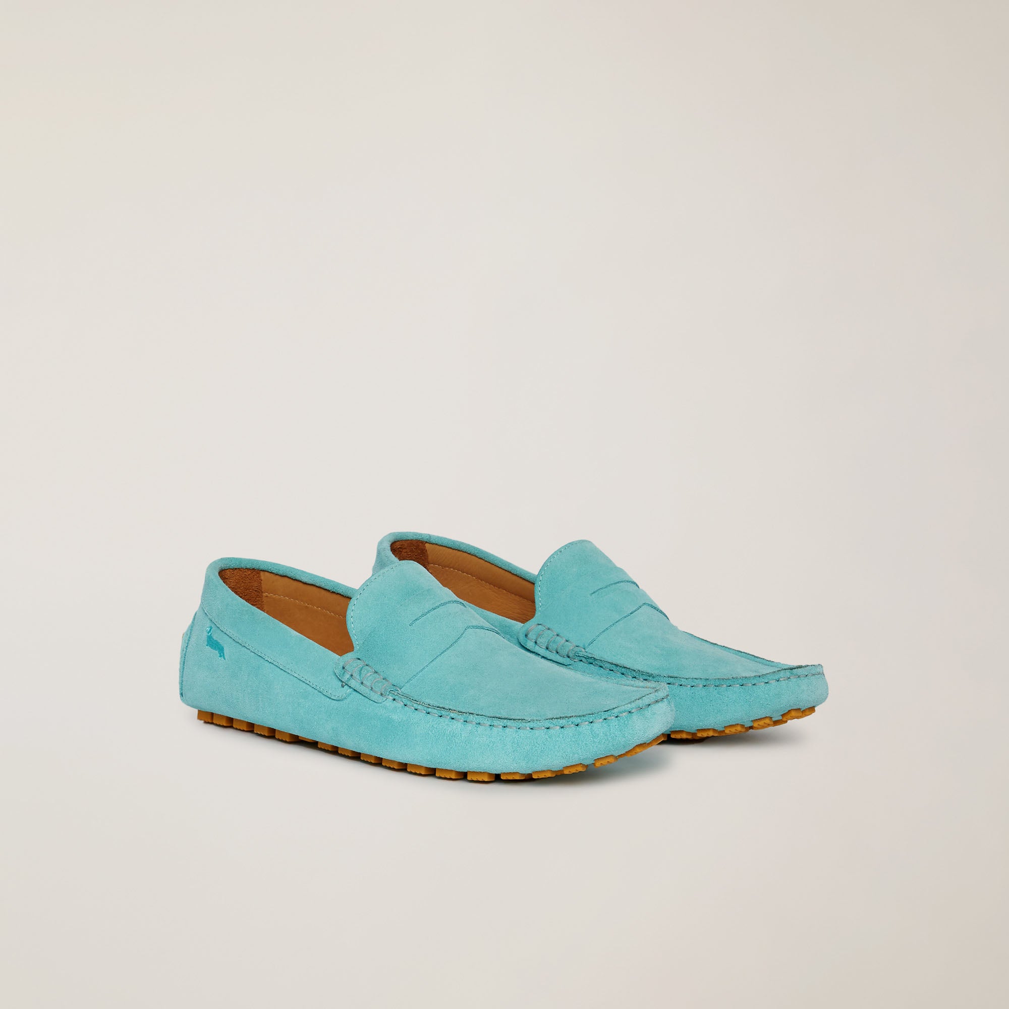 Classically styled loafer with refined lines, made entirely of soft suede. It is embellished with a detail in the same texture on the vamp that gives balance to the upper and a flexible sole with rubber cleats for an intriguing design. The iconic dachshund is embroidered on the side of the heel.