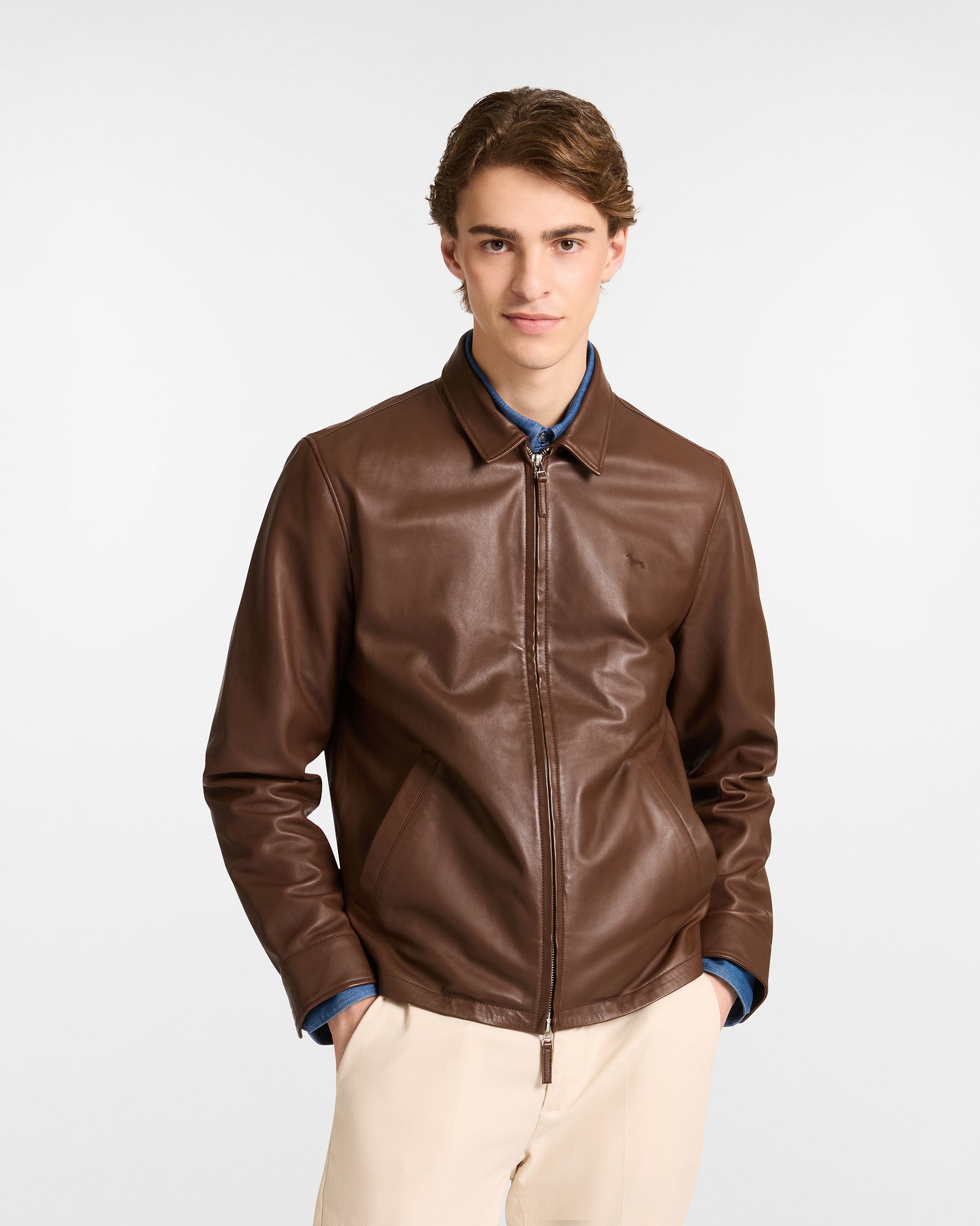 In the new collection, Harmont&Blaine reinterprets one of the most iconic pieces of men's wardrobe with a men's leather bomber jacket in a versatile solid color, perfect for completing your daily looks. The jacket features a shirt collar, two side pockets, wrist closure adjusters, and a double-slider zip closure. Inside, a practical pocket reveals a refined striped pattern. The model is finished with the brand's iconic mascot, the dachshund, embroidered in tone on the chest.