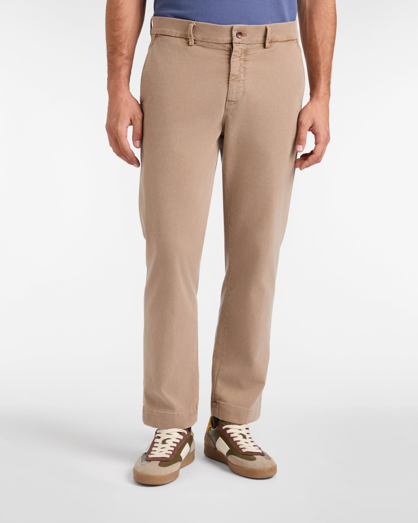 Harmont&Blaine, always attentive to environmentally respectful fashion, channels its passion for colors into the Earth Dye capsule: not just a selection of garments dyed with pigments extracted from the earth, but also a project to support the brand's first forest through a long-term collaboration with the Italian B Corp Treedom. These men's chino pants are made from slightly stretch cotton with a garment-dyed 3D effect and are characterized by a versatile nature-inspired color palette, perfect for effortlessly completing your mid-season outfits. The model, with a concealed zip and button closure, offers a comfortable regular fit and features belt loops, two slanted side pockets, and two welt back pockets, one of which is enhanced with the iconic tone-on-tone embroidered dachshund.