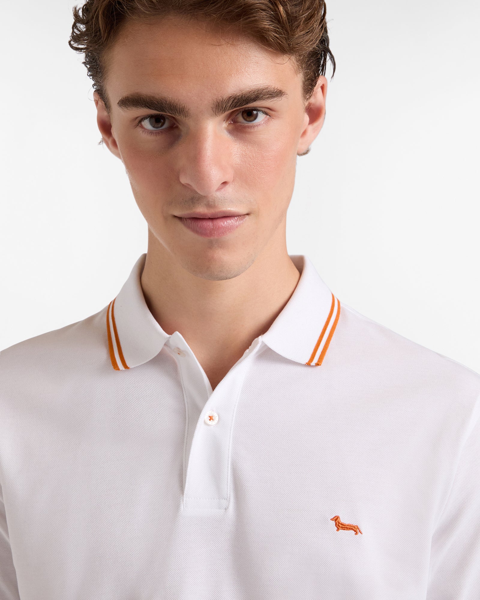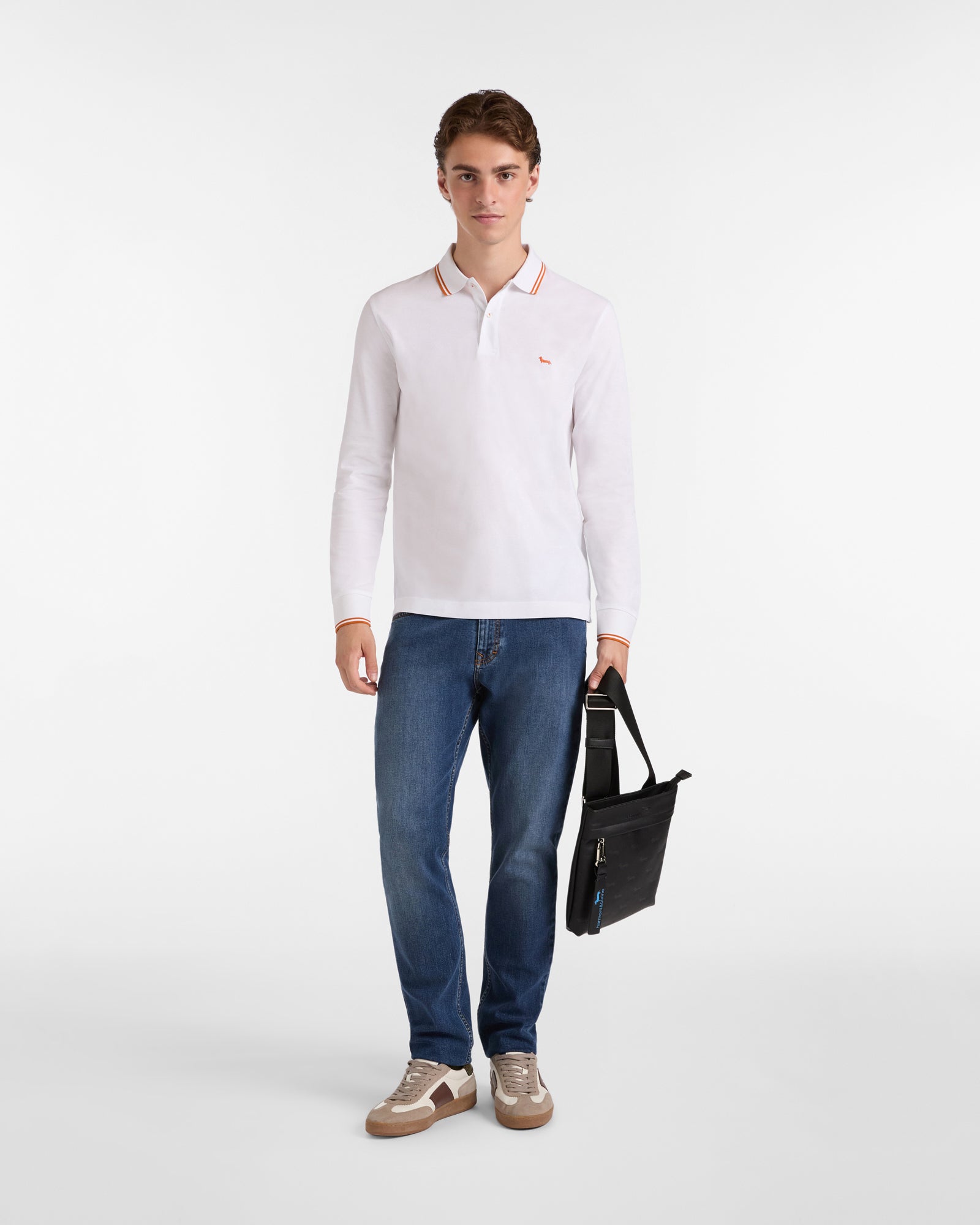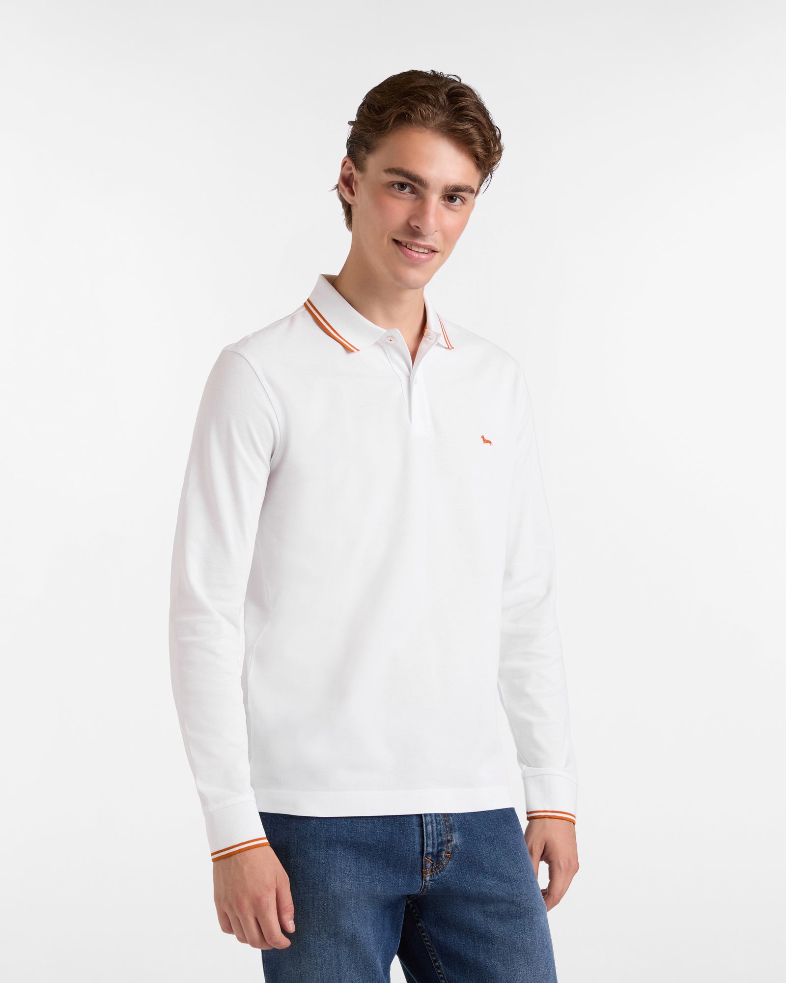 Harmont & Blaine presents an extremely versatile long-sleeved men's polo made from 100% mercerized cotton piqué, offered in a narrow fit, a slightly more fitted silhouette. The polo is embellished with subtle contrasting stripes at the collar edge and sleeve hem and is finished with the indispensable dachshund Blaine embroidered on the chest in the same tone as the stripes.