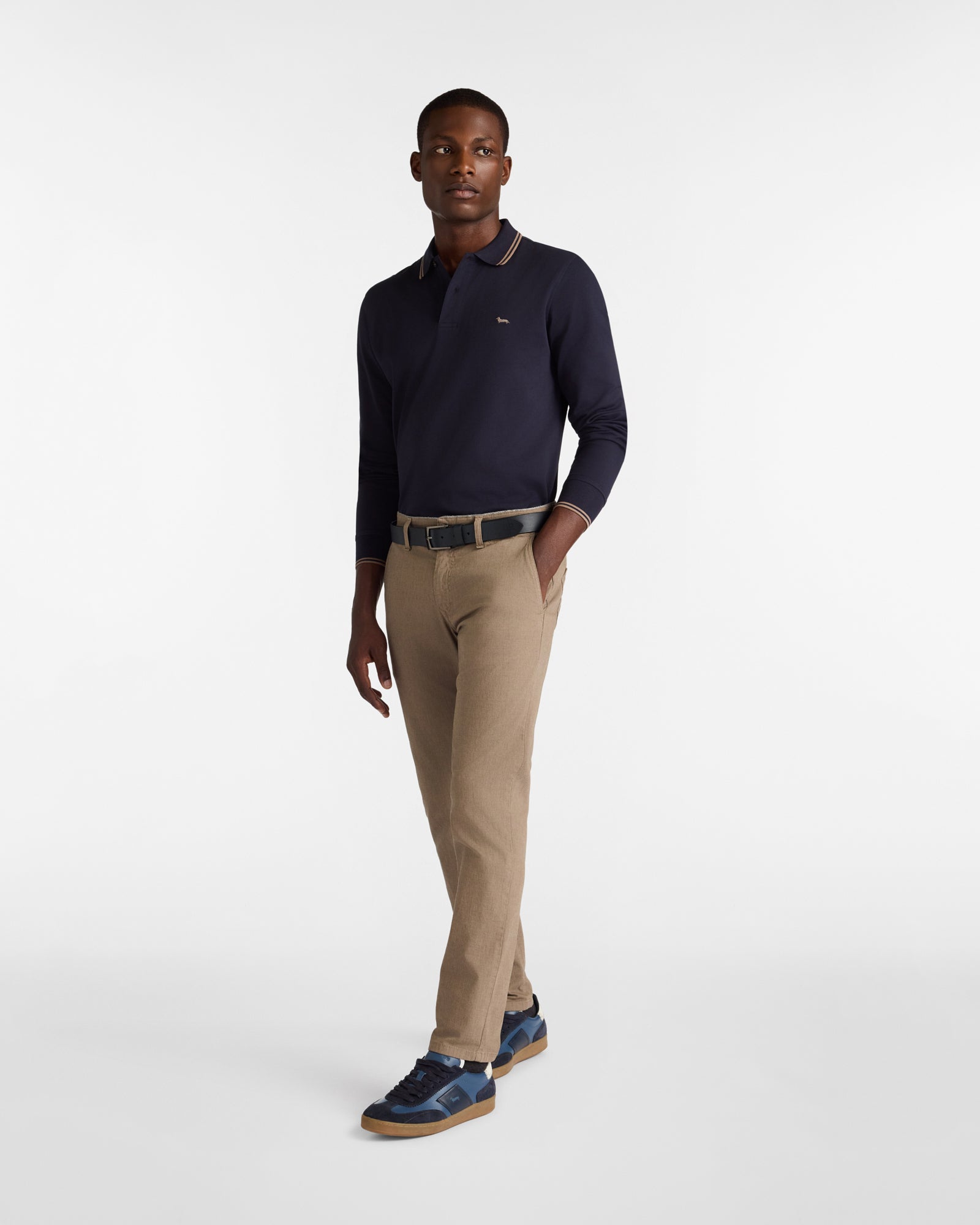 Harmont & Blaine presents an extremely versatile long-sleeved men's polo made from 100% mercerized cotton piqué, offered in a narrow fit, a slightly more fitted silhouette. The polo is embellished with subtle contrasting stripes at the collar edge and sleeve hem and is finished with the indispensable dachshund Blaine embroidered on the chest in the same tone as the stripes.