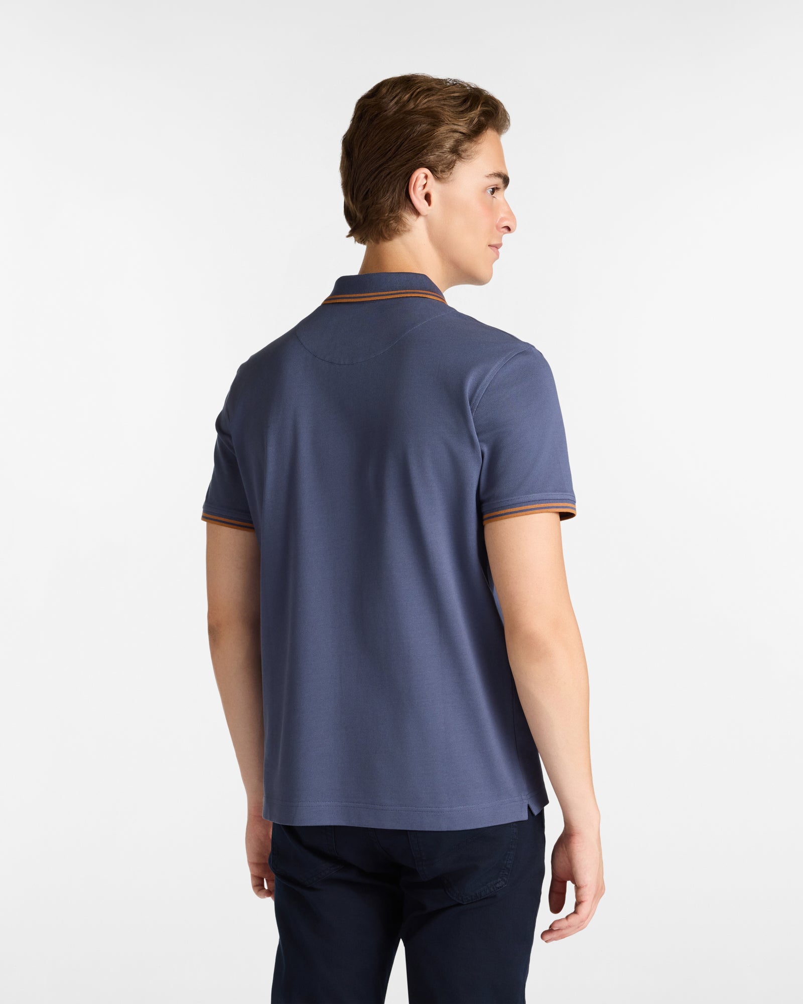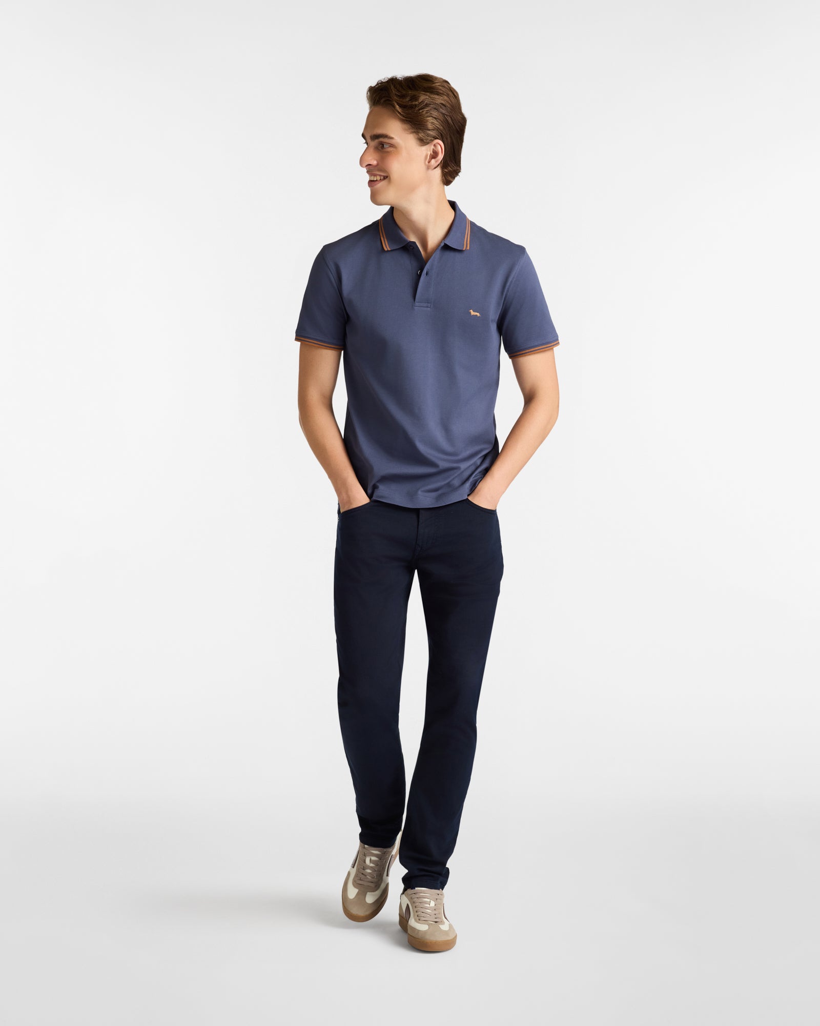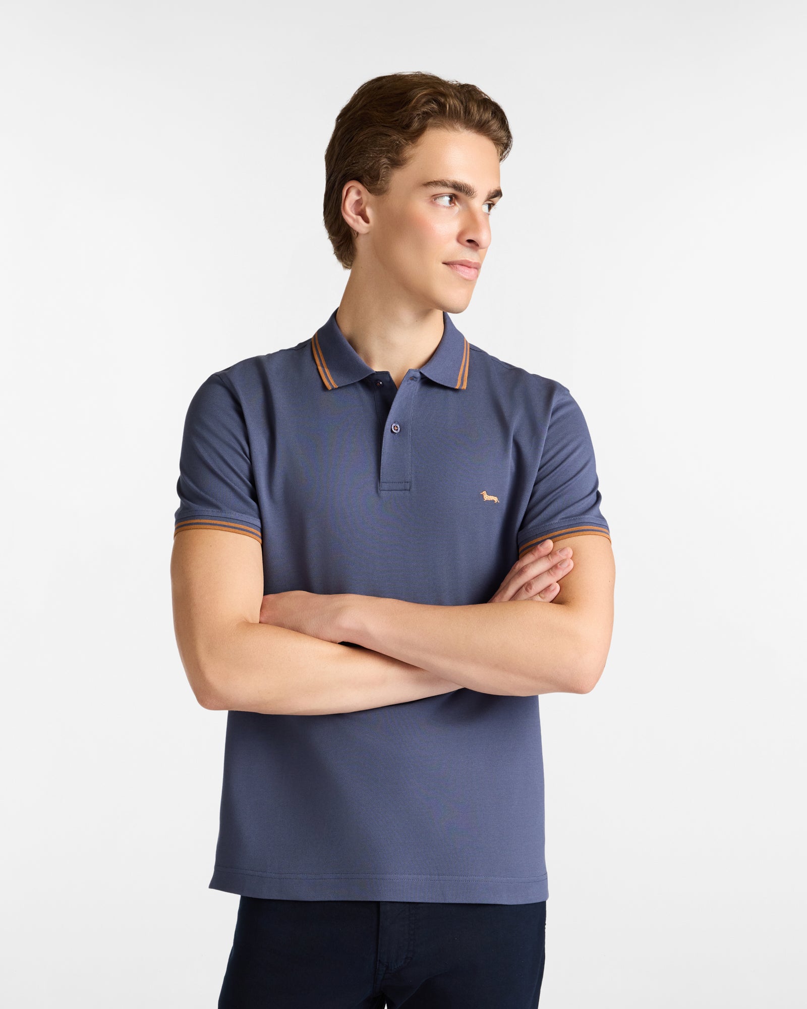 Harmont & Blaine presents an extremely versatile men's polo made from 100% mercerized cotton piqué, offered in a narrow fit, a slightly more fitted silhouette. The polo is embellished with subtle contrasting stripes at the collar edge and sleeve hem and is finished with the indispensable dachshund Blaine embroidered on the chest in the same tone as the stripes.