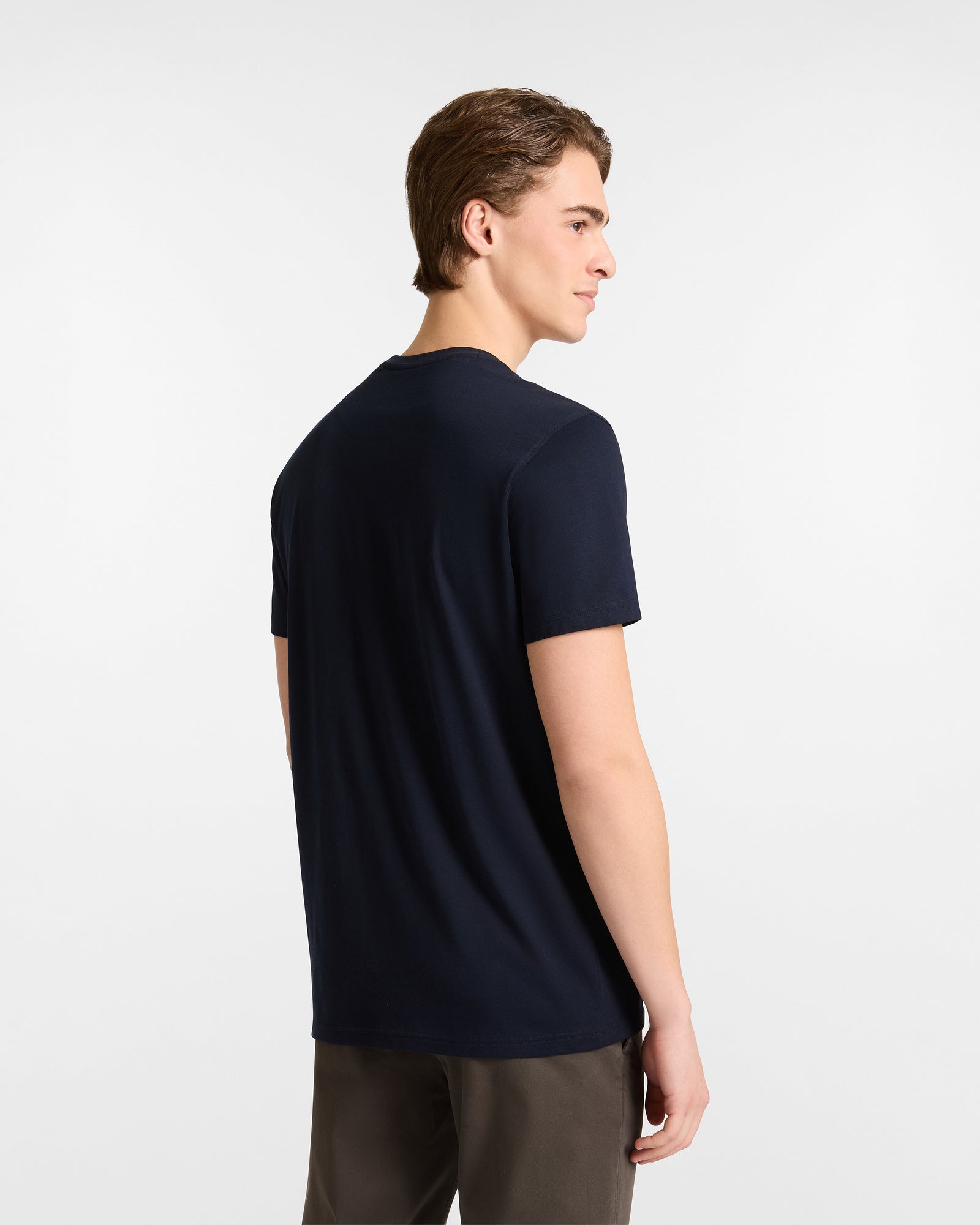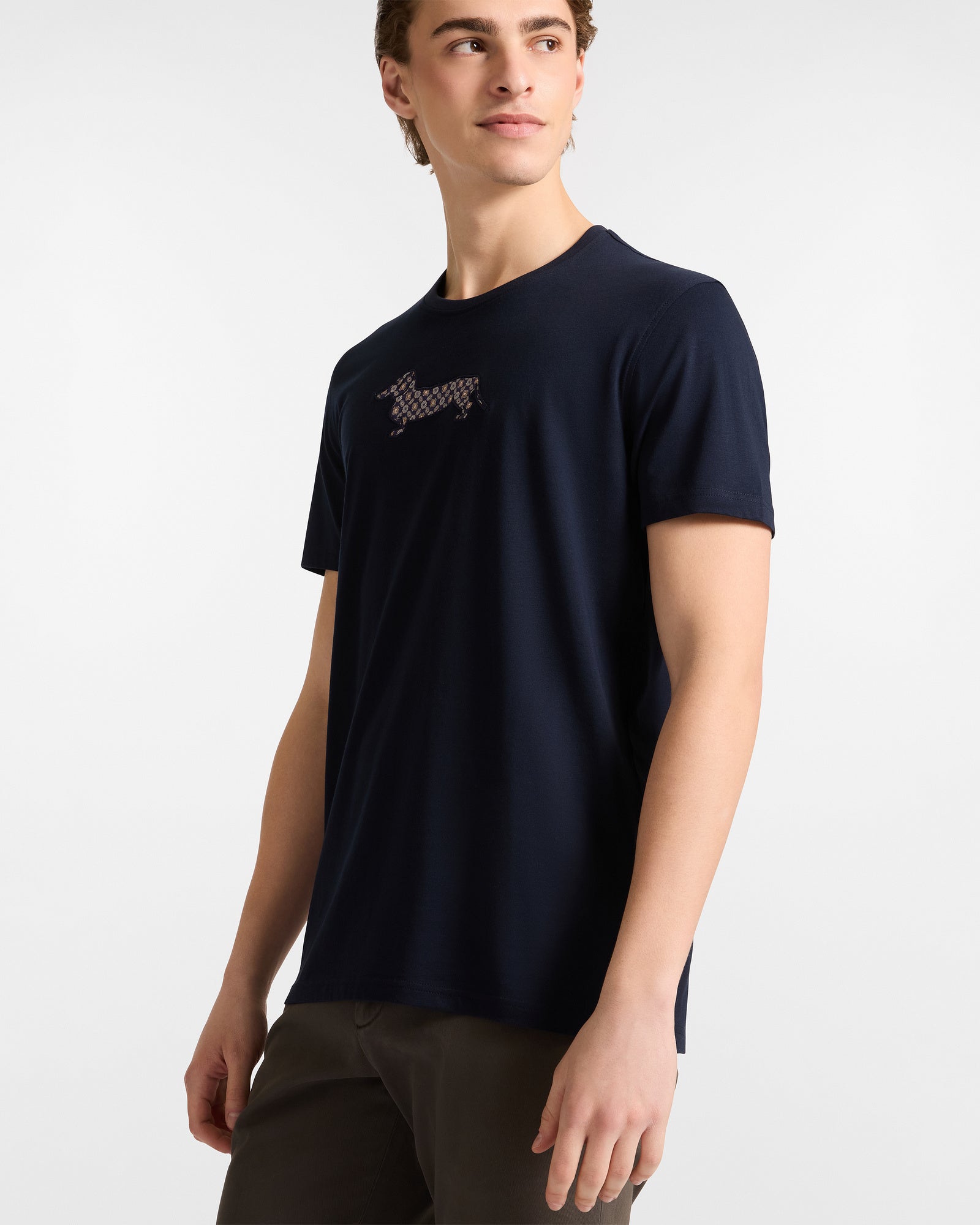 This men's short-sleeve crew neck T-shirt made from pure cotton jersey is the ideal piece to complete your everyday outfits thanks to its versatile solid color and comfortable regular fit that doesn't restrict movement. However, the true star of the model is the iconic Harmont&Blaine dachshund, featured on the chest as a maxi embroidery with an elegant necktie-inspired motif.