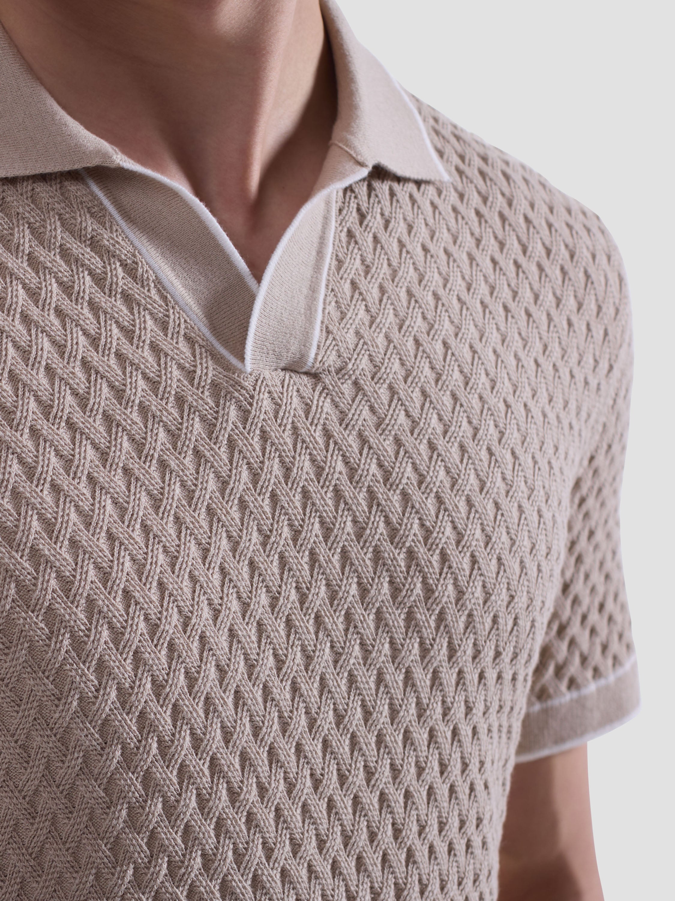 This Johnny collar short-sleeve polo is crafted from a comfortable polyester-cotton-linen blend and features a unique mixed media pattern, complemented by a solid contrast collar and cuffs with contrast tipping detail. Side vents ensure ease of movement and breathability, making it perfect for warm days. This stylish polo is an essential addition to your collection, perfect for both relaxed weekends and casual outings.