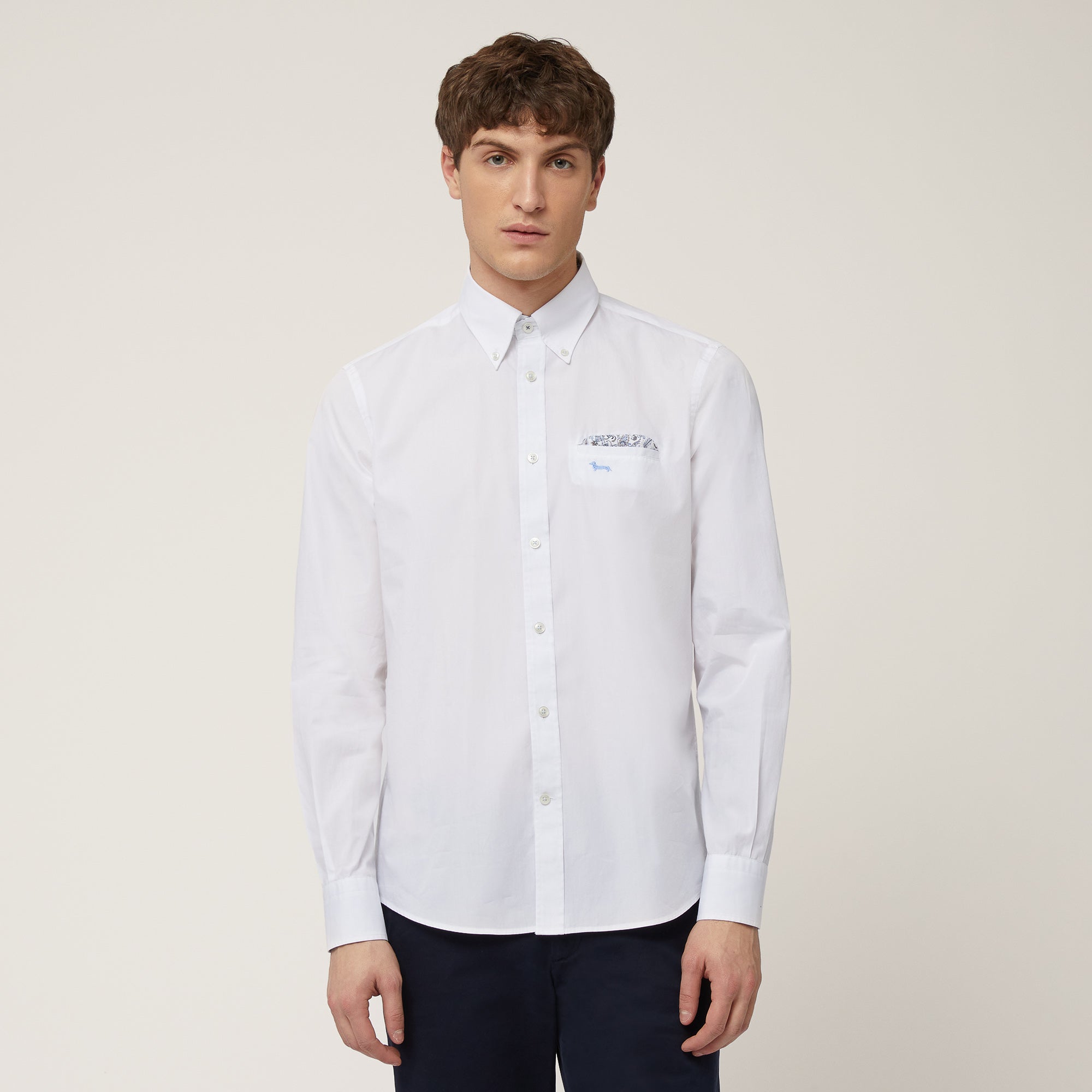The quintessential versatile garment, the men's shirt, is reinterpreted by Harmont & Blaine in a minimalist yet sophisticated version made of 100% cotton, in a comfortable regular fit. The design features a practical button-down collar and a back with a pleated background yoke, but the real star is the breast pocket, finished with the emblematic contrasting embroidered dachshund, capable of turning into a pouch with a ramage pattern.