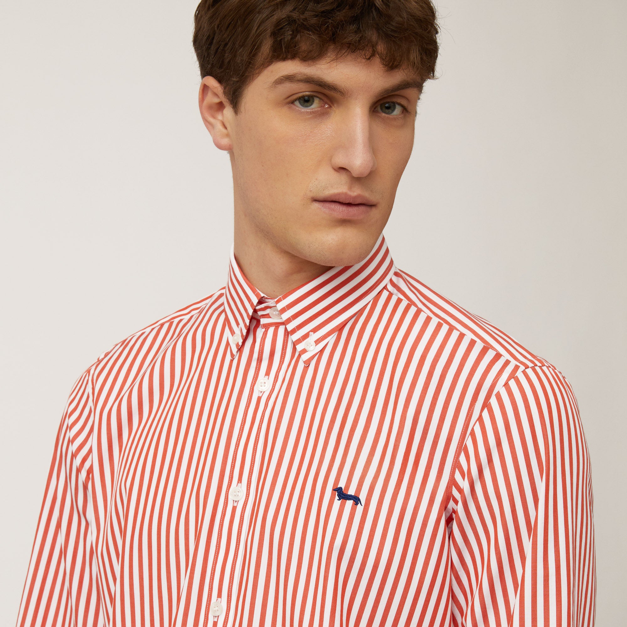 Made of cool and breathable cotton, this men's shirt by Harmont & Blaine features an all-over vertical striped pattern and the iconic dachshund embroidered on the chest. The garment, which comes in a comfortable regular fit, is complemented by a practical button-down collar and a refined yoke with a pleated background on the back.
