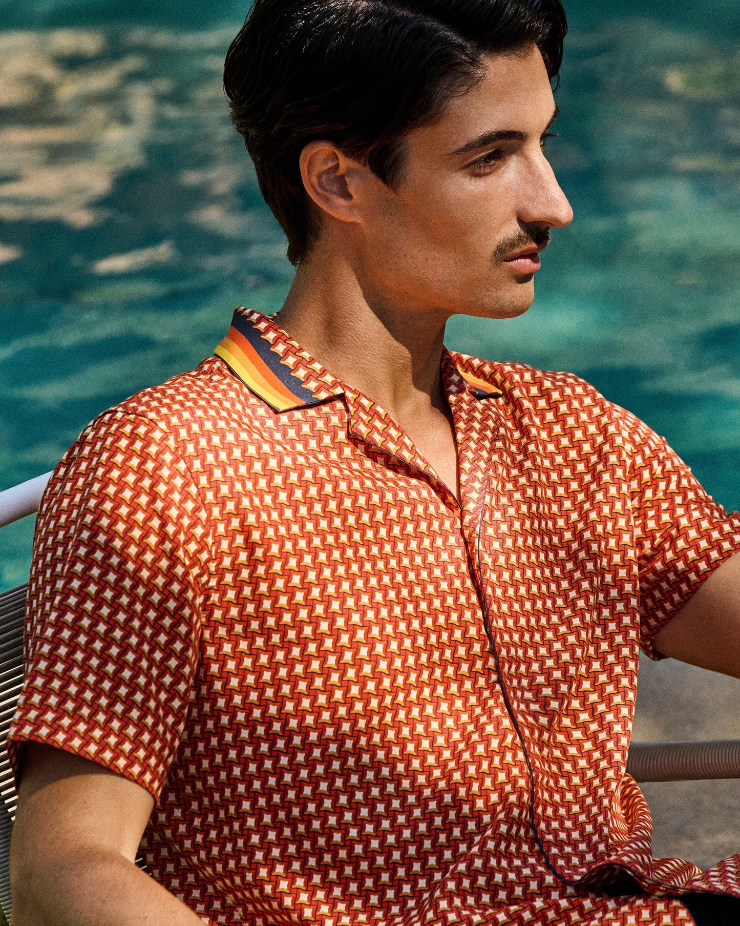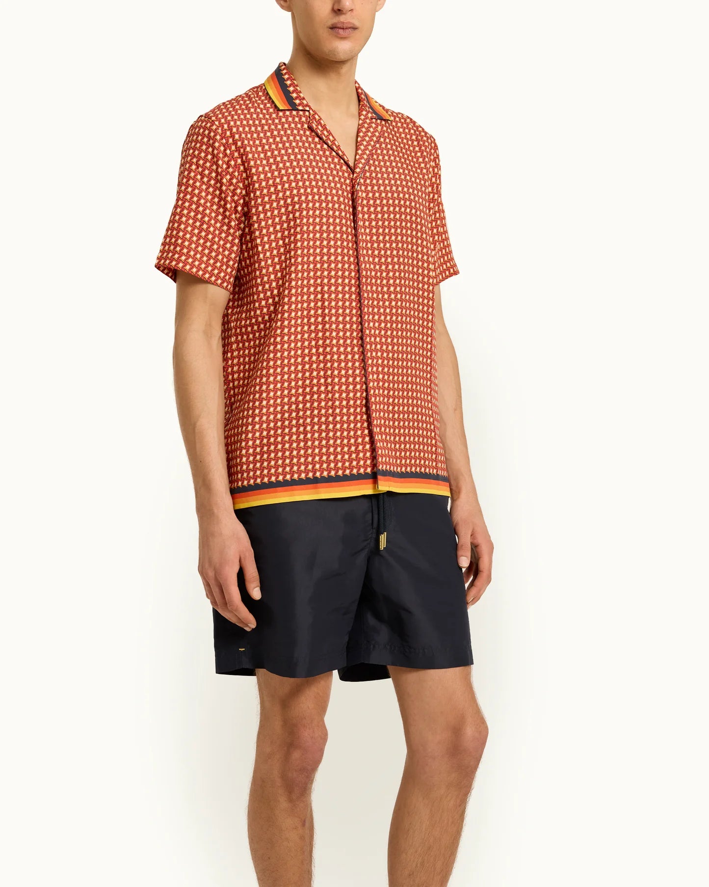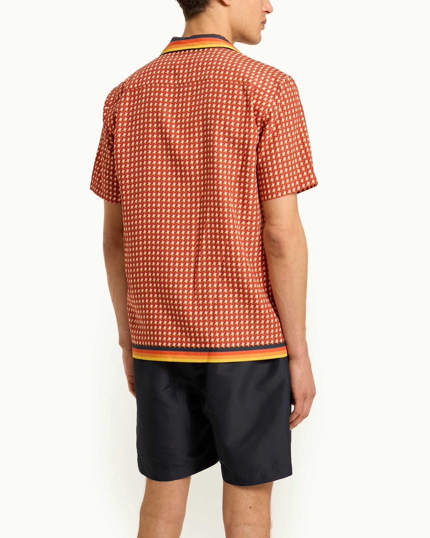 Energetic, confident and creative; that's our Maitan Piscina shirt. In warming Calypso Orange, this exclusive print combines pool-inspired geometric shapes with gradient-striped piping along the capri collar, resulting in a charming clash of patterns. The relaxed fit and concealed button placket don't over-complicate the design, allowing the print to shine.