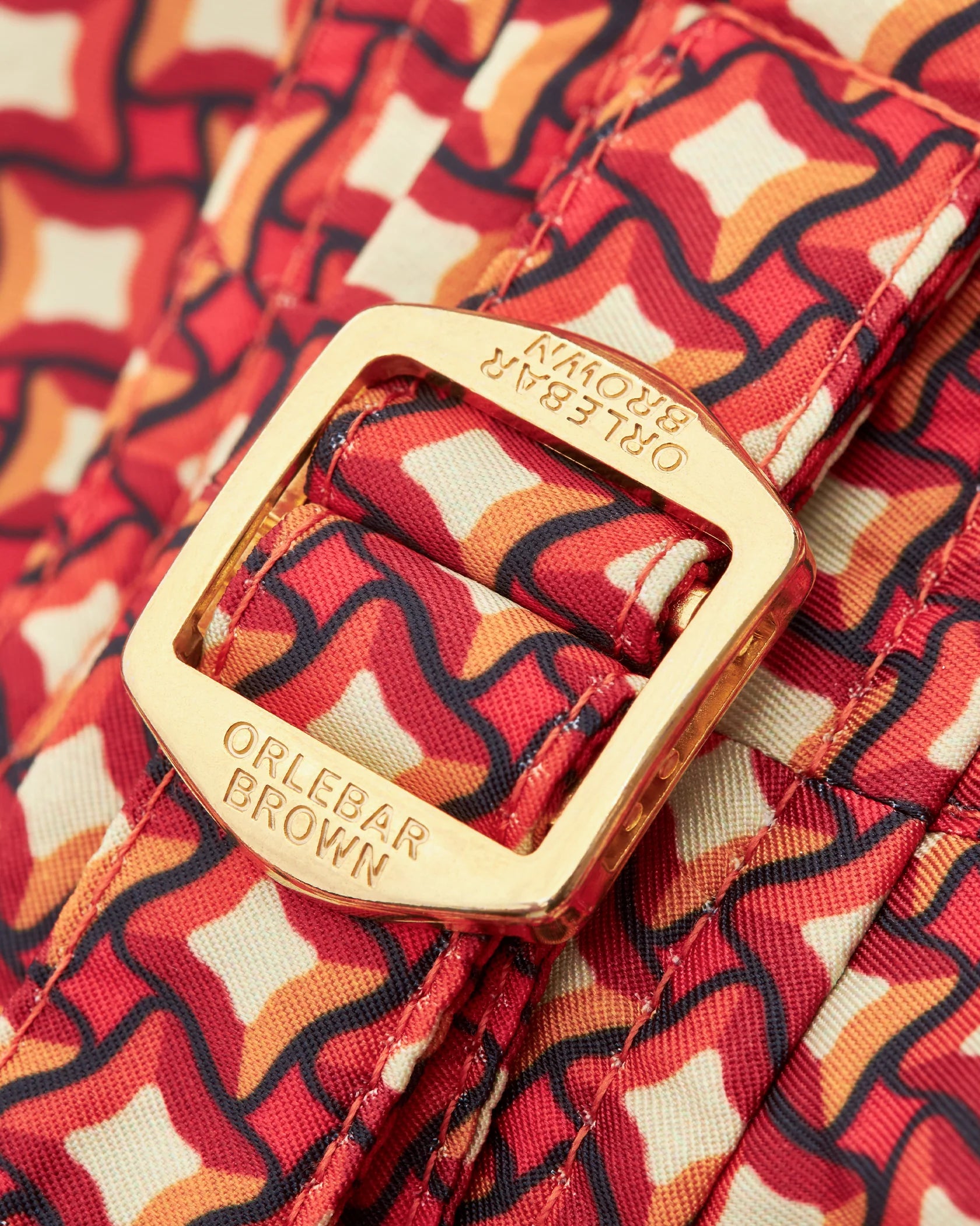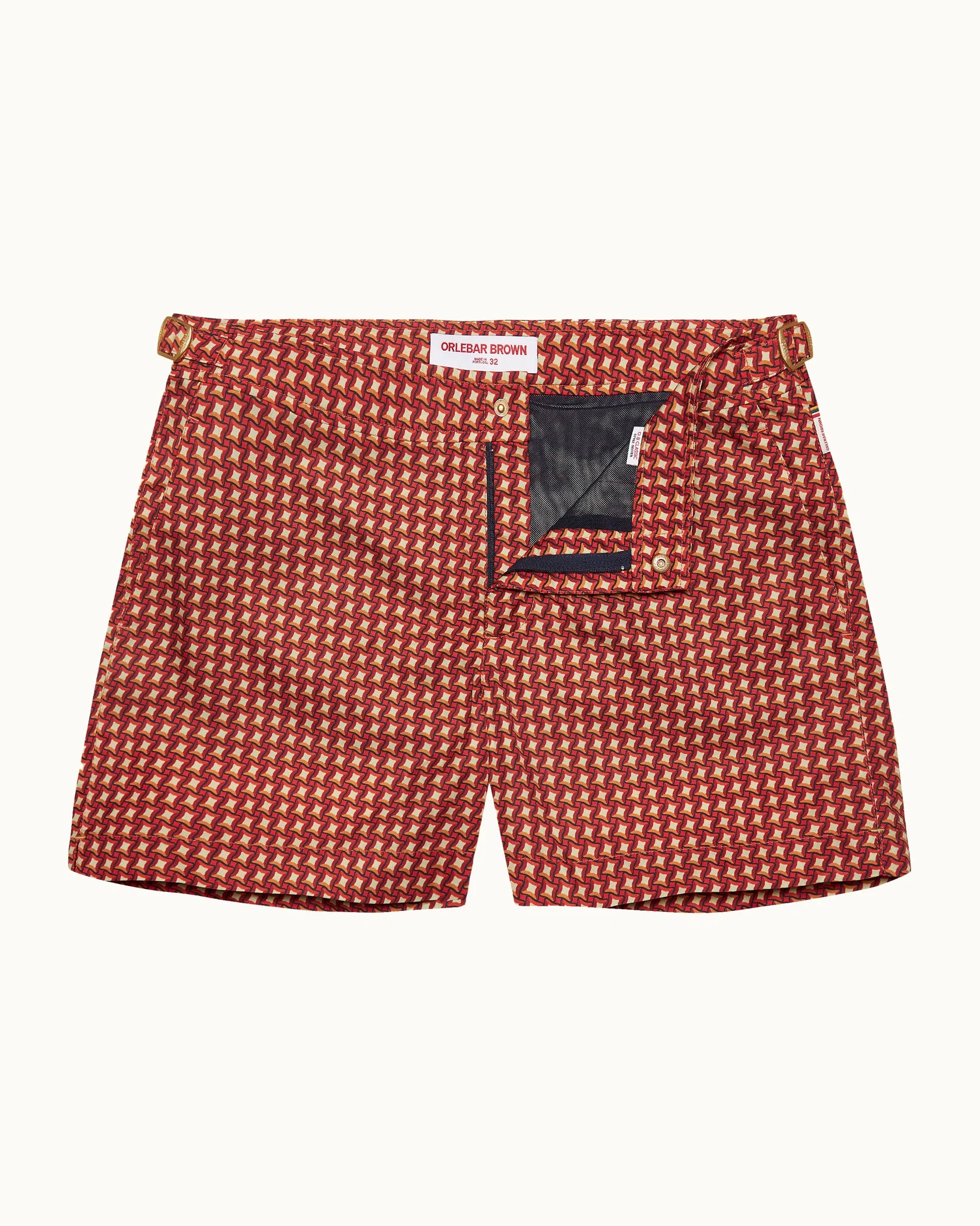 In fiery Calypso Orange, our impactful Piscina print demands attention. Designed exclusively in-house, the statement print comprises expressive colour and geometric patterning underscored by gold-tone side fasteners. In our signature shorter-length fit, these tailored Setter swim shorts are made for the pool.