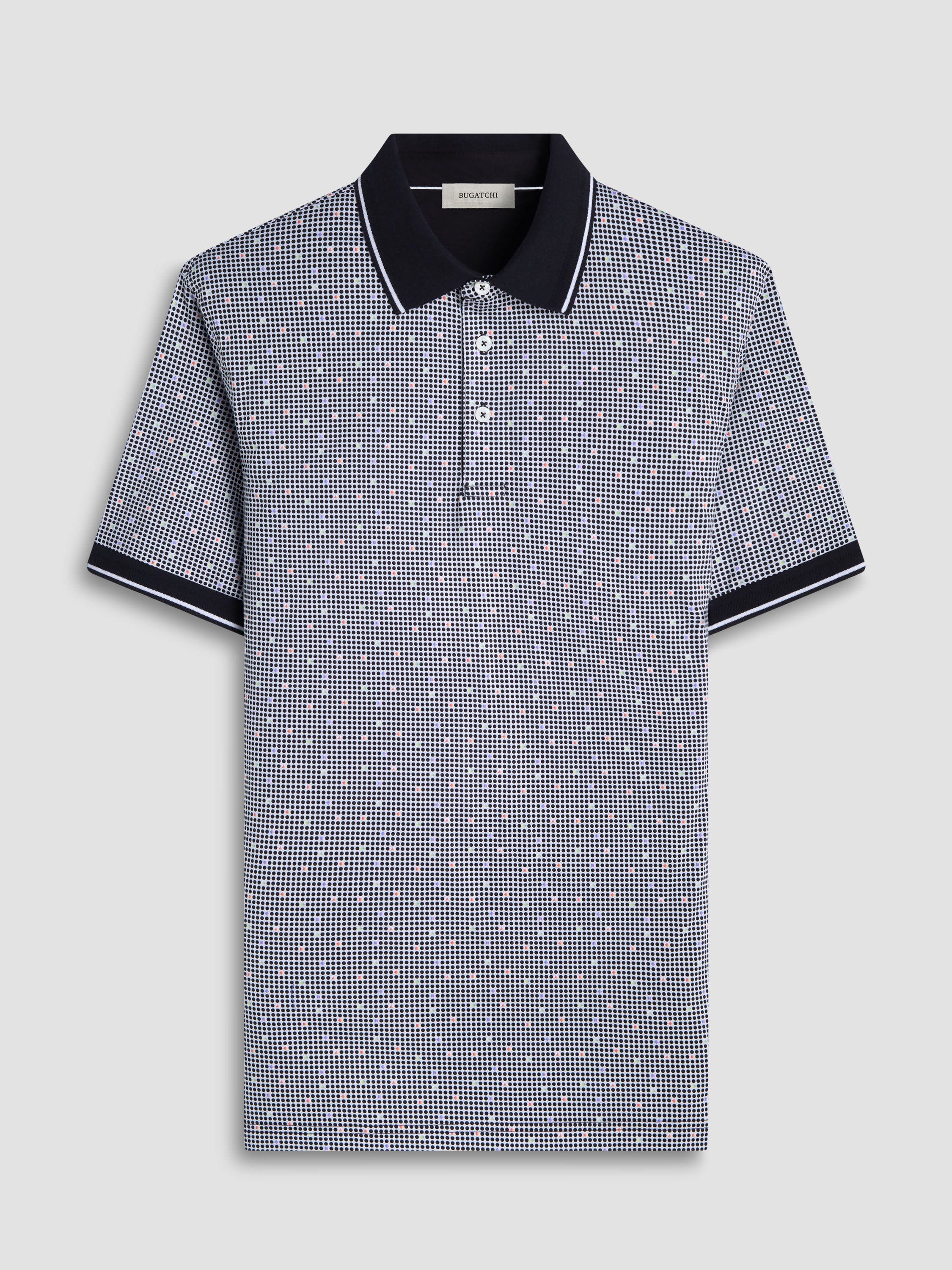 The Vance OoohCotton® short-sleeved polo shirt in geometric print featuring a three-button placket, mother-of-pearl buttons, and contrast-tipped solid rib collar and cuffs, is perfect for casual days and the golf course. OoohCotton® is a performance, double-mercerized, wrinkle-resistant, breathable, and easy-care cotton blend with 8-way stretch, quick-dry, and thermal comfort properties.