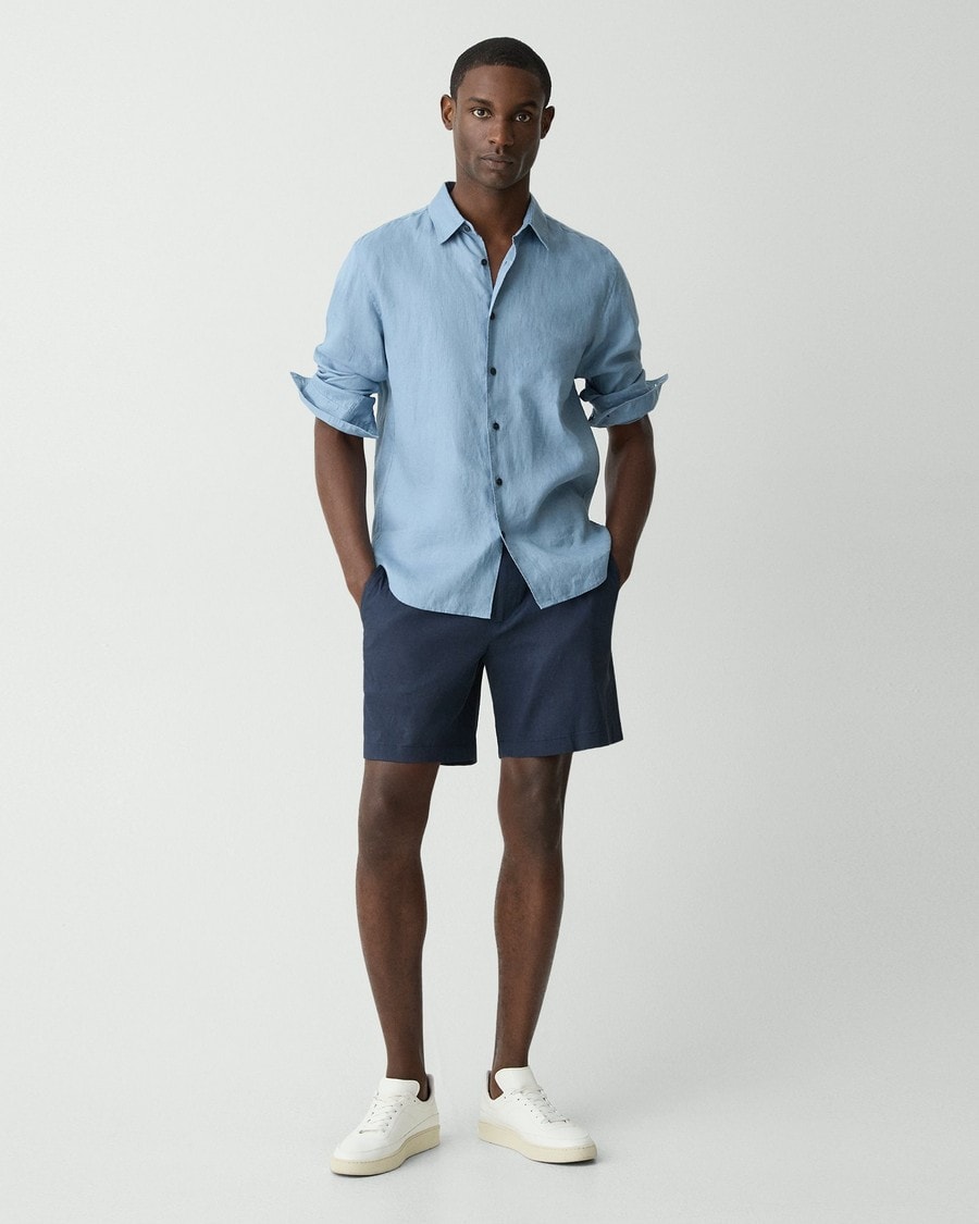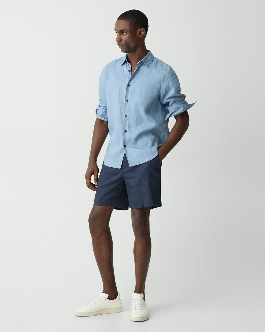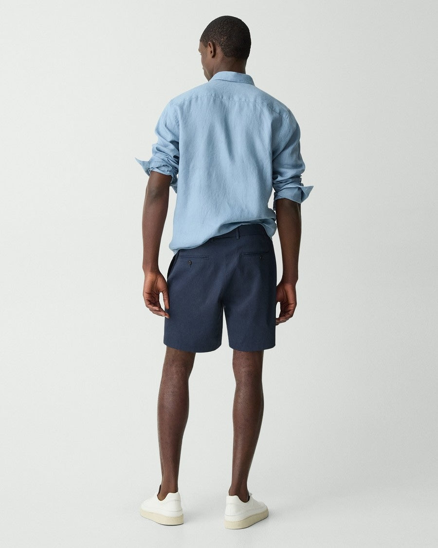 The Curtis short is designed to look clean on the leg in an easy fit that tapers at the hem and sits neatly above the knee. This version features an internal drawstring waistband and is crafted from lightweight Good Linen enhanced with stretch for easy movement.