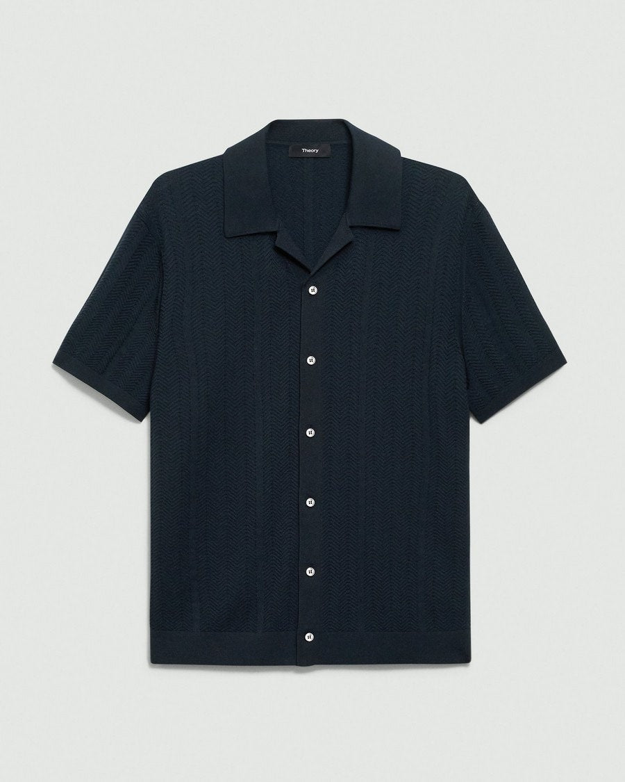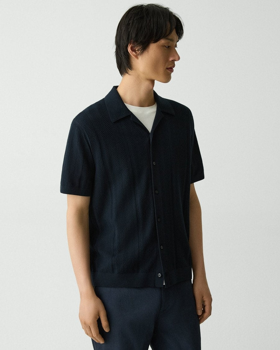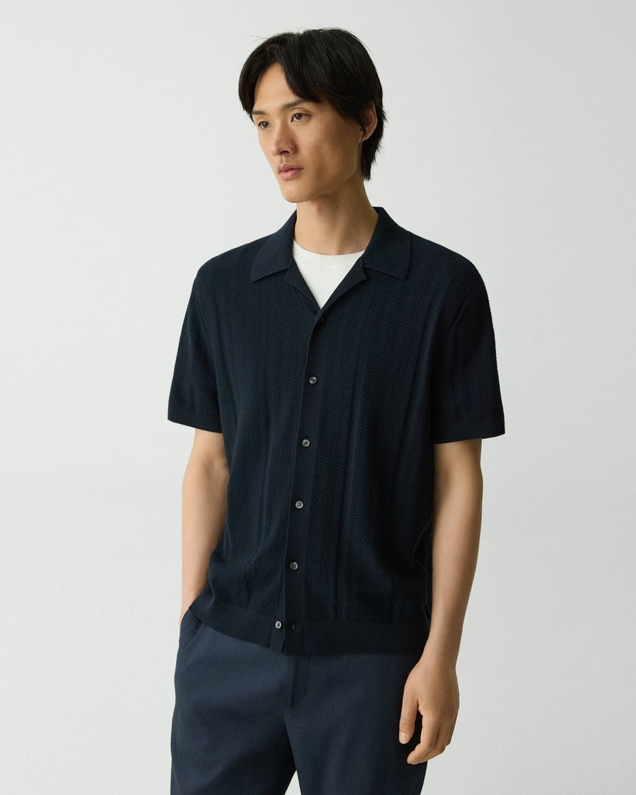 Detailed with a camp collar and subtle chevron detailing, this elevated take on the classic button-up is crafted in a high-twist cotton blended with nylon. This versatile style can be worn open with a tee or fully buttoned solo.