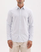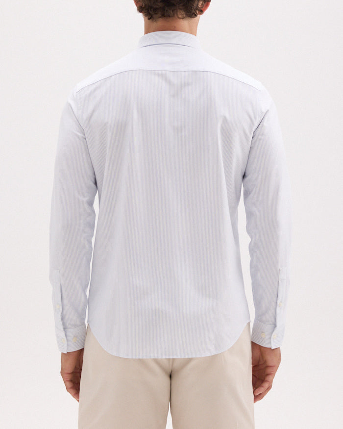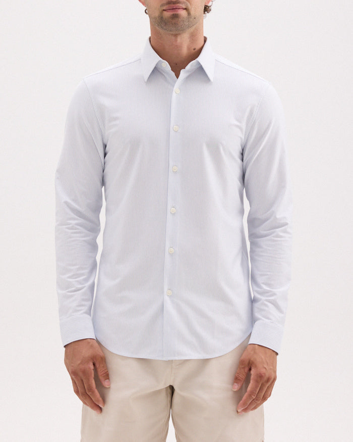 A tailored style with minimal detailing, our Sylvain shirt is designed with a structured point collar, two darts in the back for a refined fit, and a longer hem that’s easy to tuck in. Cut from a banker striped cotton blend fabric produced in Japan with a wrinkle-free construction and UV-protective weave, this everyday button-up pairs well with denim and tailored trousers alike.