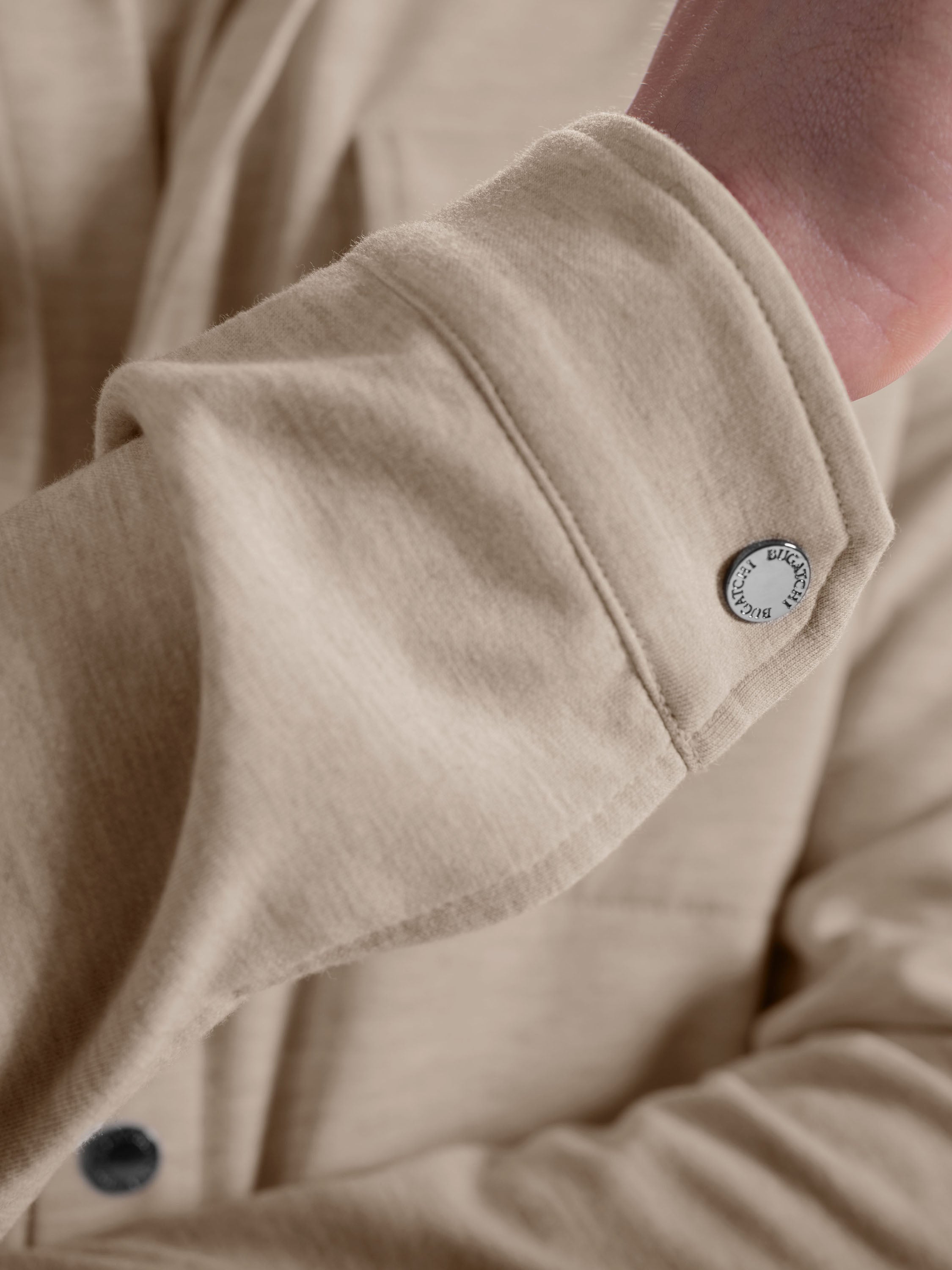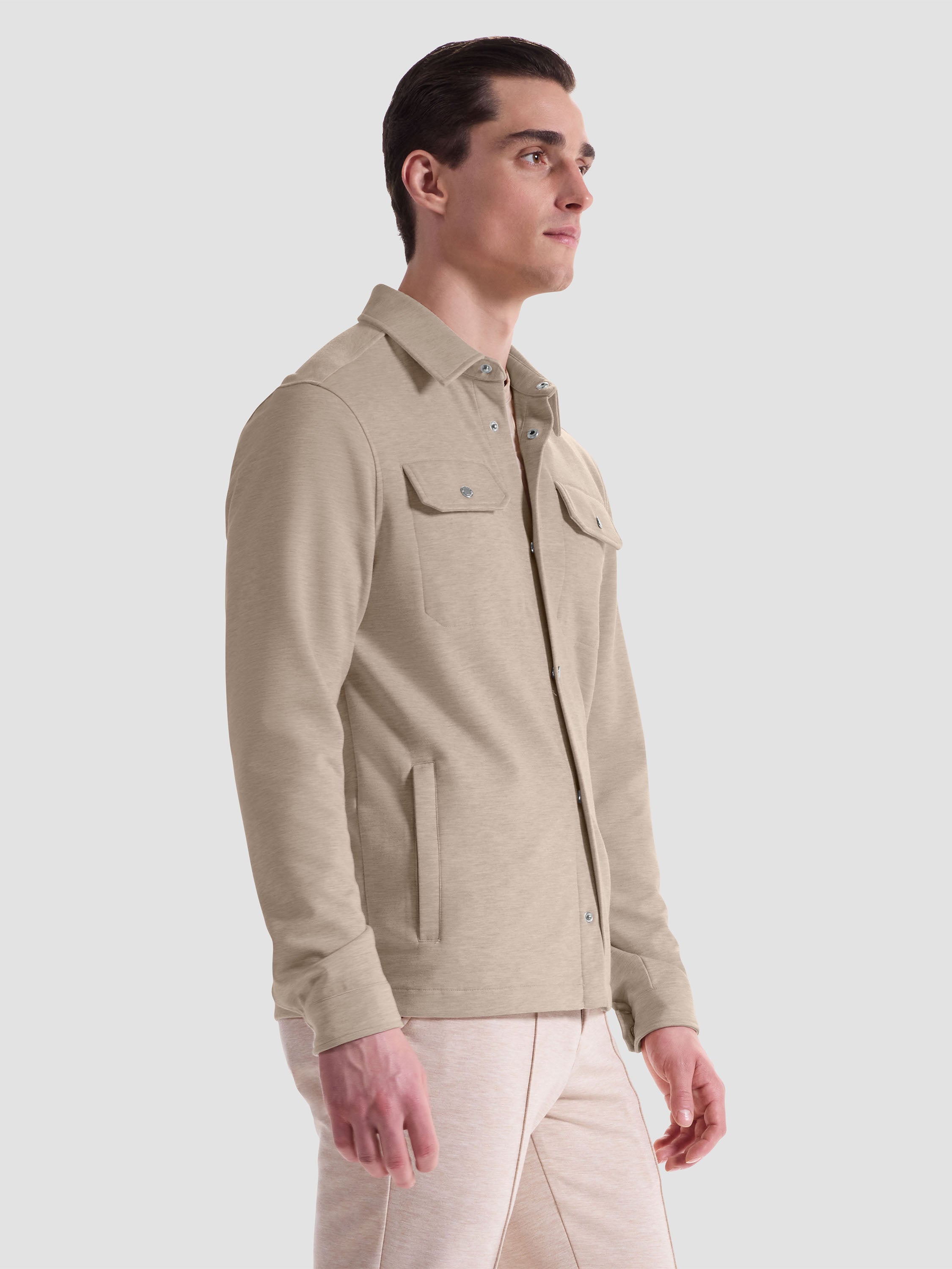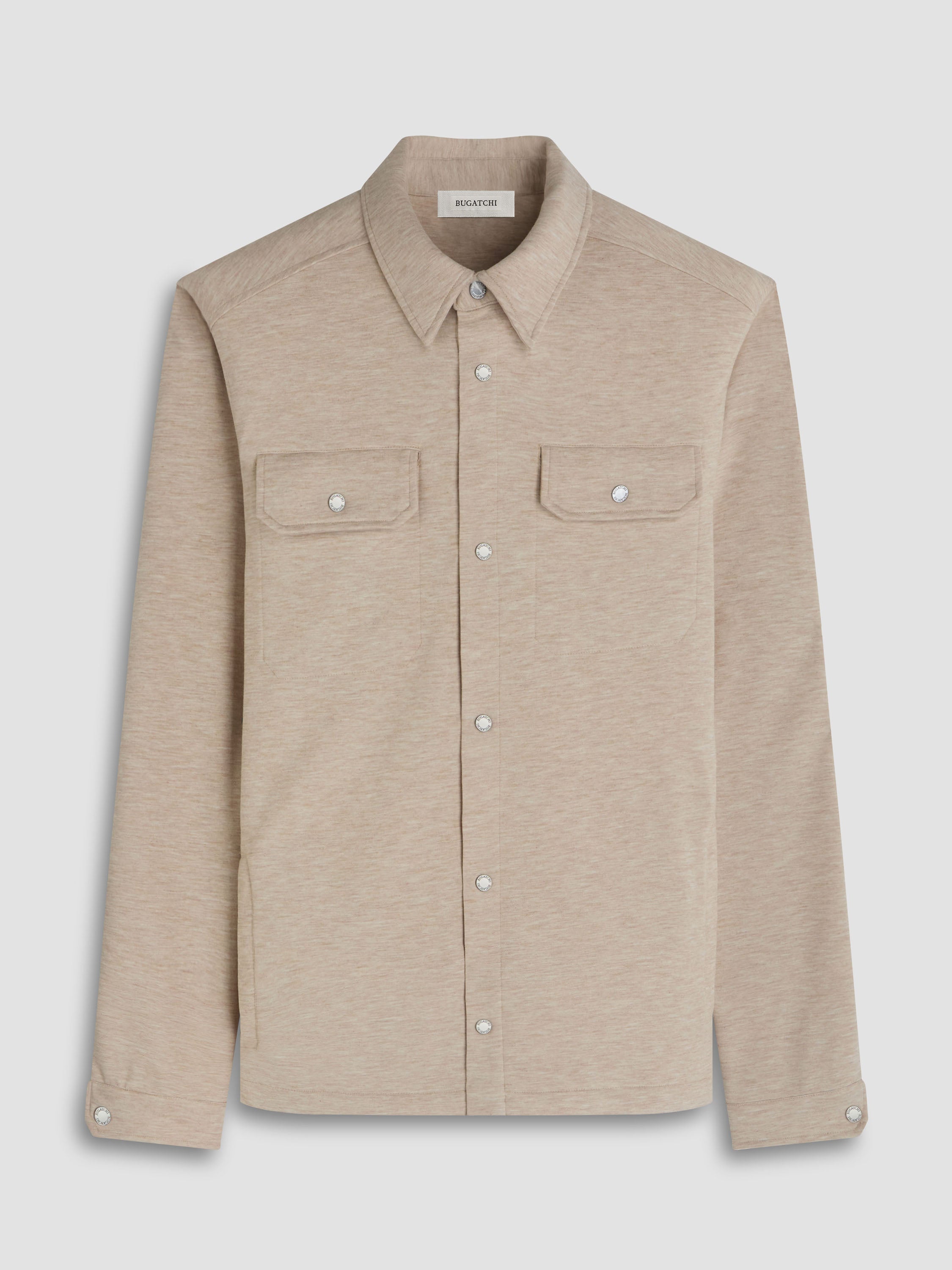 Crafted from Soft Touch™ performance fabric in a subtle melange pattern, this versatile knit shirt features, a full snap-front closure, straight hem, and point collar. Includes two chest pockets with flaps and snaps, two side pockets with covered zippers, and cuffs with snaps. Ideal for casual layering and transitional weather.