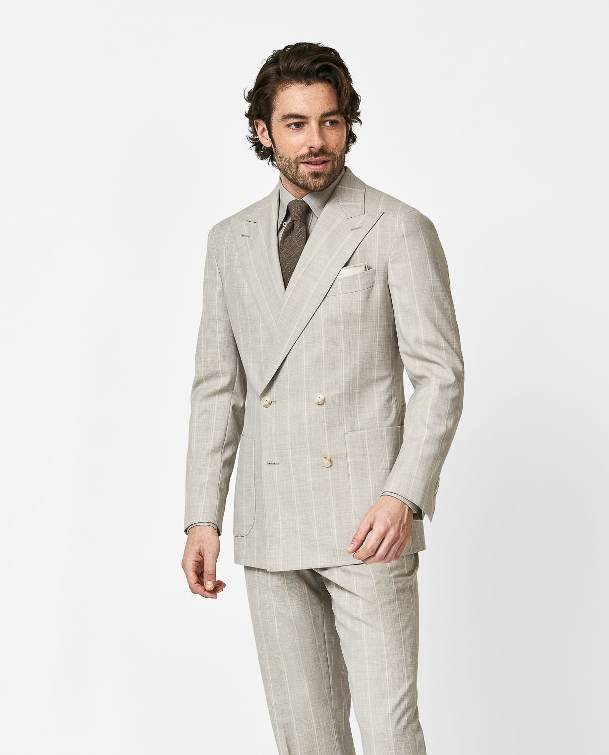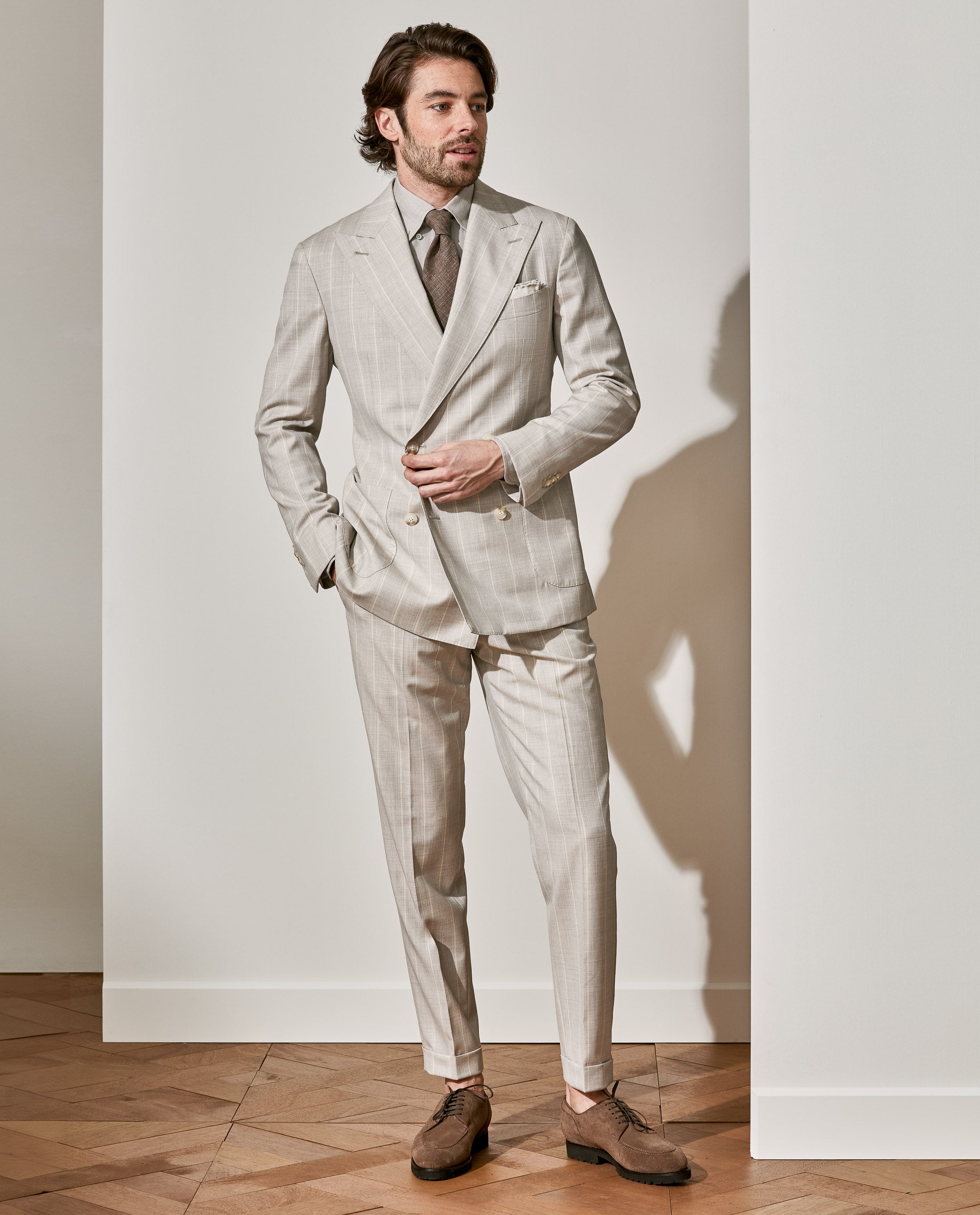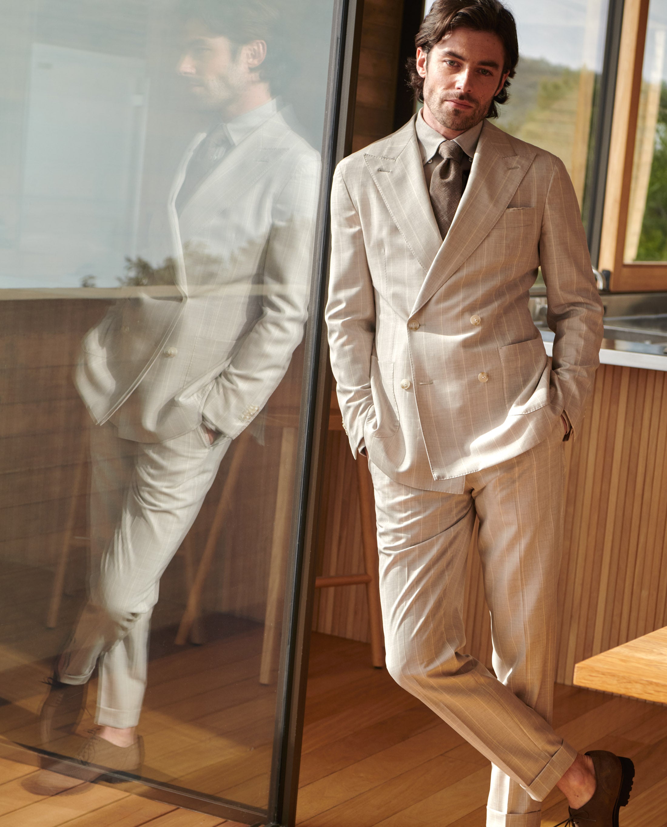 Classic office style with a distinctly summer feel, this suit refreshes an office stripe with natural tones and softness for comfort from nine to five. Styled with various summer blends – a sand modal-wool shirt, dark taupe stretch wool-linen blend tie, and bone silk-cotton pocket square – and suede lightweight bluchers.
