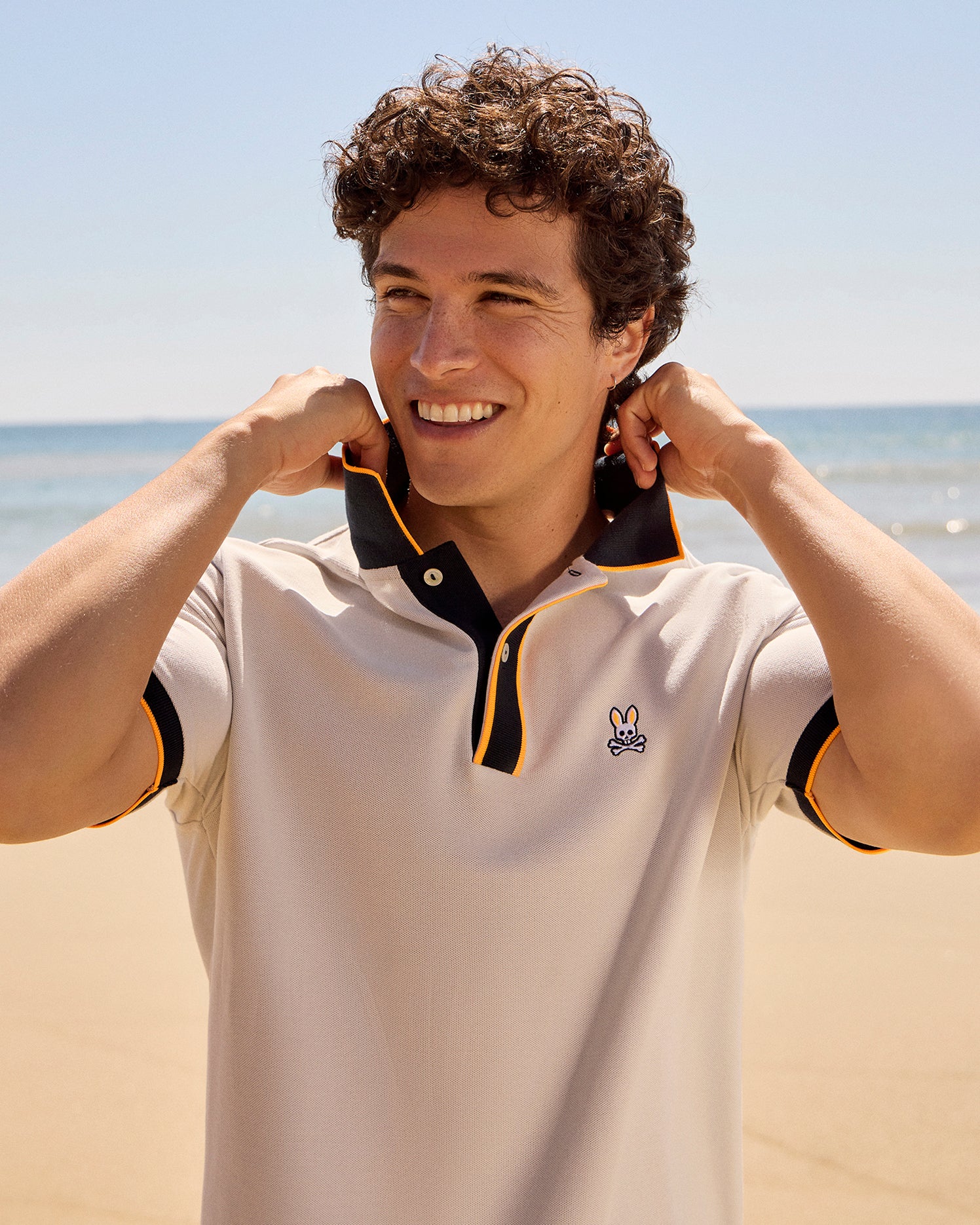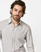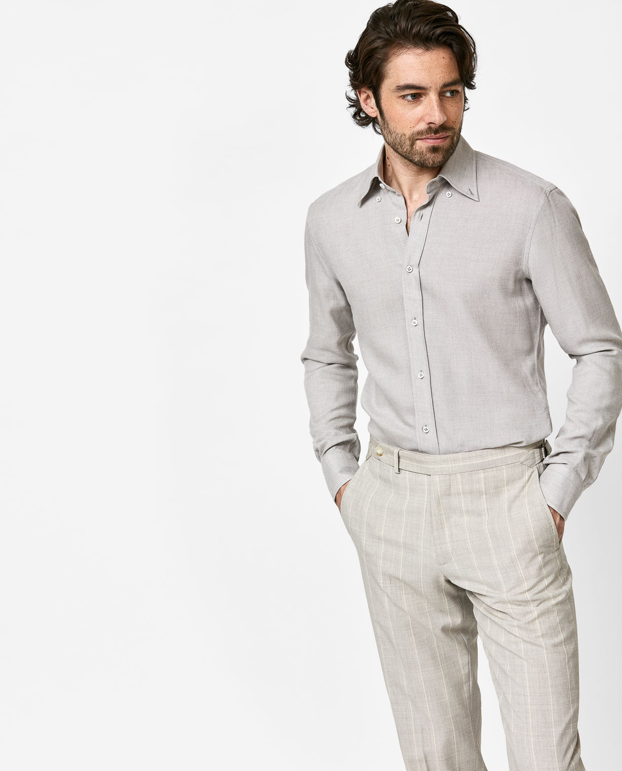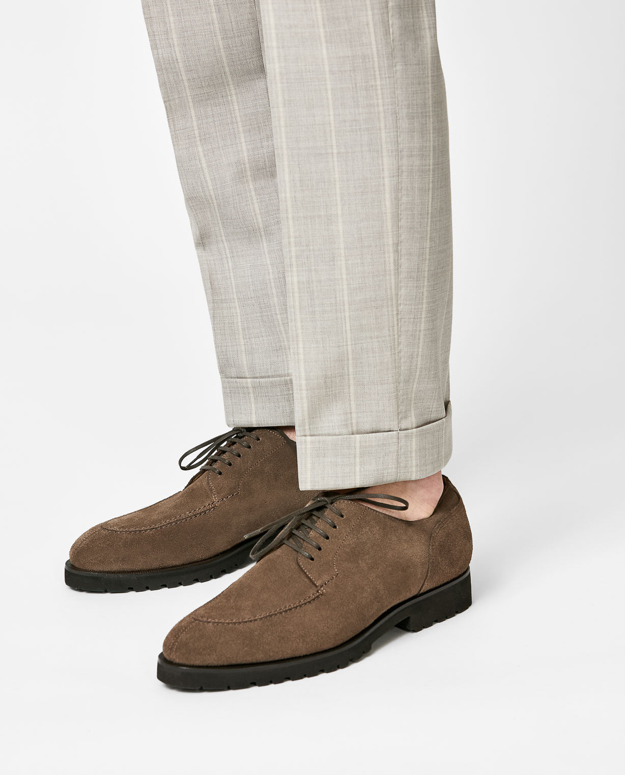 Classic office style with a distinctly summer feel, this suit refreshes an office stripe with natural tones and softness for comfort from nine to five. Styled with various summer blends – a sand modal-wool shirt, dark taupe stretch wool-linen blend tie, and bone silk-cotton pocket square – and suede lightweight bluchers.