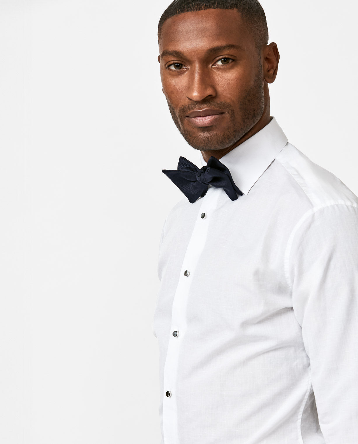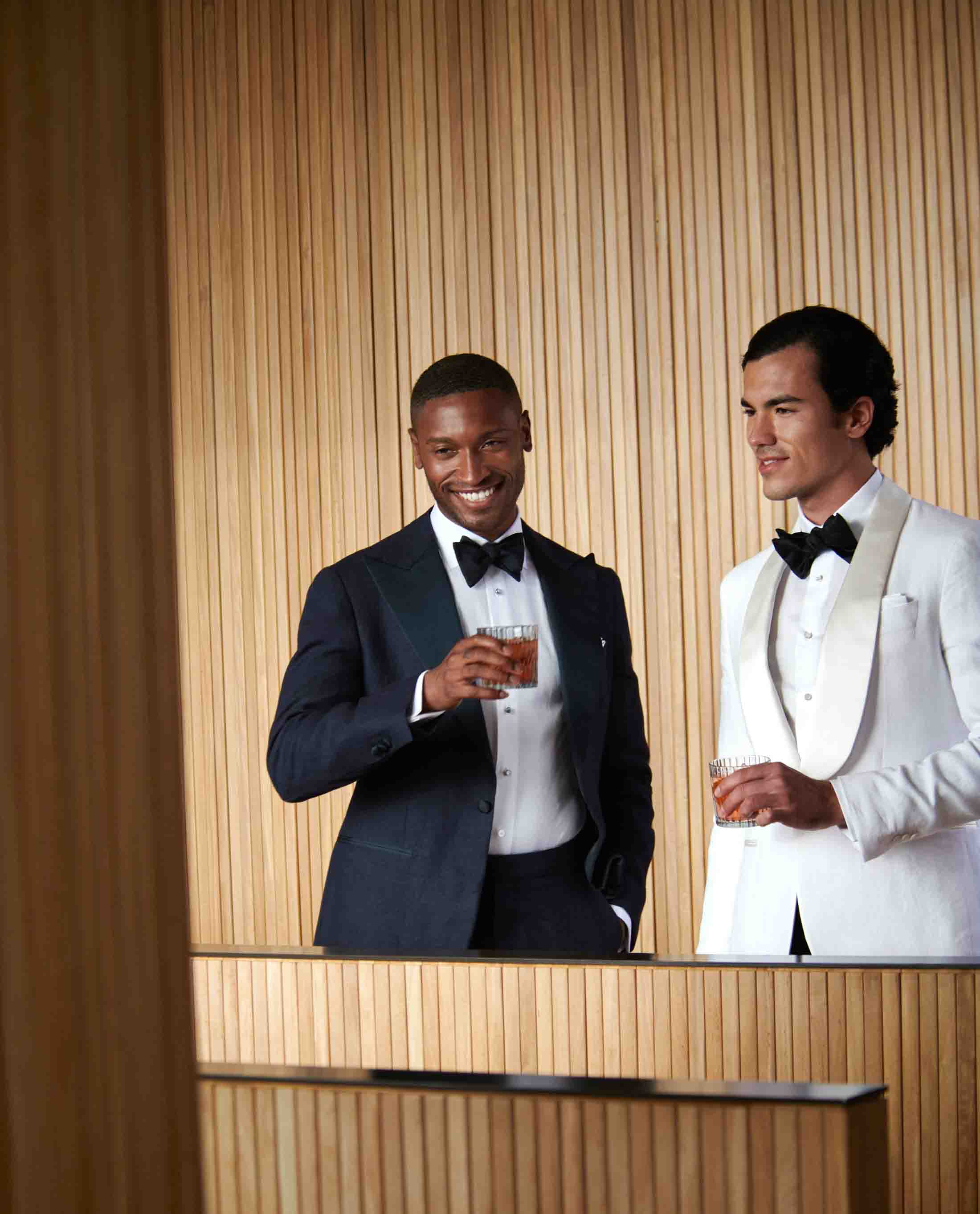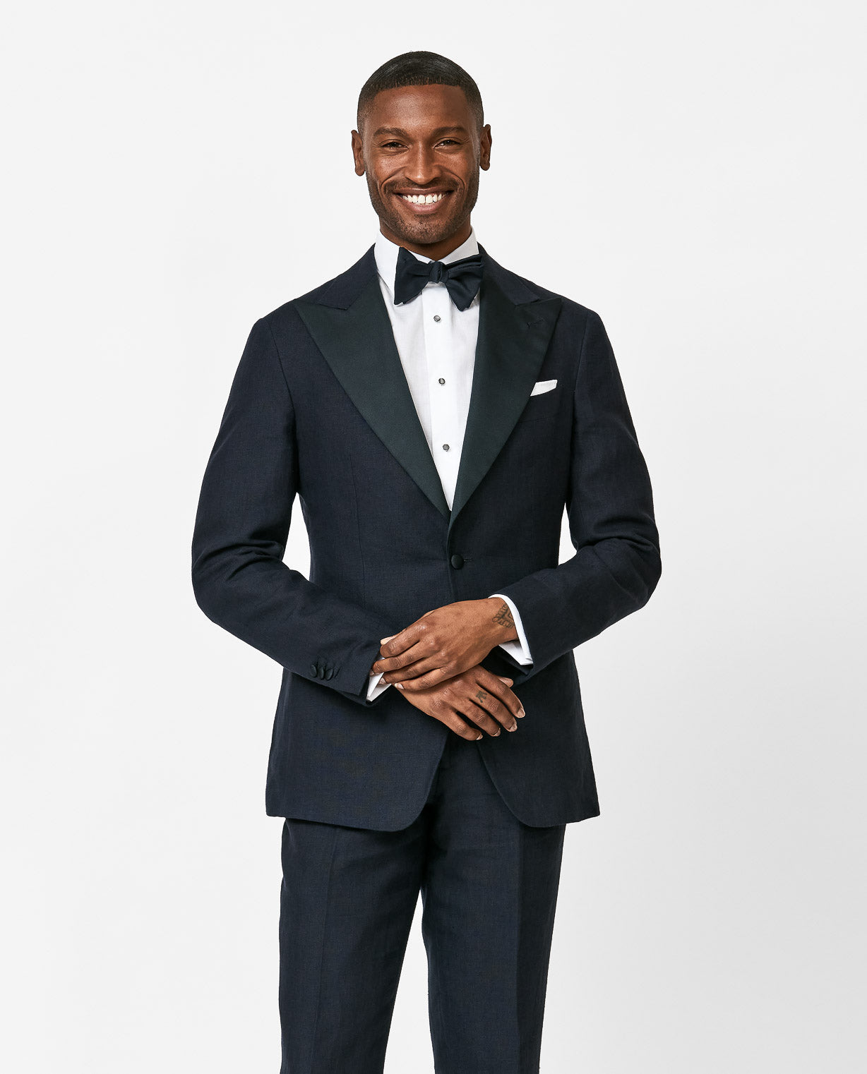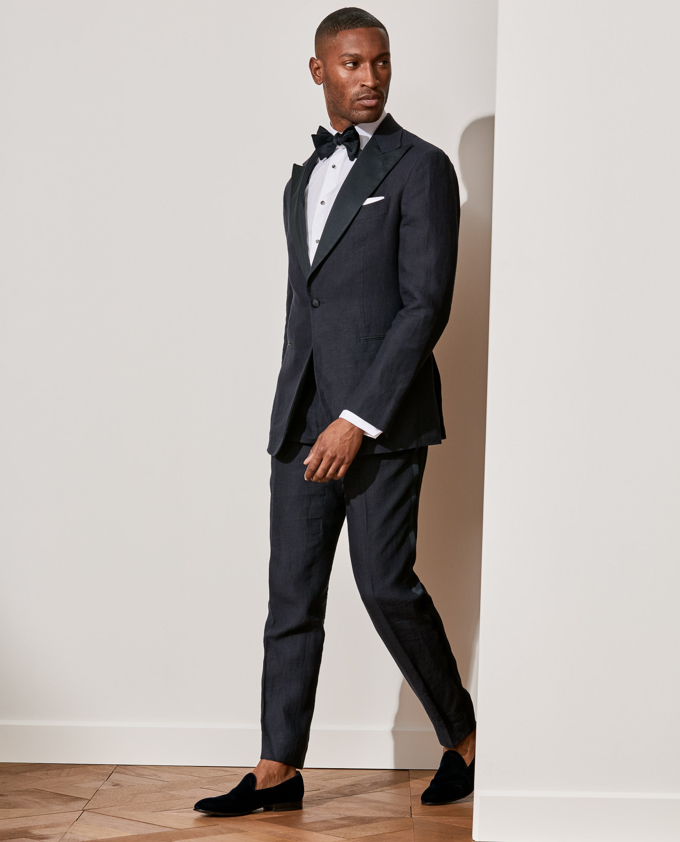 An effortlessly cool (and cooling) tuxedo for your elevated summer parties. This ensemble combines airy linen and blue hues for a summer take on modern black tie. Styled here with a white cotton-linen tuxedo shirt, ottoman bow tie, and velvet plain toe loafers in midnight blue.