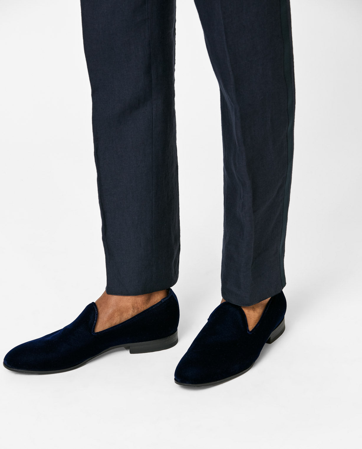 Navy linen tuxedo, bow tie, & velvet plain toe loafers
